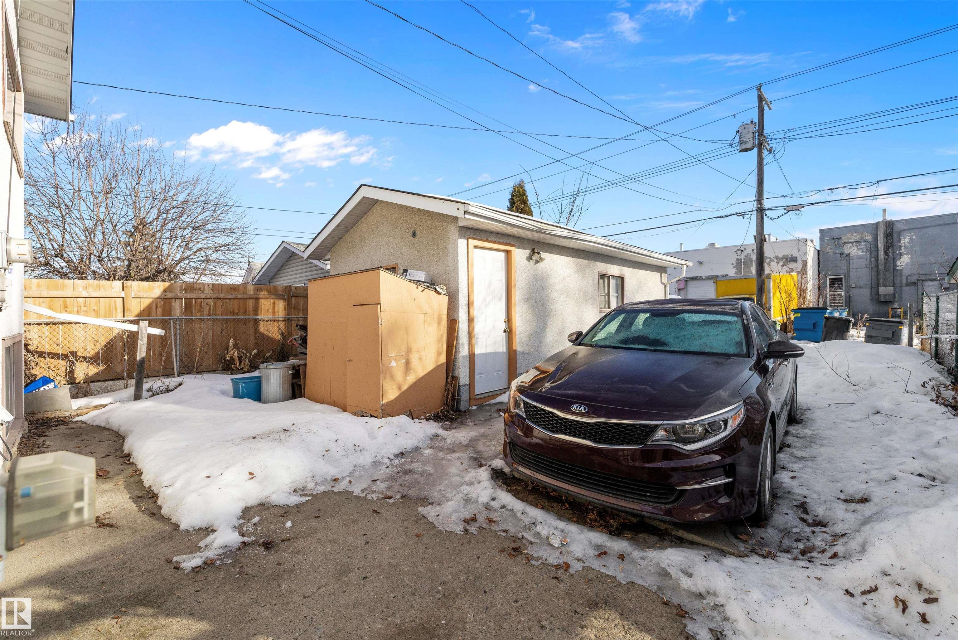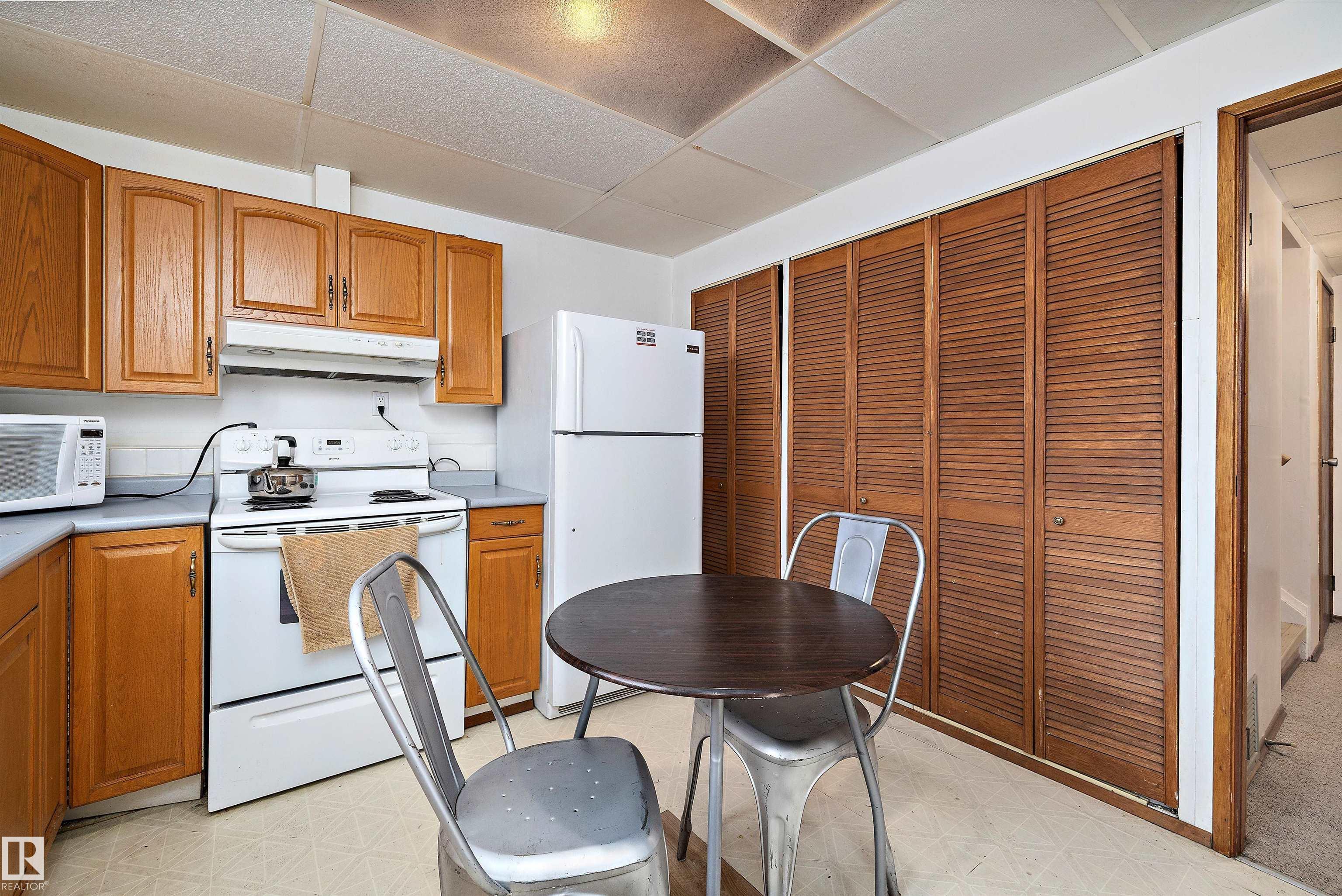 Welcome to this beautifully maintained 990 sq ft bi-level home featuring a fully finished basement for exceptional living space. The main floor offers an open-concept design with a bright, spacious living room showcasing gorgeous hardwood flooring throughout, seamlessly flowing into the adjacent dining area. The generous kitchen includes warm oak cabinetry and ample storage. This level also provides the primary bedroom, 2 sizable bedrooms and a full 4-piece bathroom. A separate side entrance leads to the fully developed basement, which includes a second kitchen, two additional bedrooms plus a den (easily convertible to a fifth bedroom), a large family room, another bathroom, laundry facilities, and a utility room. Outside, enjoy a single detached garage accessed via the back lane, along with a fully landscaped backyard. The property is ideally situated with easy access to bus routes, schools, NAIT, parks, shopping centres, and all essential amenities.