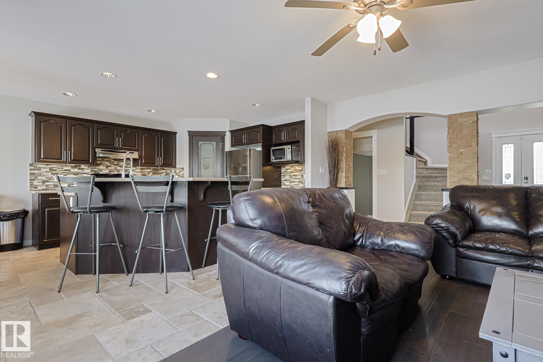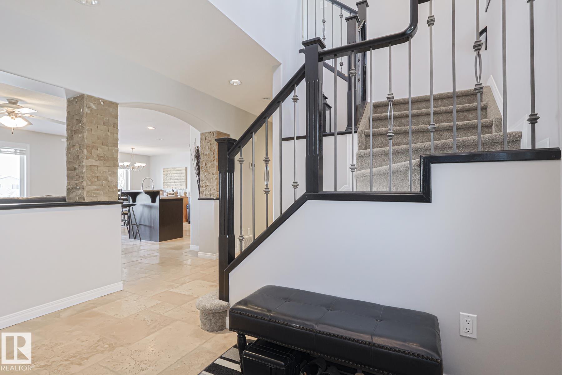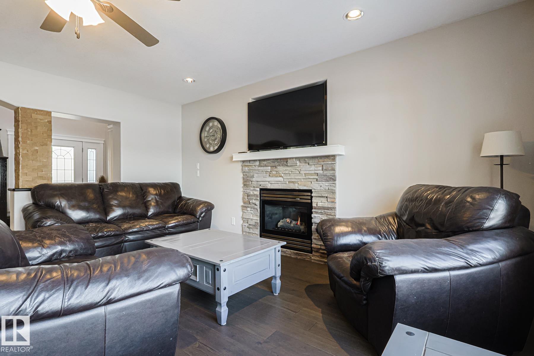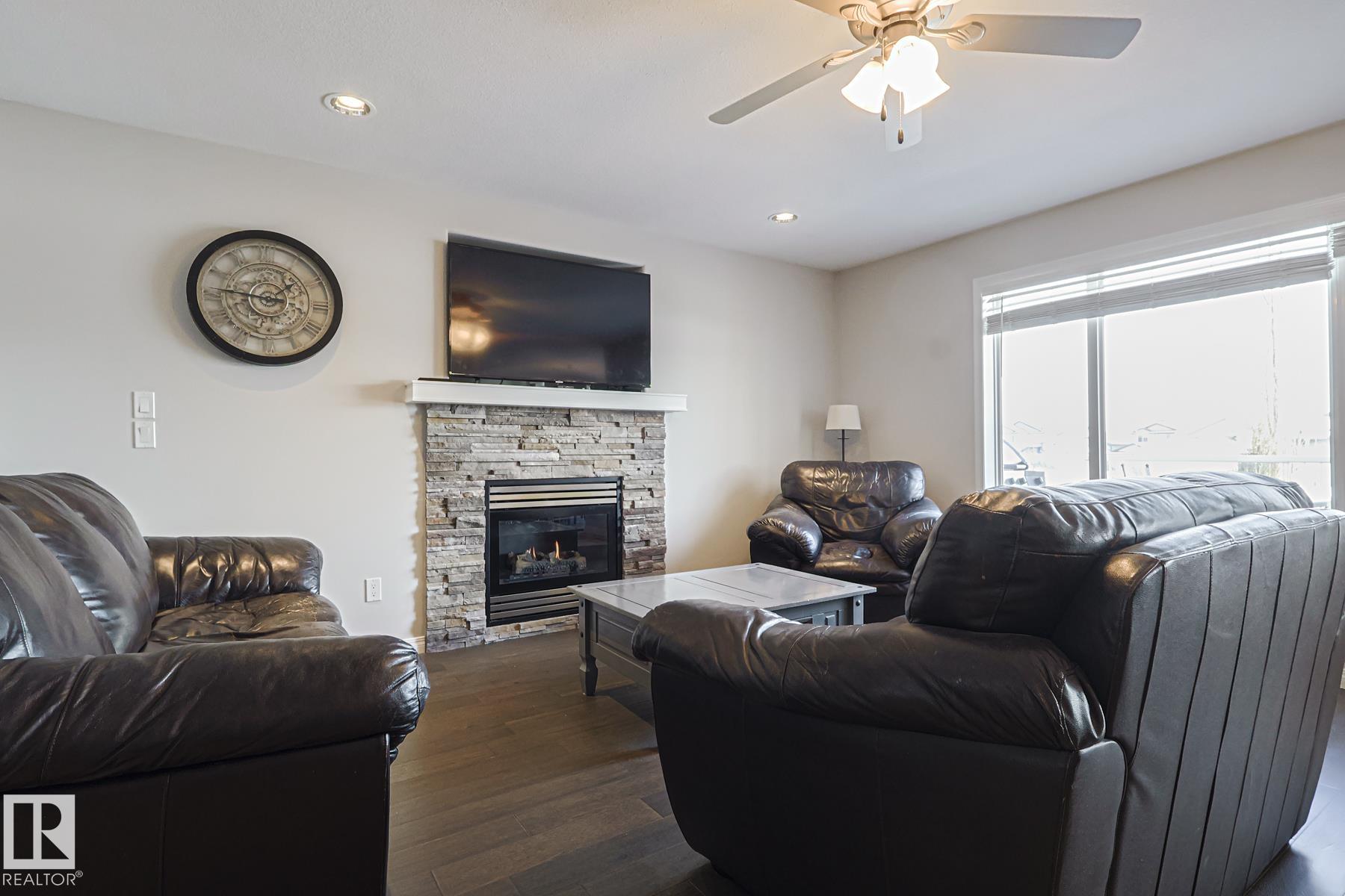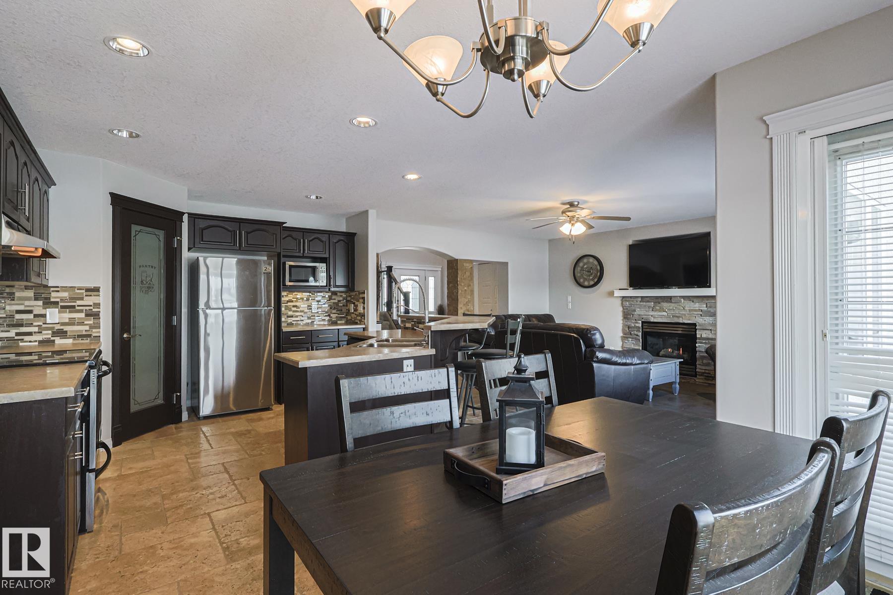 Welcome to this well-maintained home w/ DOUBLE ATTACHED GARAGE on a quiet street of the desirable Brintnell community. BACKING ON A GREEN BELT! Upon entry you are greeted with a high ceiling, beautiful ceramic floor & custom stonework pillars leading to an OPEN CONCEPT kitchen featuring convenient CORNER PANTRY, SS appliances, center island & plenty of mahogany-colored cabinets for all chef's needs. Next is the Living Rm w/ beautiful hardwood floor & cozy STONE-FACED FIREPLACE, plus the Dining Area! Bright windows offer great views of the COMPOSITE DECK w/ GLASS RAILINGS, yard & WALKING TRAIL behind. A 2pc bath completes the main floor. Up the stairs with iron spindles is the BONUS ROOM, PRIMARY/MASTER bedroom w/ ENSUITE bath featuring jacuzzi tub & brand-new GLASS SHOWER, 2 other bedrooms & another full bath. Basement waits final touches for a family room w/ its own gas fireplace, den & another bedroom. Steps away from parks and trails & minutes away from all shopping and A. Henday Dr. MUST-SEE!