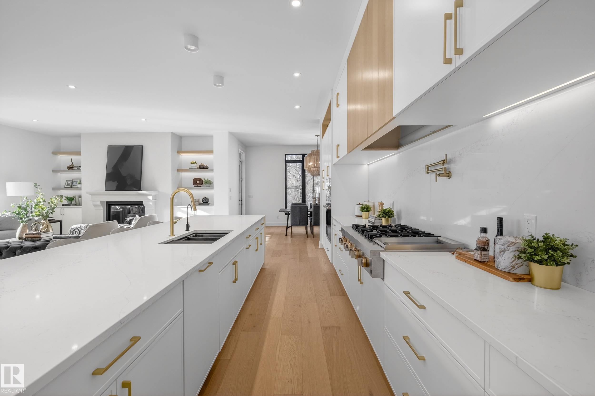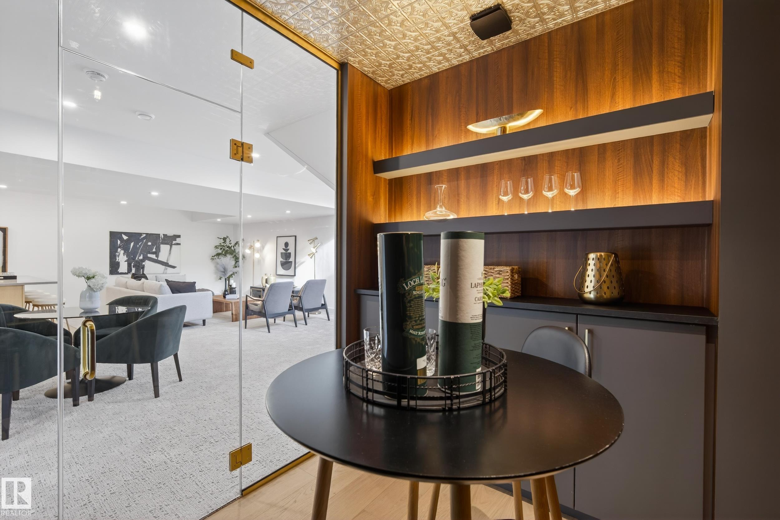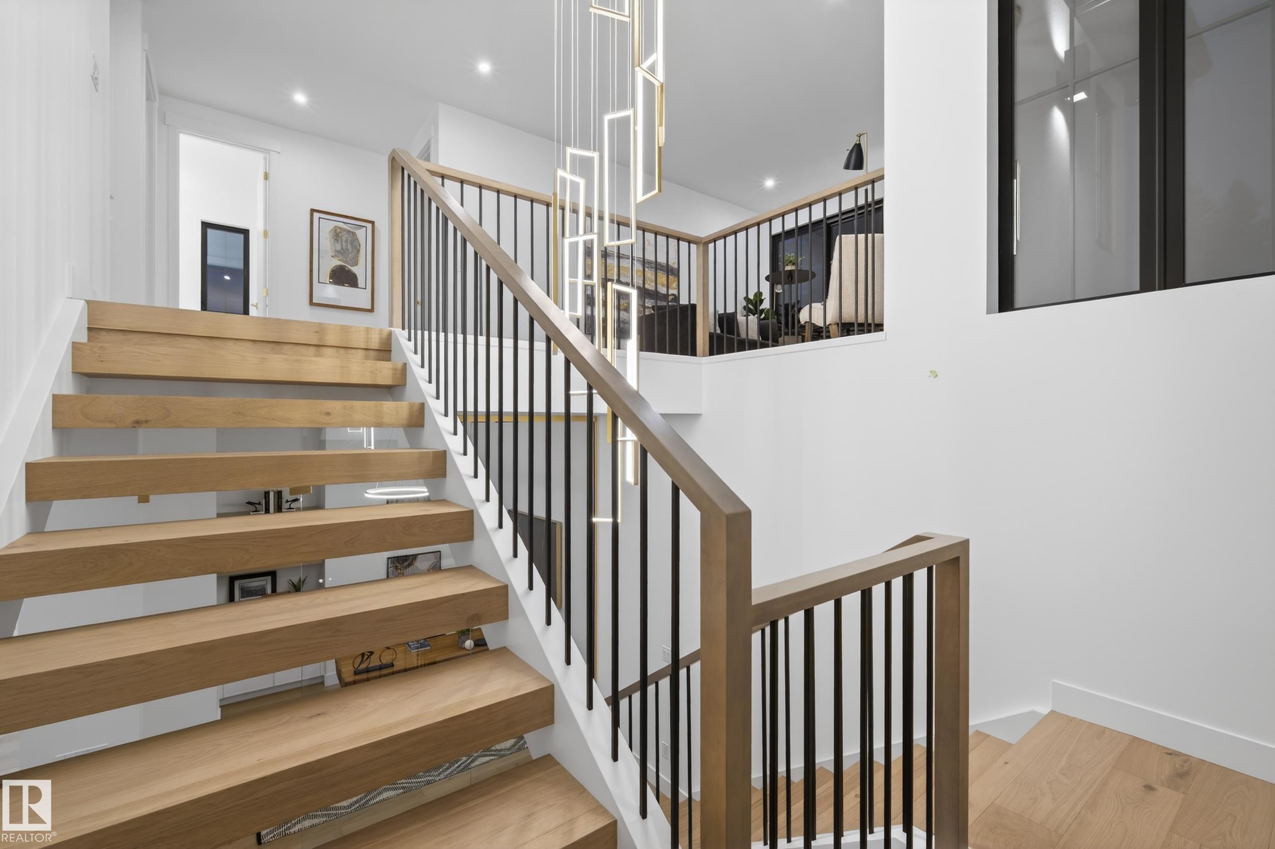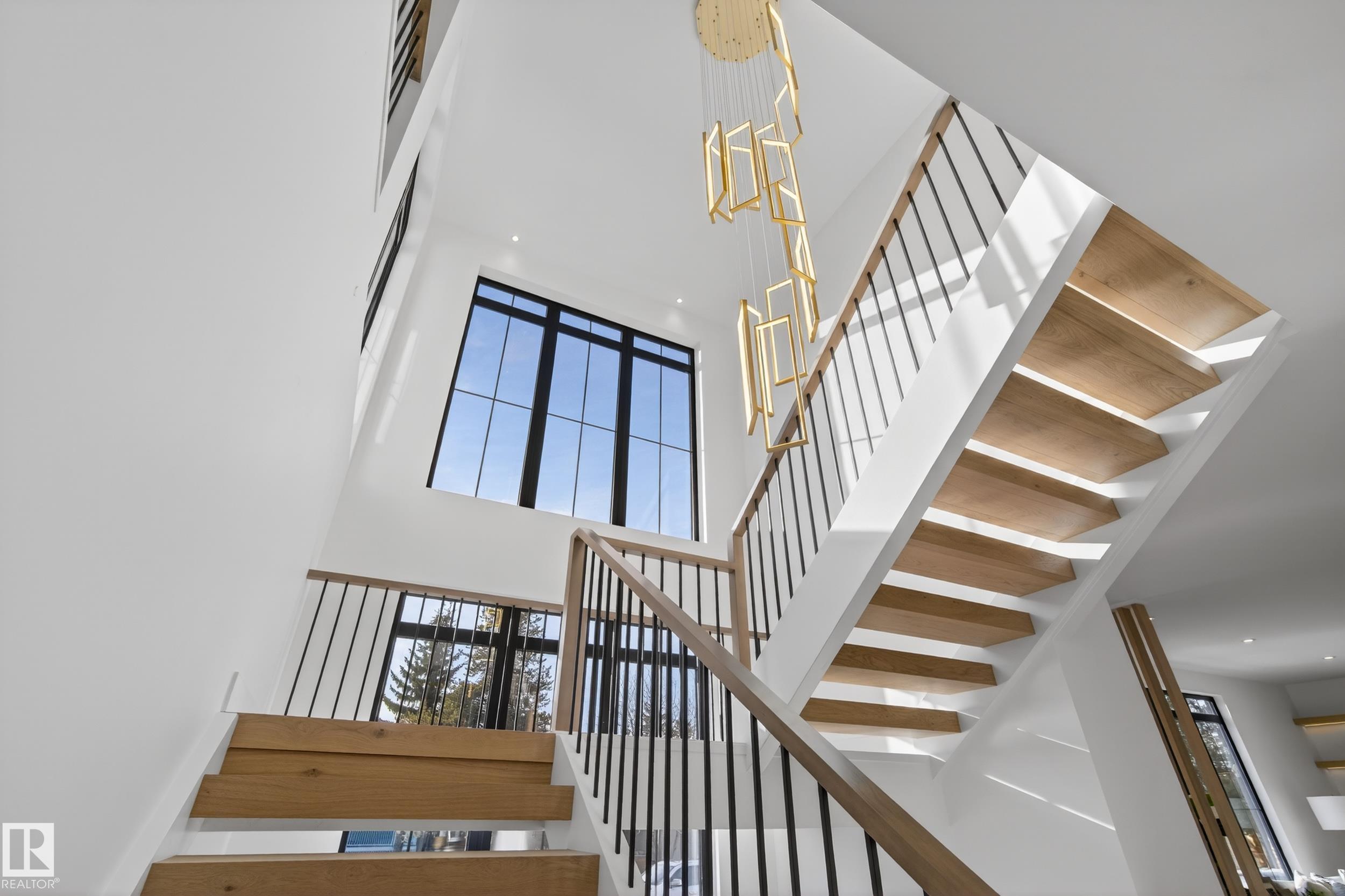 Architecturally striking luxury residence by Evolution Custom Homes showcasing refined design and exceptional craftsmanship throughout. Dramatic 10 ft ceilings, an open rise feature staircase, solid core 8 ft doors, drywall window returns and a statement 48 inch gas fireplace create an elevated main living experience. The chef's kitchen features white oak custom cabinetry, a premium JennAir and Miele integrated appliance package, a 14 ft dual waterfall island, full height quartz backsplash, butler's pantry and built in coffee station. A rare fumoir (cigar and brandy room) is professionally vented and roughed in for a humidor. The oversized heated garage is designed for enthusiasts with car lift capability, EV charging, workshop space, custom storage and hot and cold taps. Two private rooftop terraces offer integrated lighting plus gas and water rough ins, ideal for entertaining. A truly, one of a kind property in Edmonton's most elite, river-valley neighbourhoods.