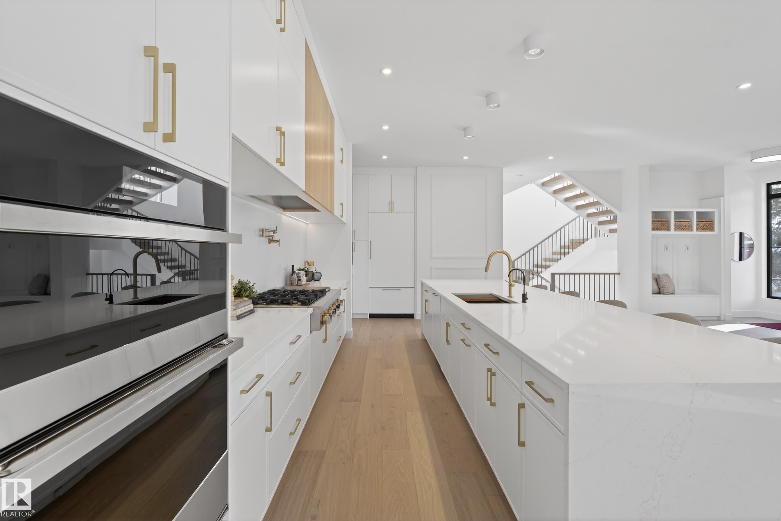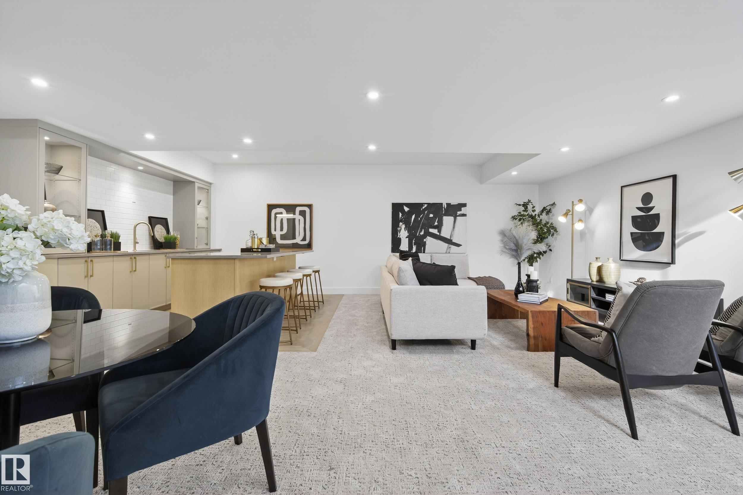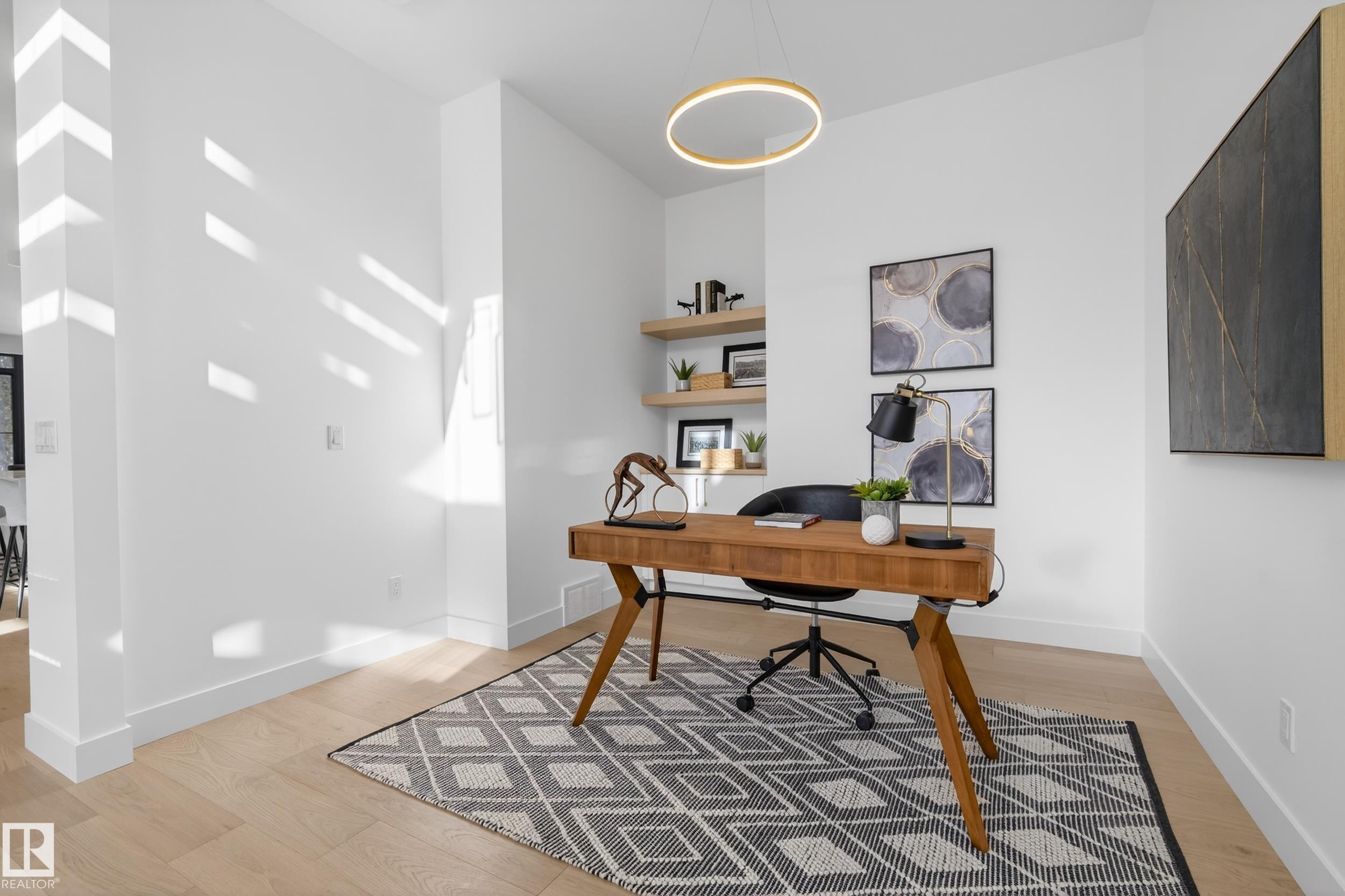 Architecturally striking luxury residence by Evolution Custom Homes showcasing refined design and exceptional craftsmanship throughout. Dramatic 10 ft ceilings, an open rise feature staircase, solid core 8 ft doors, drywall window returns and a statement 48 inch gas fireplace create an elevated main living experience. The chef's kitchen features white oak custom cabinetry, a premium JennAir and Miele integrated appliance package, a 14 ft dual waterfall island, full height quartz backsplash, butler's pantry and built in coffee station. A rare fumoir (cigar and brandy room) is professionally vented and roughed in for a humidor. The oversized heated garage is designed for enthusiasts with car lift capability, EV charging, workshop space, custom storage and hot and cold taps. Two private rooftop terraces offer integrated lighting plus gas and water rough ins, ideal for entertaining. A truly, one of a kind property in Edmonton's most elite, river-valley neighbourhoods.