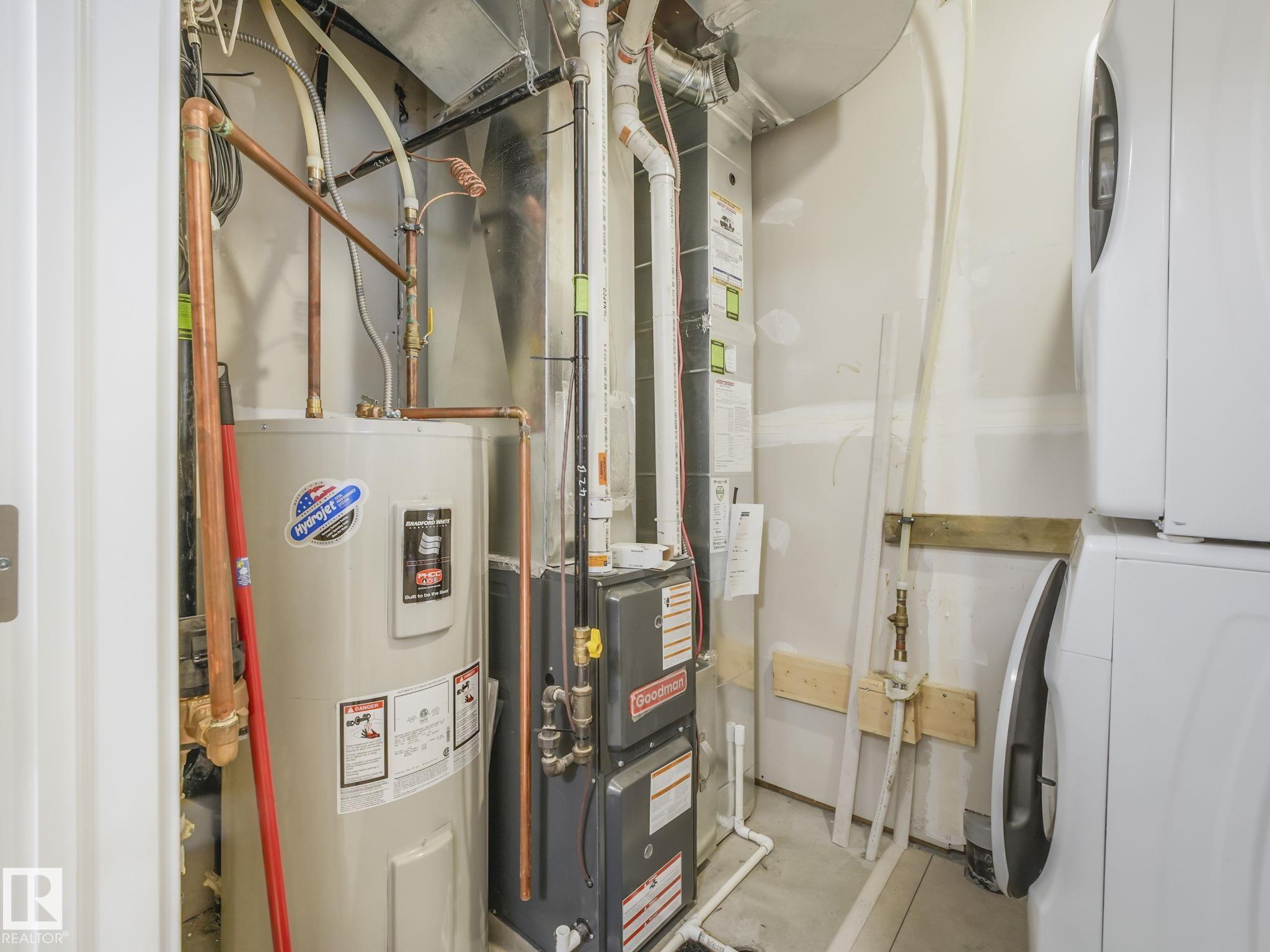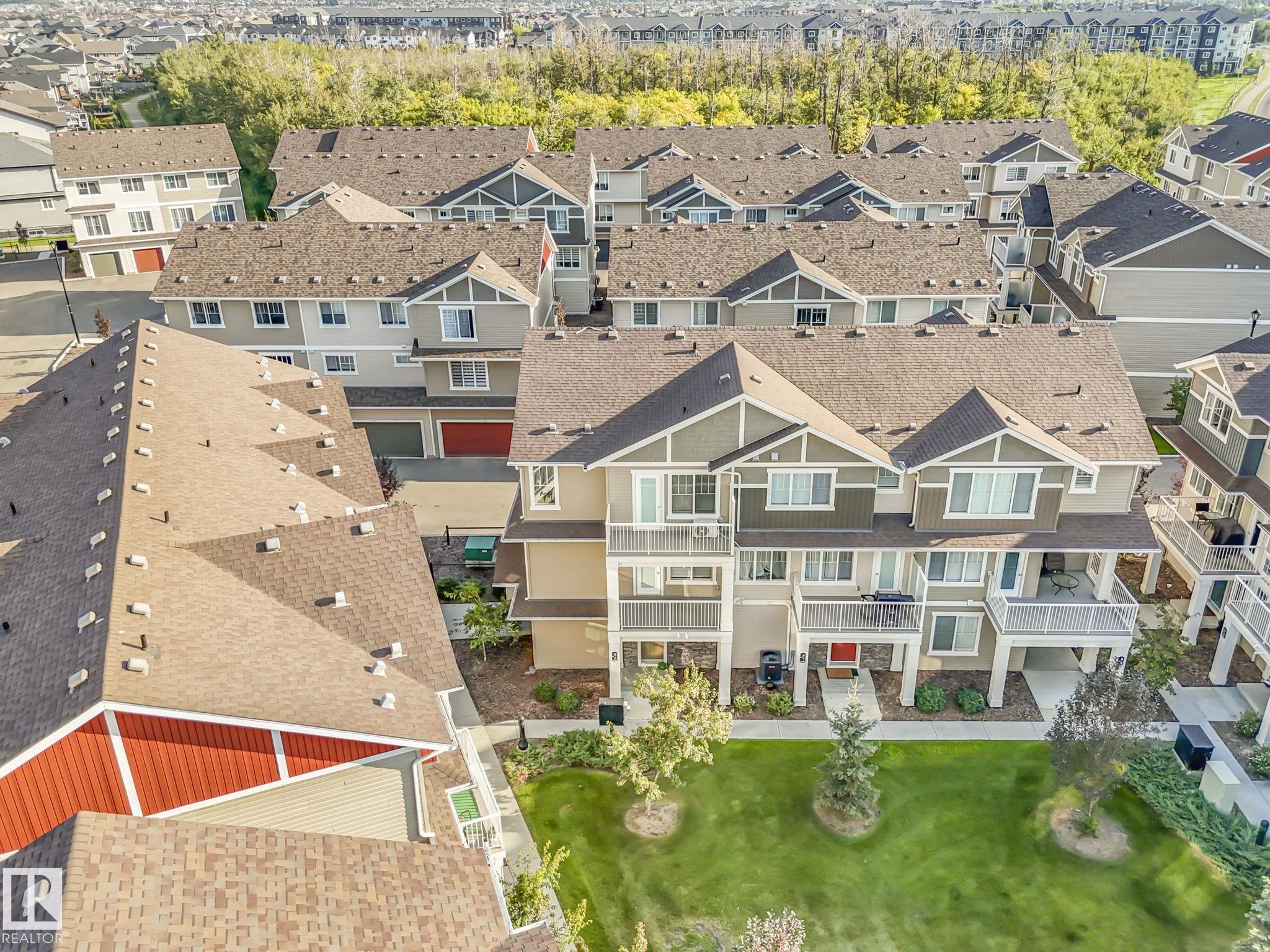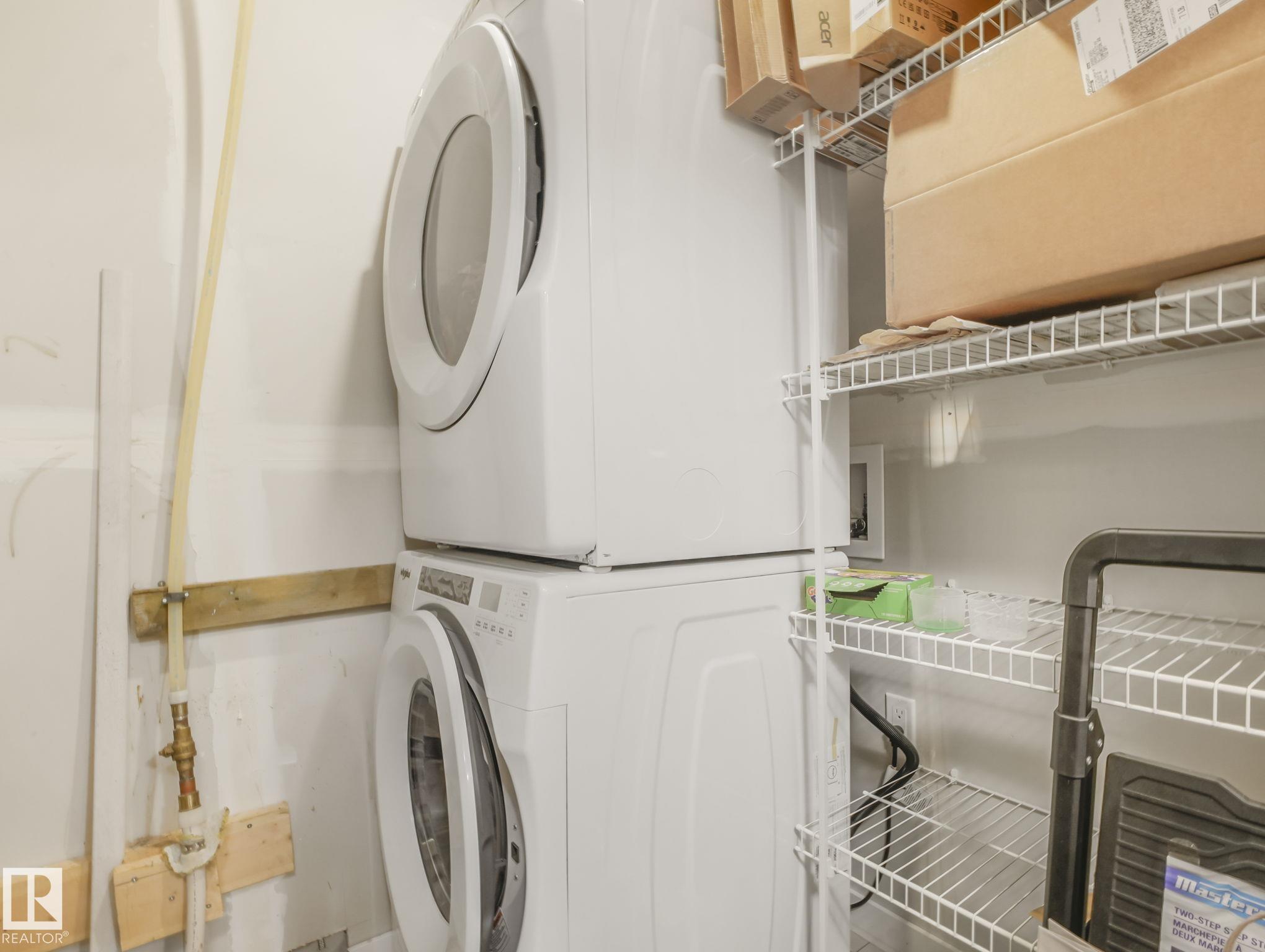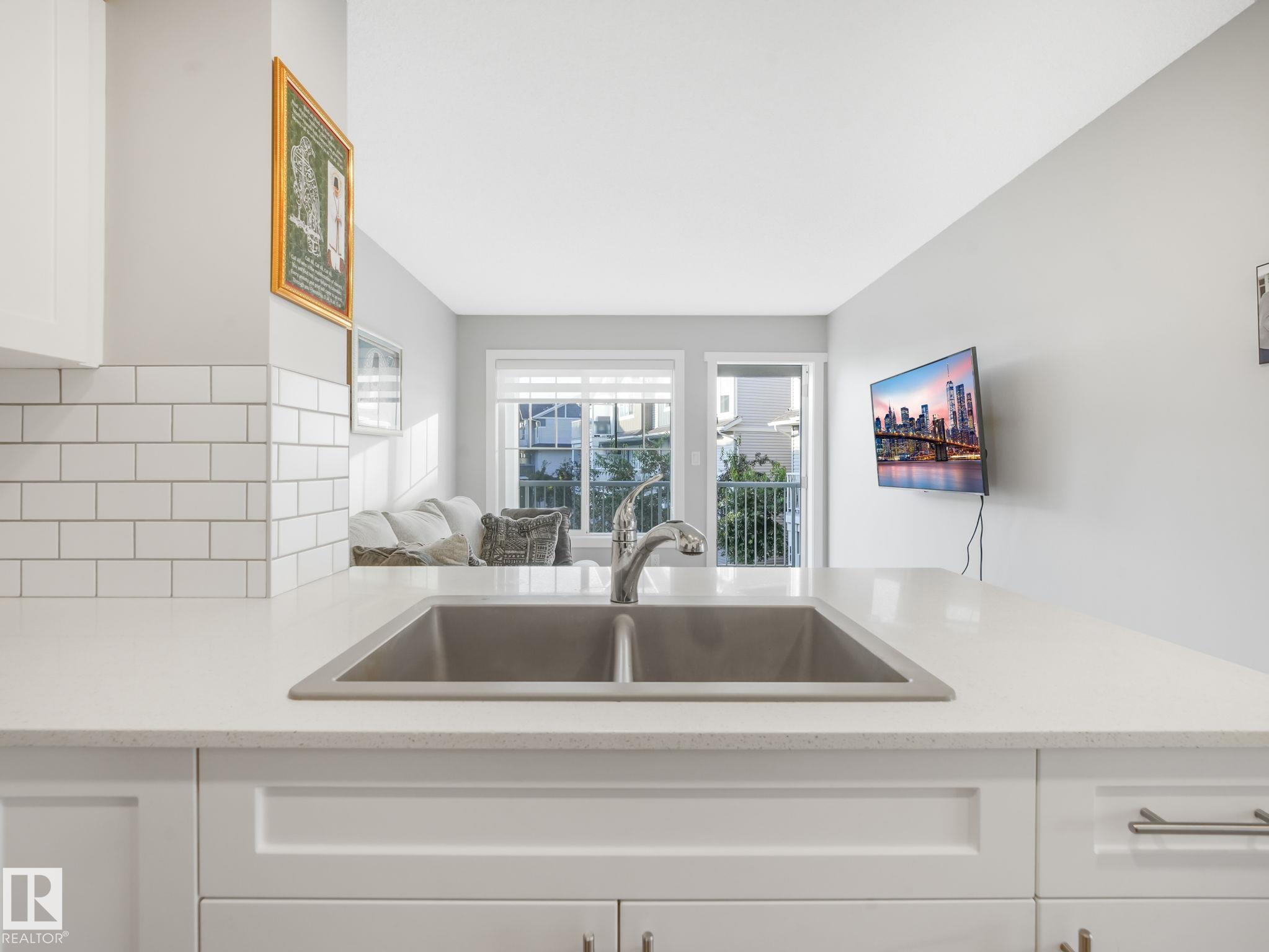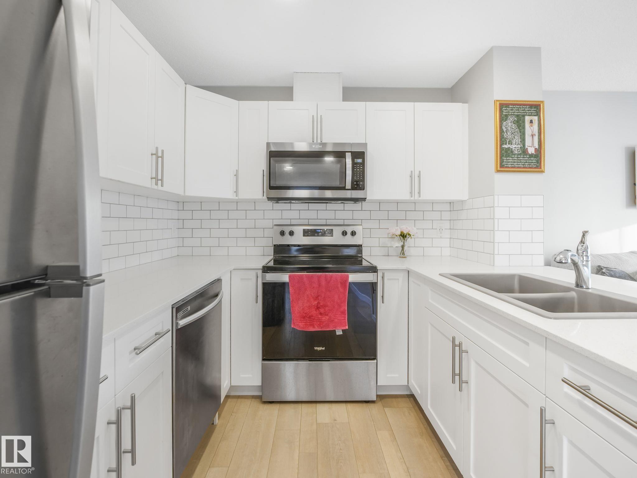 This extremely clean & thoughtfully designed 1 bedroom townhouse offers an open-concept layout that features a spacious all white kitchen with quartz countertops, stainless steel appliances, full backsplash, and plenty of cabinetry, seamlessly flowing into a bright living room with large windows. Step outside to the deck with a vinyl surface and sleek glass/aluminum railing--perfect for relaxing or entertaining. The primary bedroom includes a walk-in closet and easy access to a 4-piece bathroom. Additional highlights include an enclosed laundry room with a stackable washer/dryer, modern finishes throughout with vinyl plank flooring, custom window coverings, plus included appliances for your convenience. The single attached garage is perfect for your car in the winter months. Close to all types of amenities, schools & easy access to public transport. Enjoy low-maintenance living with professional landscaping, visitor parking on site, and condo fees of just $155/month.