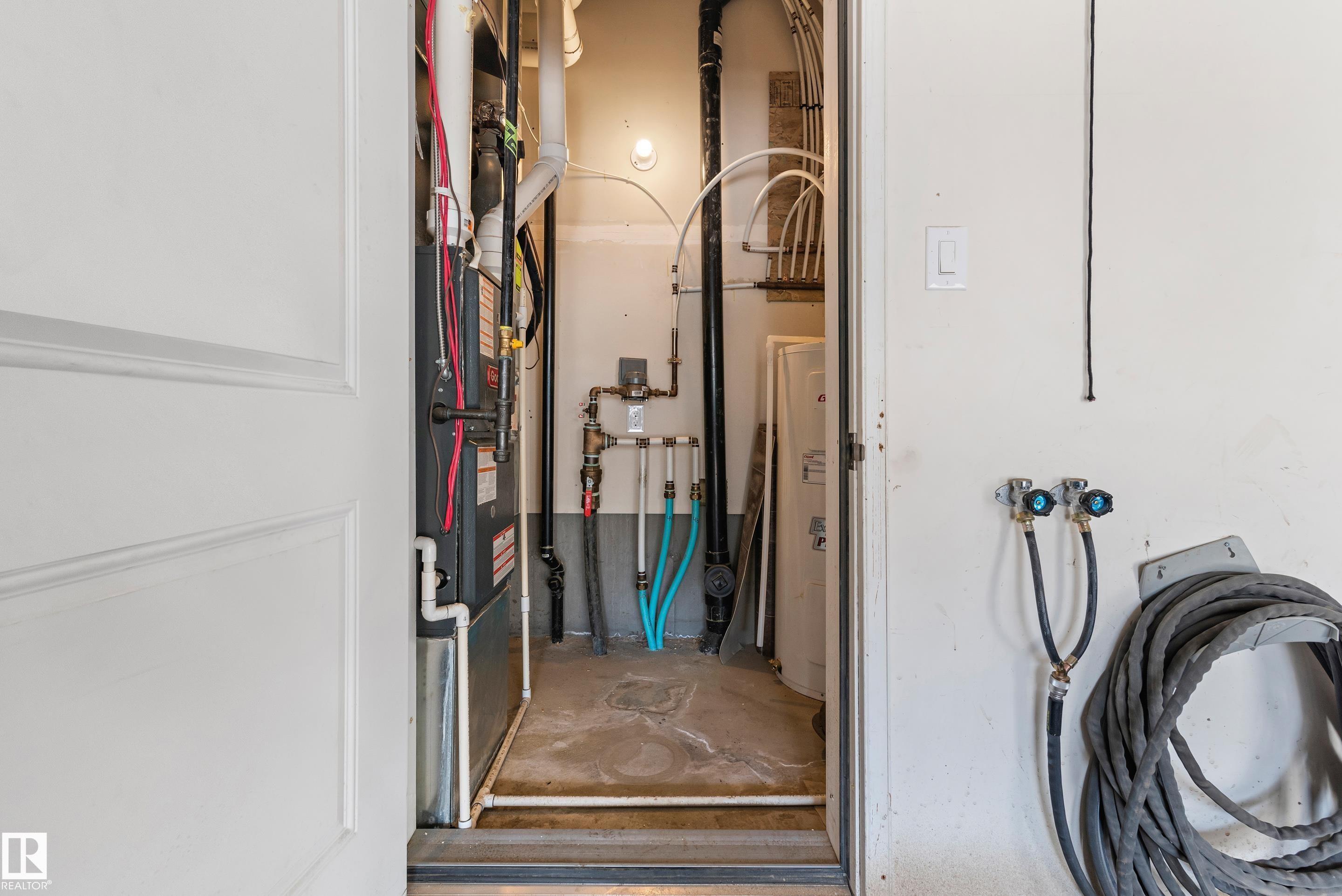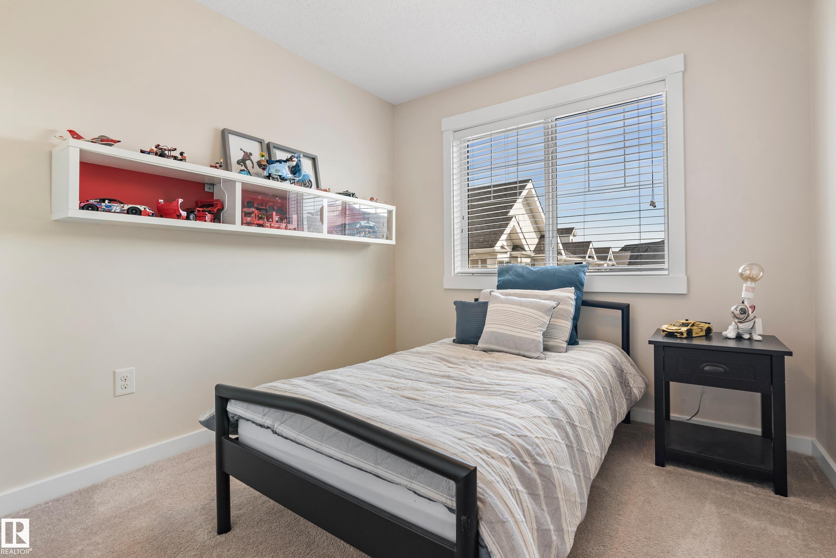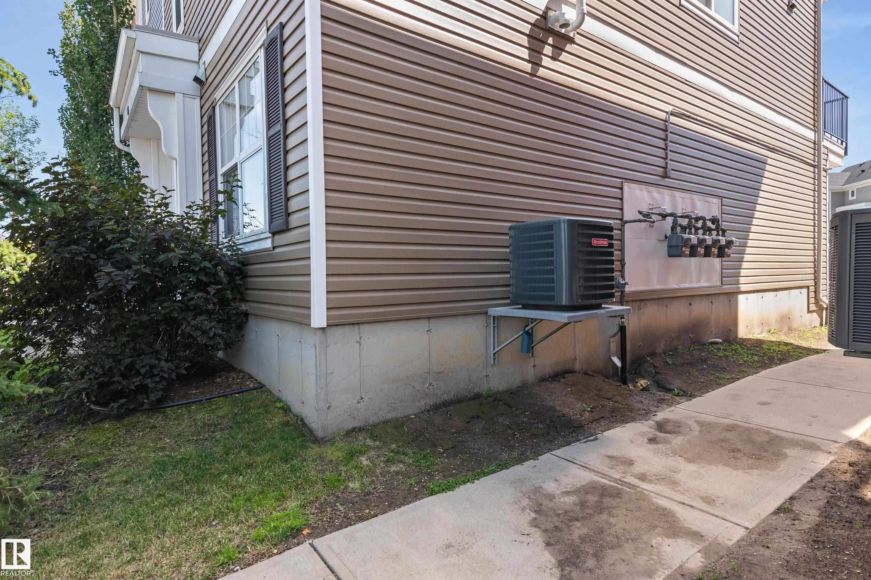 Welcome to this lovely 3-bedroom, 2.5 bath, double attached garage end unit townhome. Located in a great family area across from a pond in Crystallina. Easy access to Anthony Henday, CFB Edmonton, shops and restaurants. This nicely maintained townhouse has A/C, which comes in handy for those hot summer days. Other notable features are 9 ft ceilings on the main floor, beautiful kitchen cabinets, quartz countertops, spacious open bright floor plan, dining room, living room with electric fireplace, vinyl plank floors, and ceramic tiles in the 2 pc bath. Stainless steel appliances, spacious deck with gas line for BBQ, and central vac. The upper level has 3 good size bedrooms with a 4 pc bath and a 3 pc ensuite and a walk-in closet. Carpet and ceramic floors in bathrooms and a stackable front load washer/dryer. The double attached garage is drywalled, insulated, and has 11 ft ceilings.