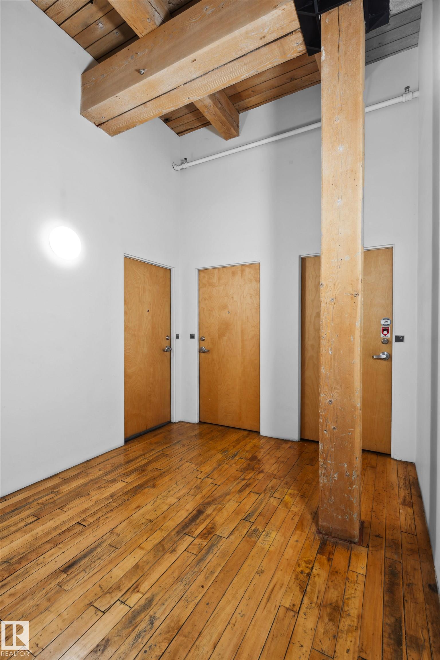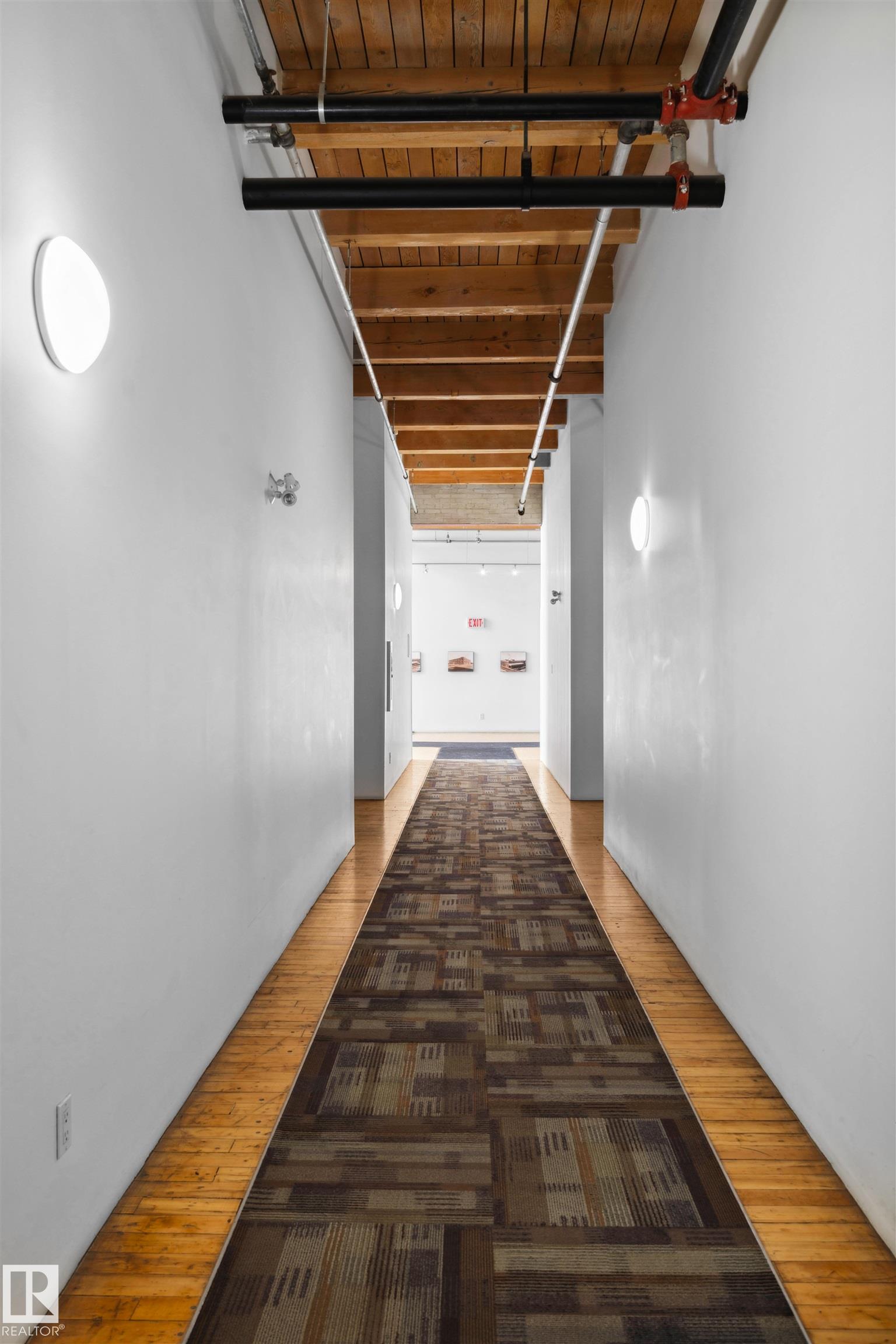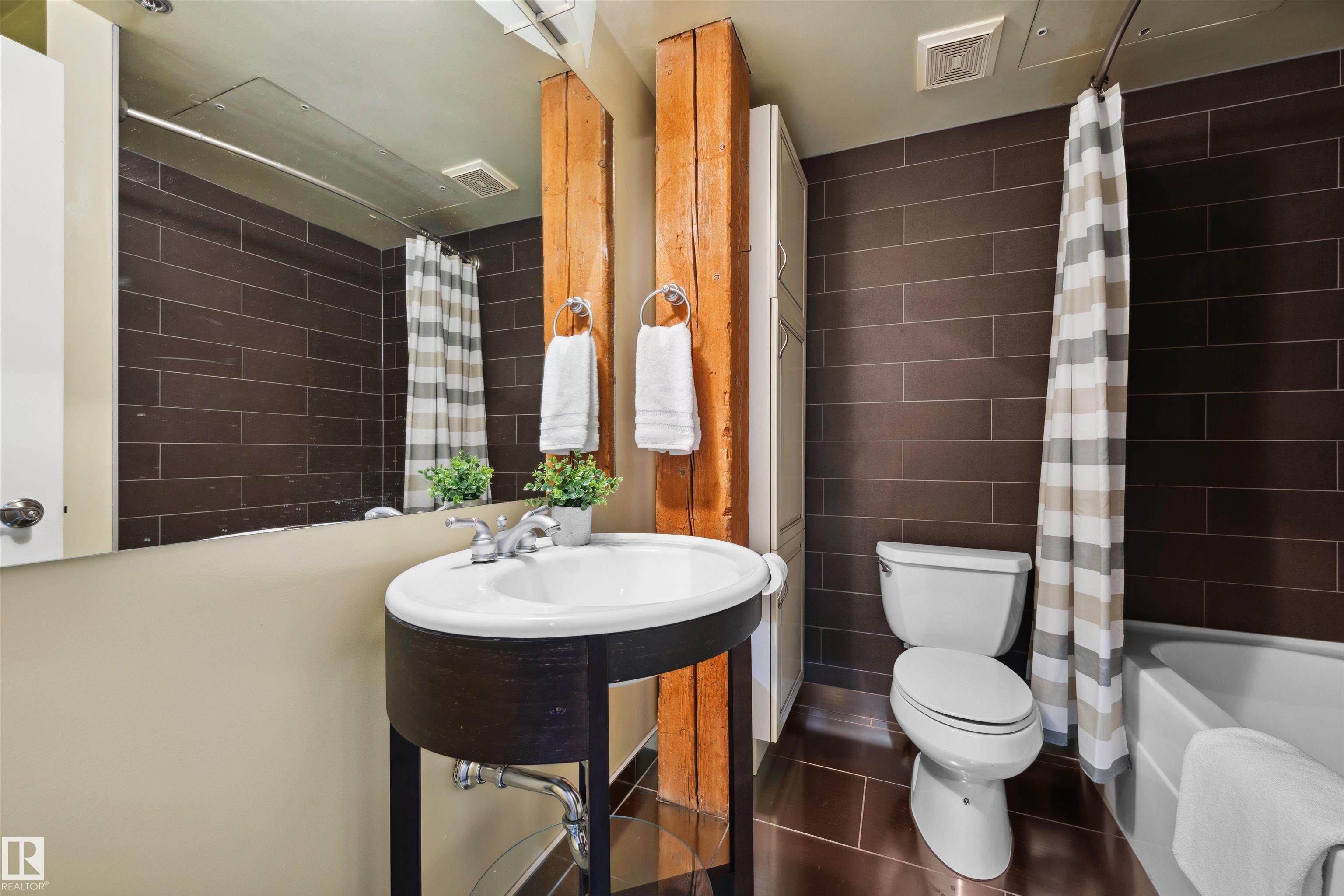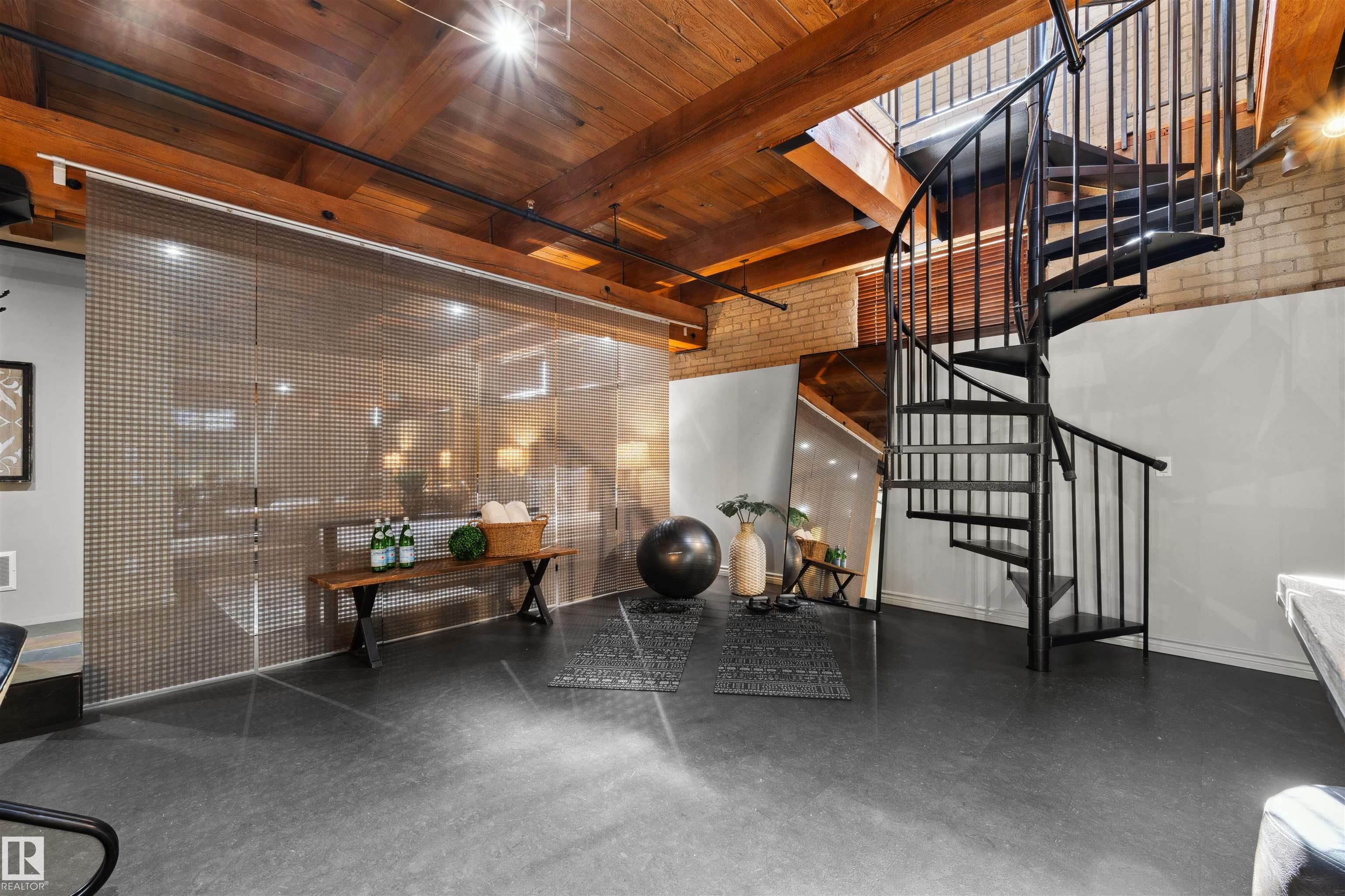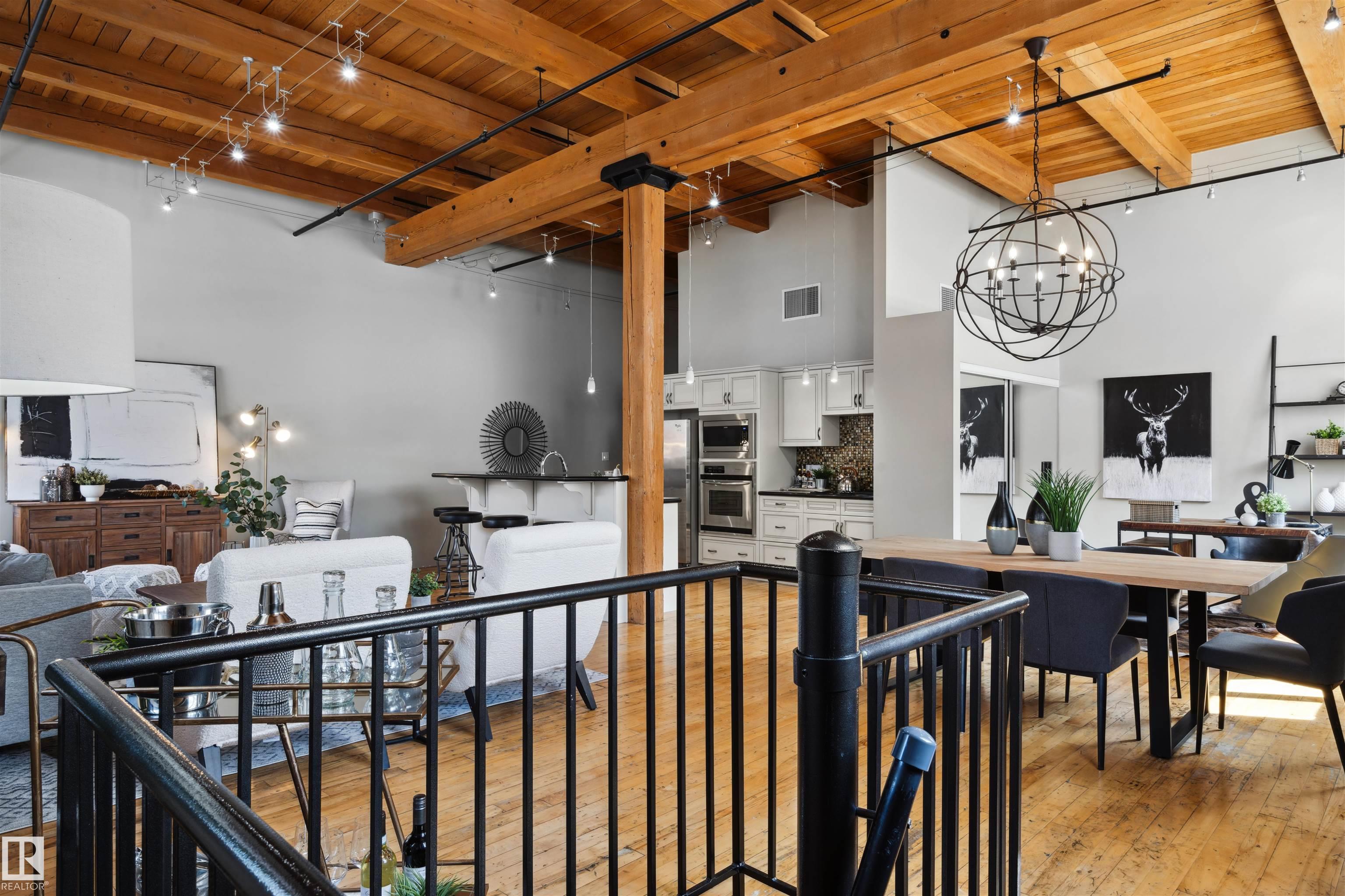 Style+elegance welcomes you to this upscale 2-story loft,rich in history+located in the historical John Deere Building.The industrial chic design boasts the original soaring cedar ceilings,exposed brick walls,fir beams+maple hardwood floors.This bright corner unit offers over 1900sqft of living space.The renovated kitchen is timeless w/classic cabinets,granite counters,mosaic backsplash,s/s appliances,eating bar+dining area.The main floor has a spacious open concept w/living room,studio space,4pc bath+a metal spiral staircase to below.The lower level offers the primary bedroom,second living room,flex space for a den or exercise area,4pc bath+second entrance.Other features include:A/C,laundry+underground parking.Located in one of the most vibrant areas in the heart of downtown+surrounded by AMAZING restaurants, entertainment+shops.Enjoy an URBAN lifestyle right out your front door+only steps to the Ice District,Rogers Arena,MacEwan,104 Street,the River Valley+LRT.Urban living has never felt so FABULOUS!