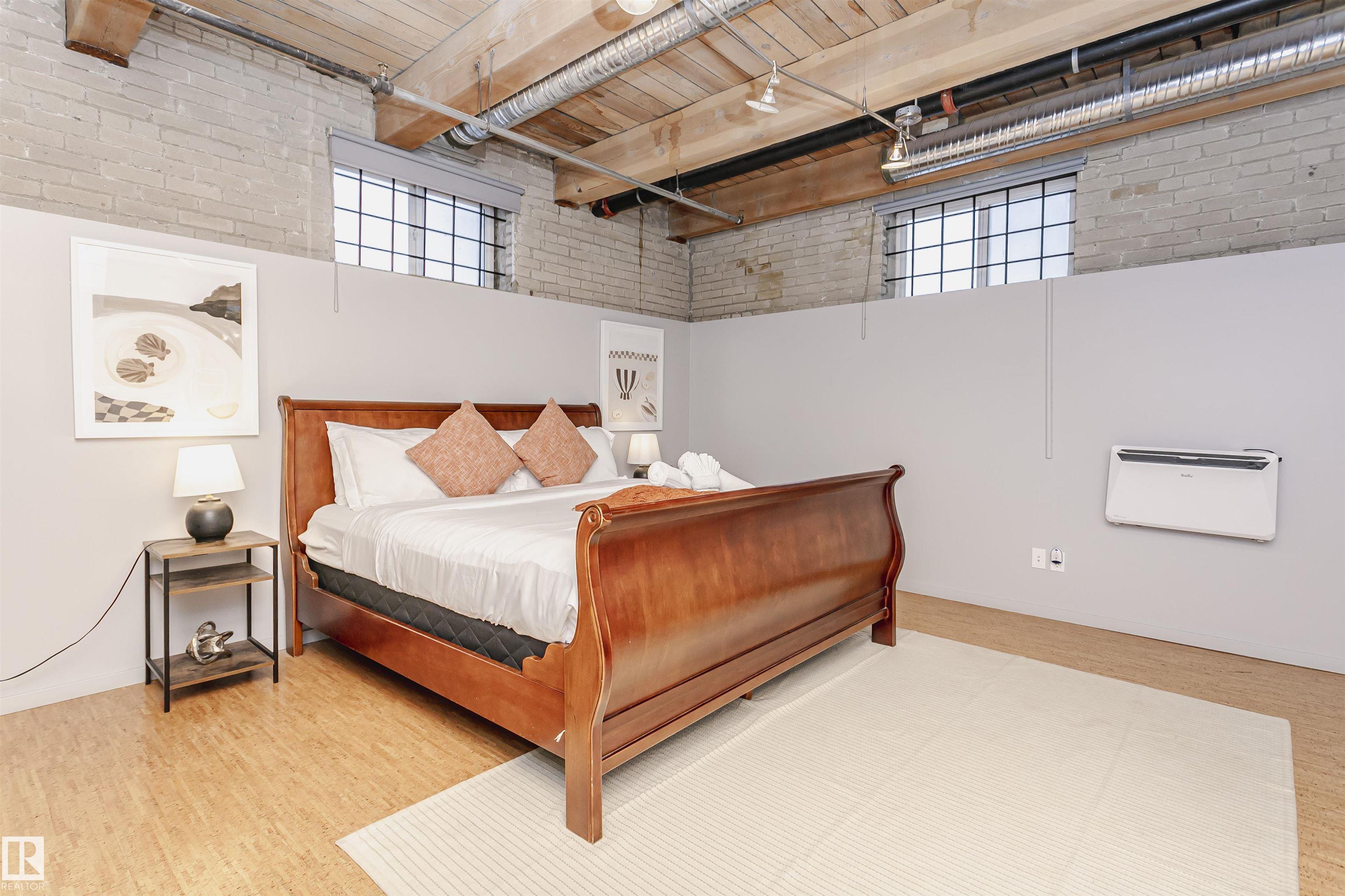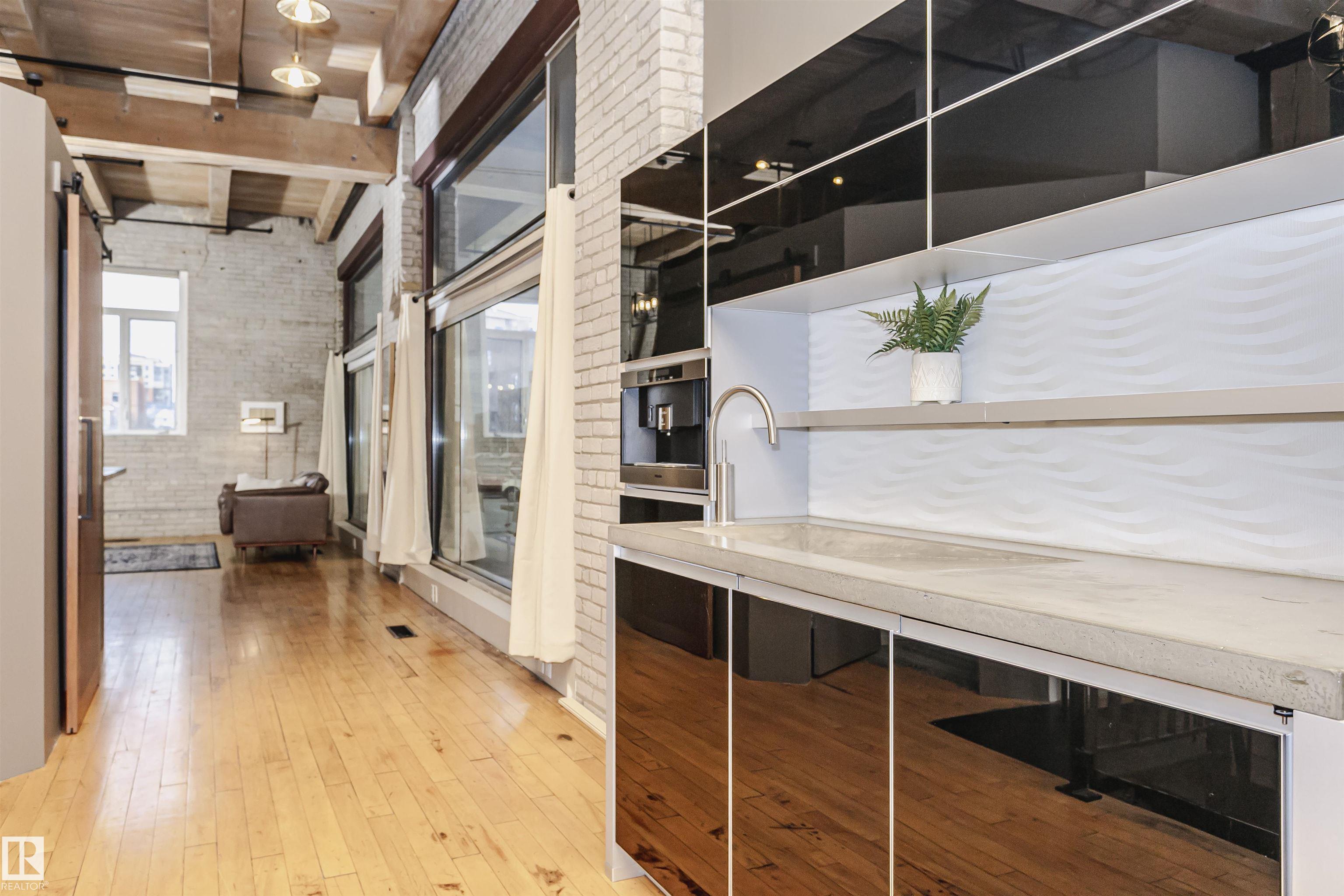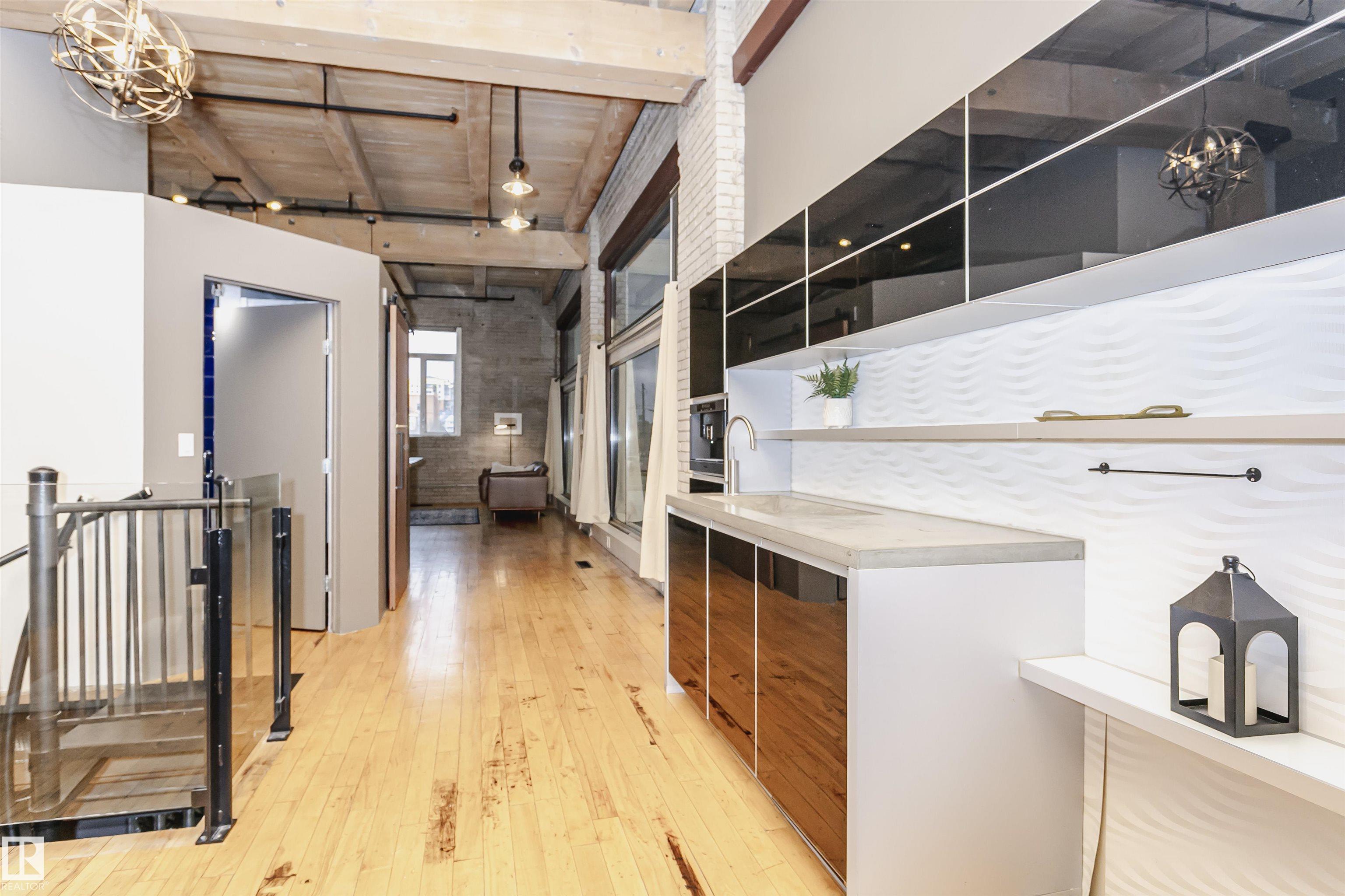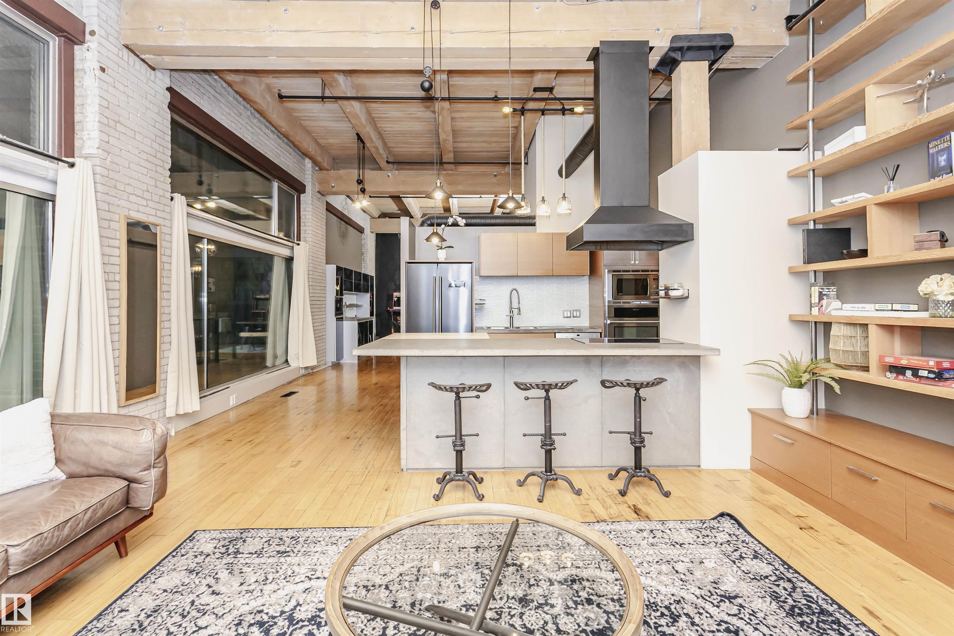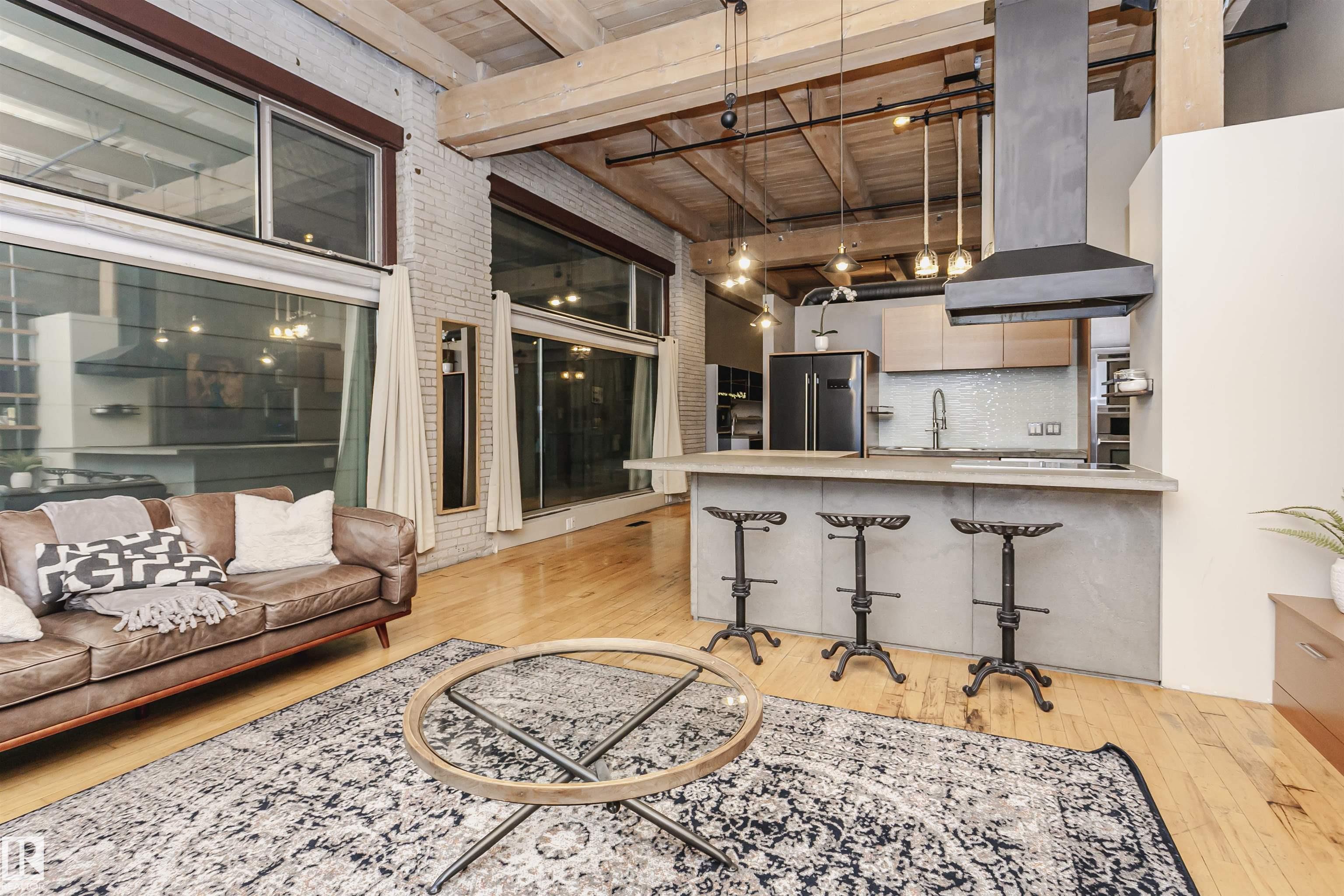 HERITAGE MEETS MODERN IN THE ICONIC JOHN DEERE SEVENTH STREET LOFTS! Discover a rare blend of Edmonton history and contemporary design in this stunning loft, set within the heritage side of the historic John Deere Building--one of Downtown's most recognizable architectural conversions. If you're craving something truly unique, this urban sanctuary delivers. Spanning 1,776 sq. ft. over two dramatically designed levels, this loft embraces its industrial roots with exposed brick, original concrete elements, 13-foot ceilings, and beautiful hardwood floors. The spacious open layout features 2 bedrooms, 2 full bathrooms, and in-suite laundry, all wrapped in authentic character you won't find in newer builds. The kitchen blends style with function, showcasing concrete countertops, modern cabinetry, and a layout perfect for entertaining. Enjoy the convenience and comfort of heated, secure underground parking--a must in downtown living. Located steps from Rogers Place, Ice District, and Farmers Market. WELCOME HOME.