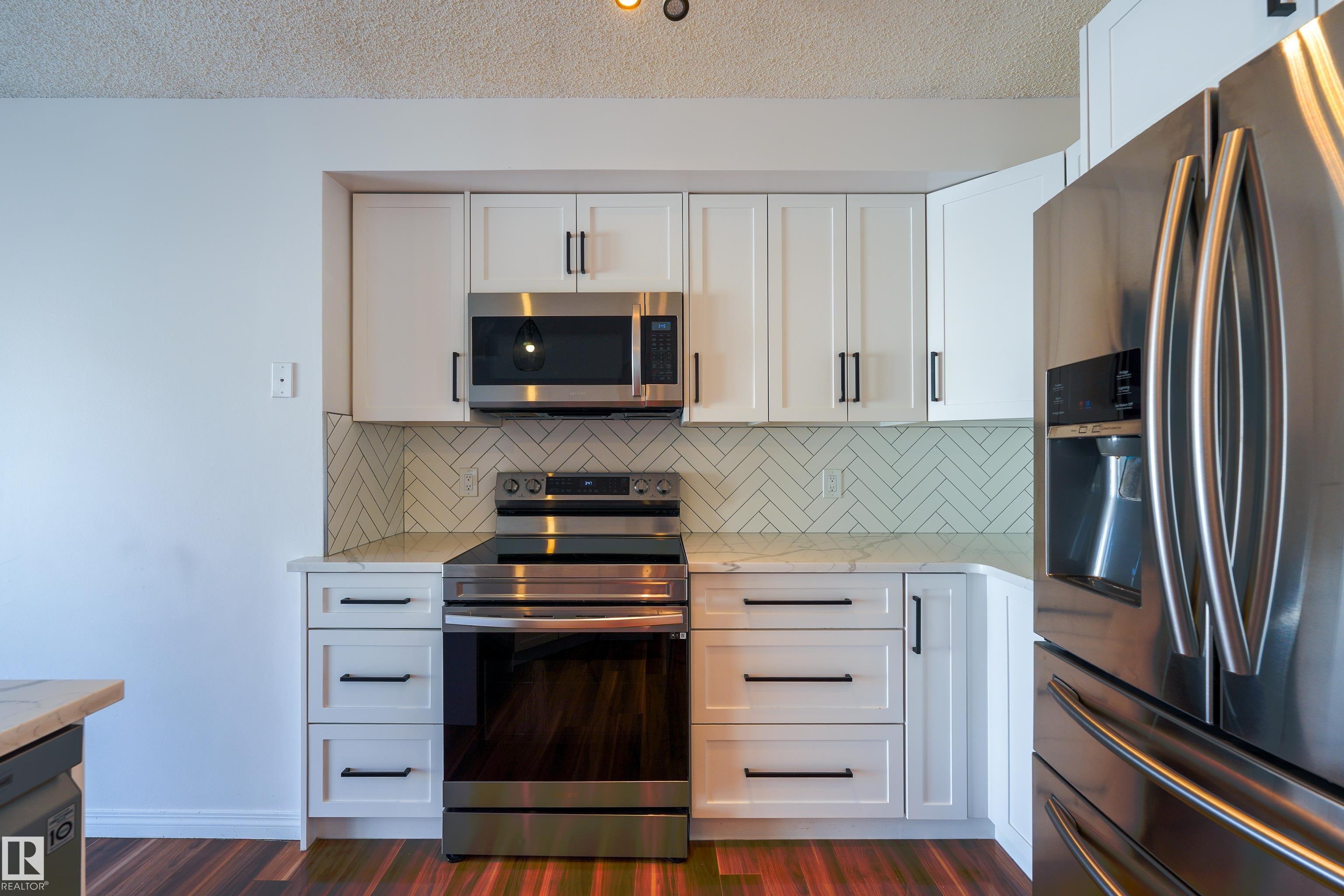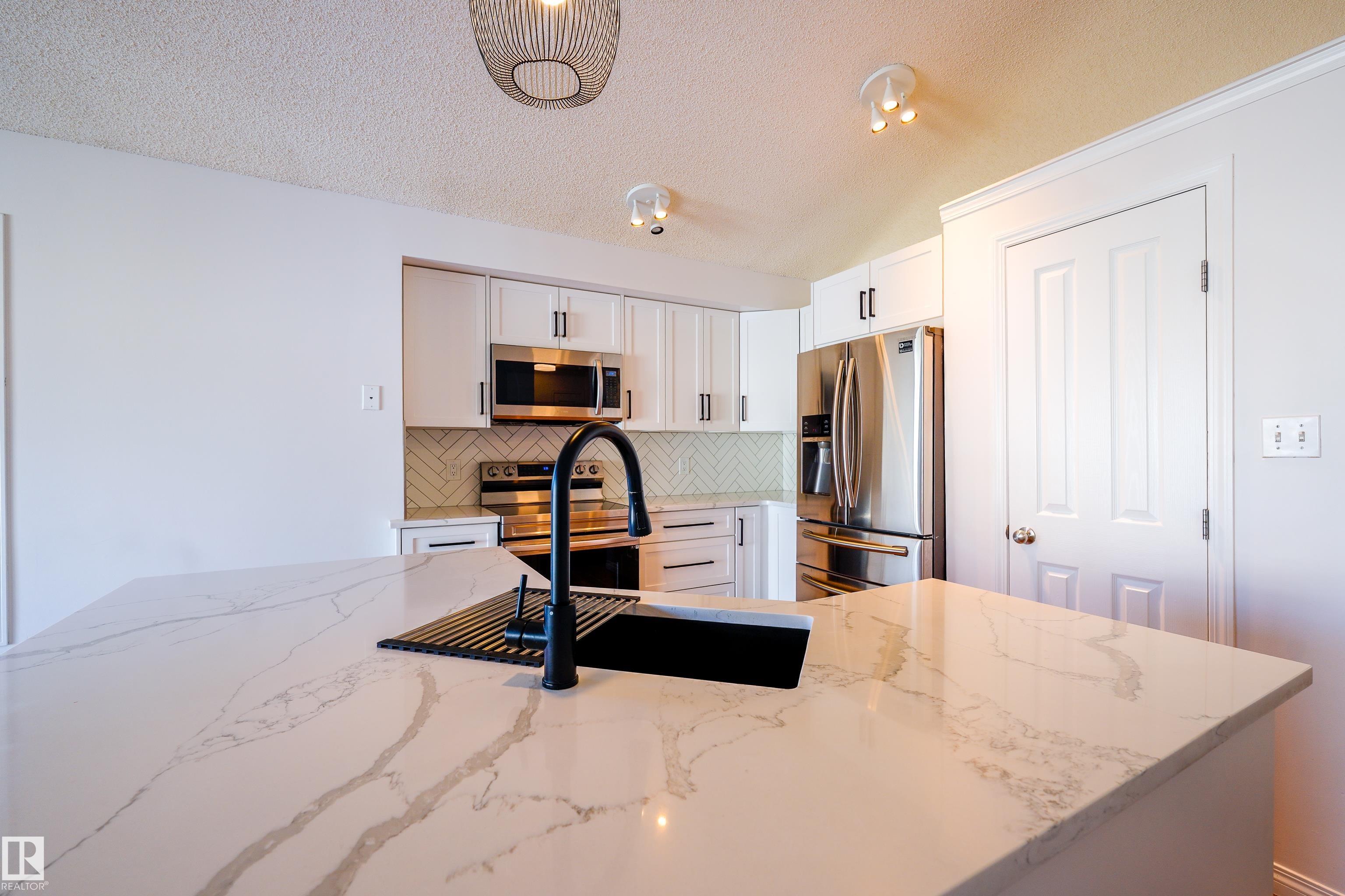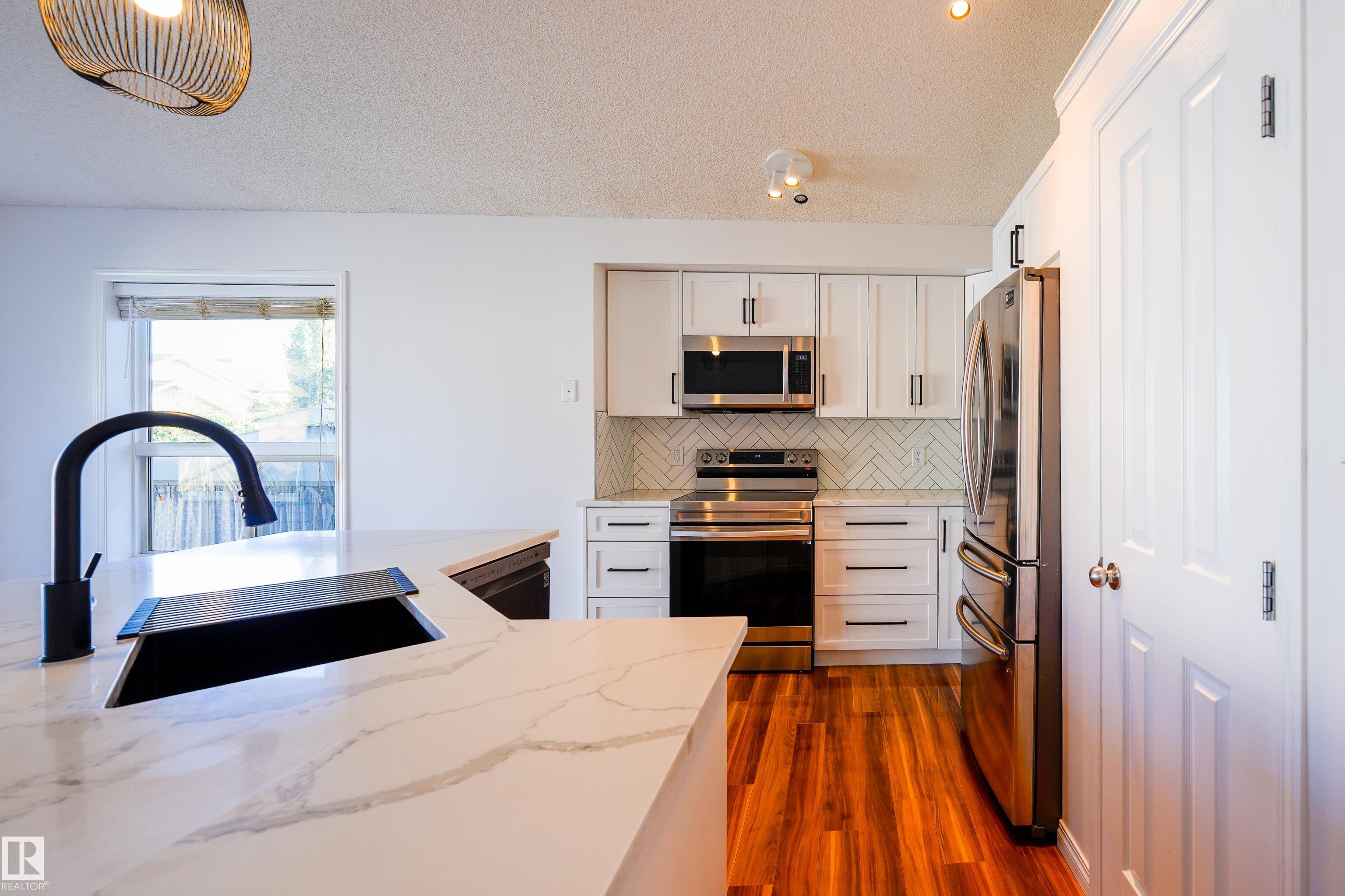 BEST VALUE HOME IN ELLERSLIE... RENOVATED KITCHEN, 4 BED, 3 BATHS, UPDATED ENSUITE, FINISHED BASEMENT & DOUBLE GARAGE with A/C! This stylish BI-LEVEL home in Ellerslie is perfect for a growing family with space, comfort, and upgrades galore. Cook like a pro in the modern kitchen with quartz counters, black faucet and hardware, white cabinets and 2021 stainless steel appliances. Retreat to the fresh ensuite with subway tile and sleek black fixtures. The fully finished basement shines with a huge rec room, large windows, and a spare bedroom/office--ideal for game nights, guests, or work-from-home. Major updates include NEWER shingles, washer, A/C, furnace & HWT (all 2022). Double garage with shelving plus a long pad fits a total of 4 vehicles! Just minutes to parks, schools, trails, South Edmonton Common, grocery stores, and quick Anthony Henday access. With natural light, smart layout, and family-friendly vibes, this home is truly move-in ready--don't wait, take a look today, and get ready to move in!