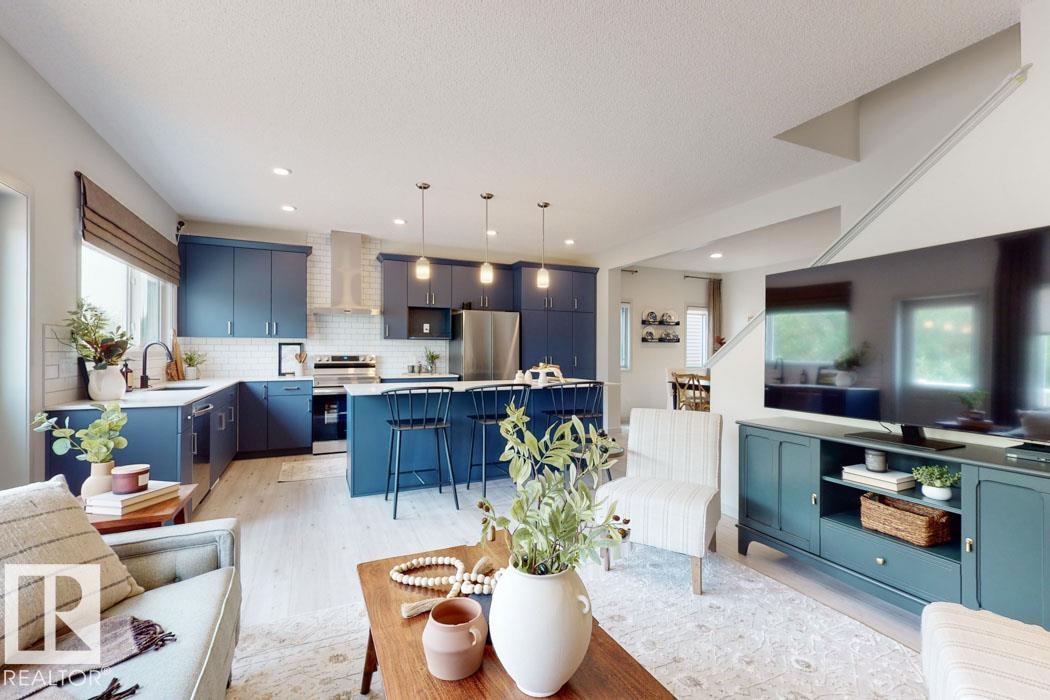 Built by Sterling Homes, this front-attached home in College Woods at Lakeview blends modern comfort with a peaceful, tree-lined setting. Triple pane windows and 9' ceilings fill the main floor with natural light, creating a bright, open feel from the moment you enter. The spacious foyer leads to a rear-living layout with a cozy great room, an electric fireplace, oversized windows, and a garden door to the backyard. The kitchen features quartz countertops, a large island with seating, soft-close cabinetry, a chimney hood fan, a built-in microwave, a full-height backsplash, and a corner pantry. A discreet half bath completes the main floor. Upstairs offers a serene primary suite with a walk-in closet and 4-piece ensuite, plus a central bonus room, two bedrooms, full bath, and laundry. Finished with luxury vinyl plank flooring, upgraded railings, side entrance, double attached garage with floor drain, and basement rough-ins, this home offers elevated comfort in North Edmonton.