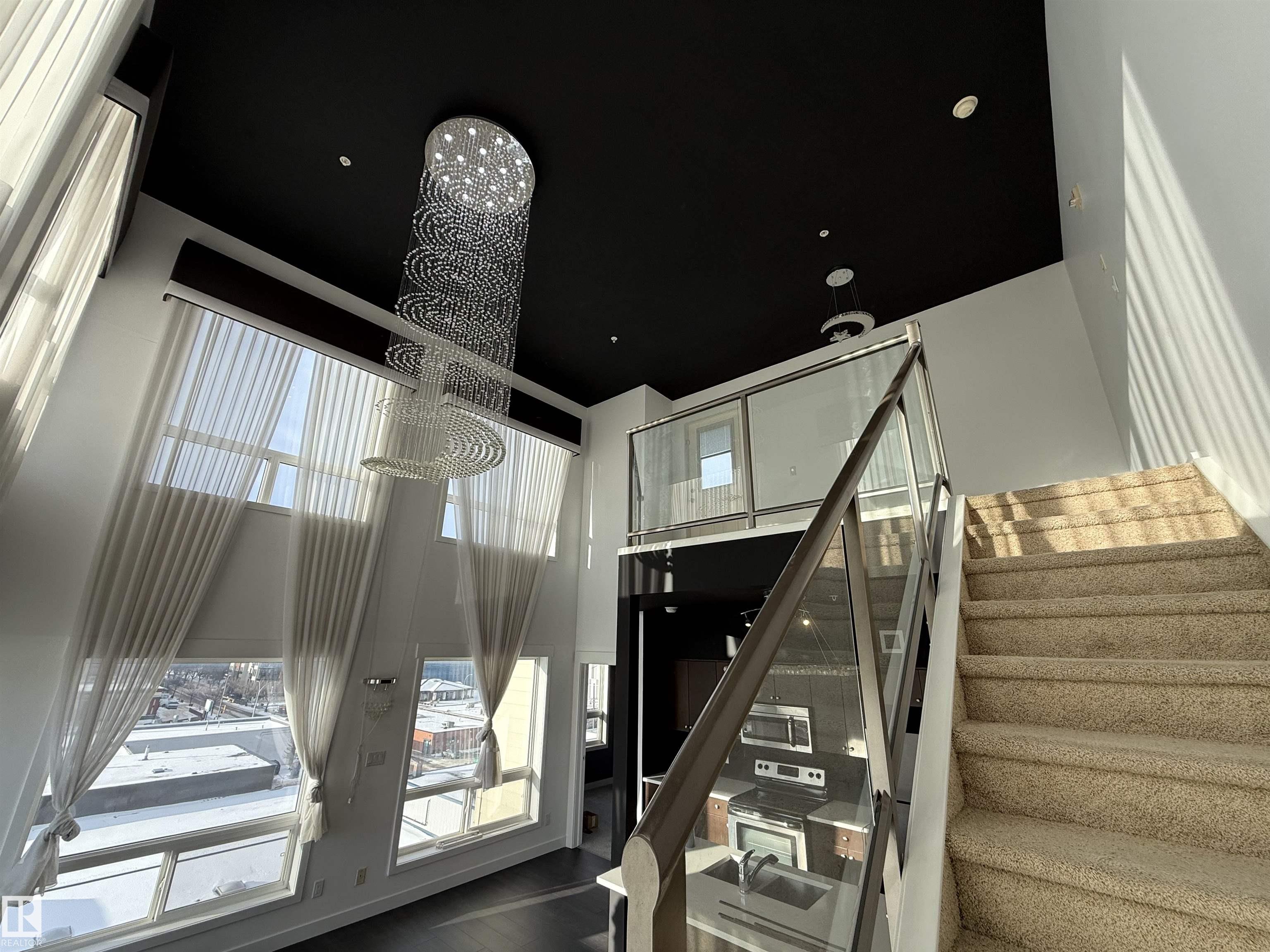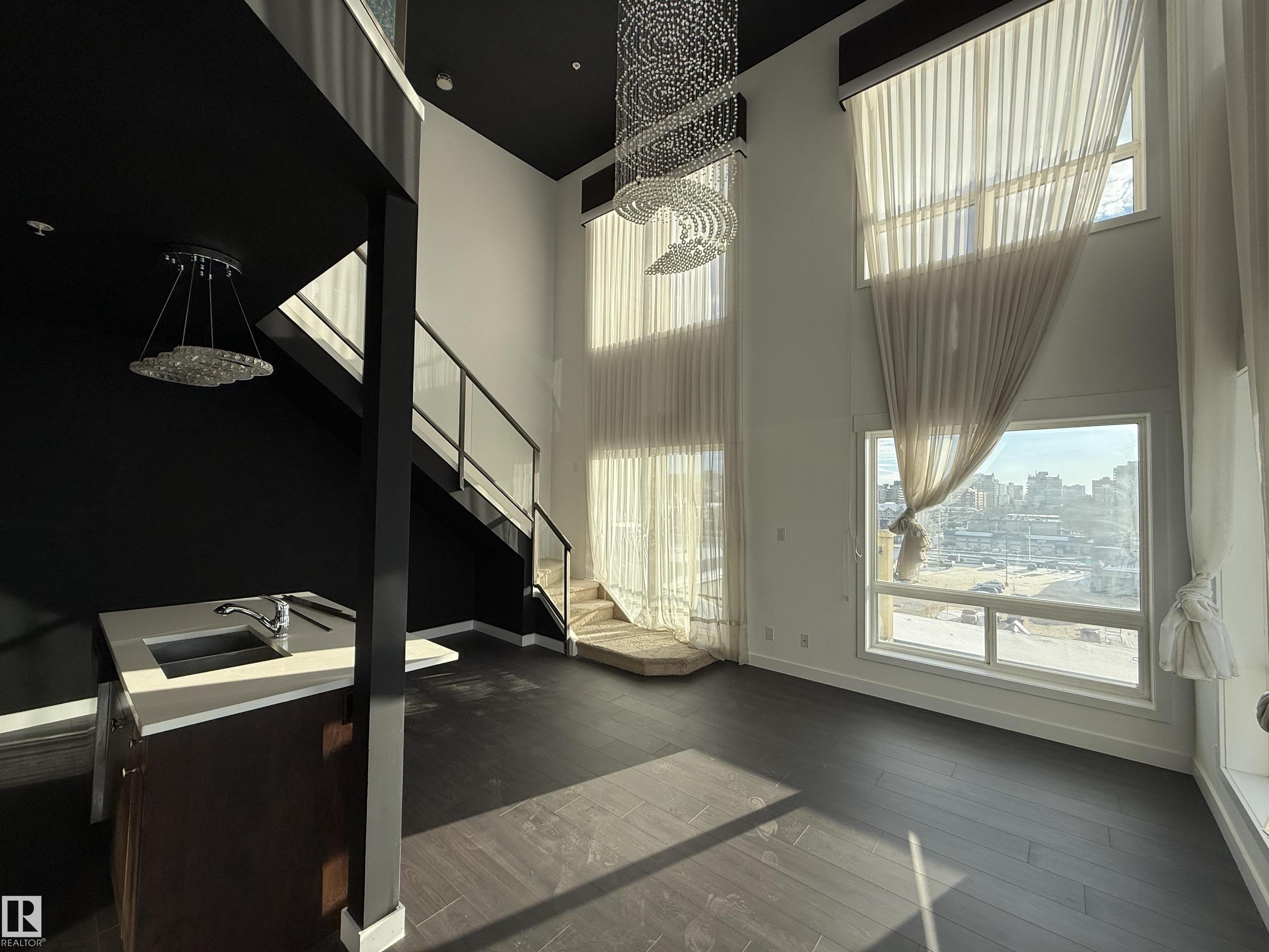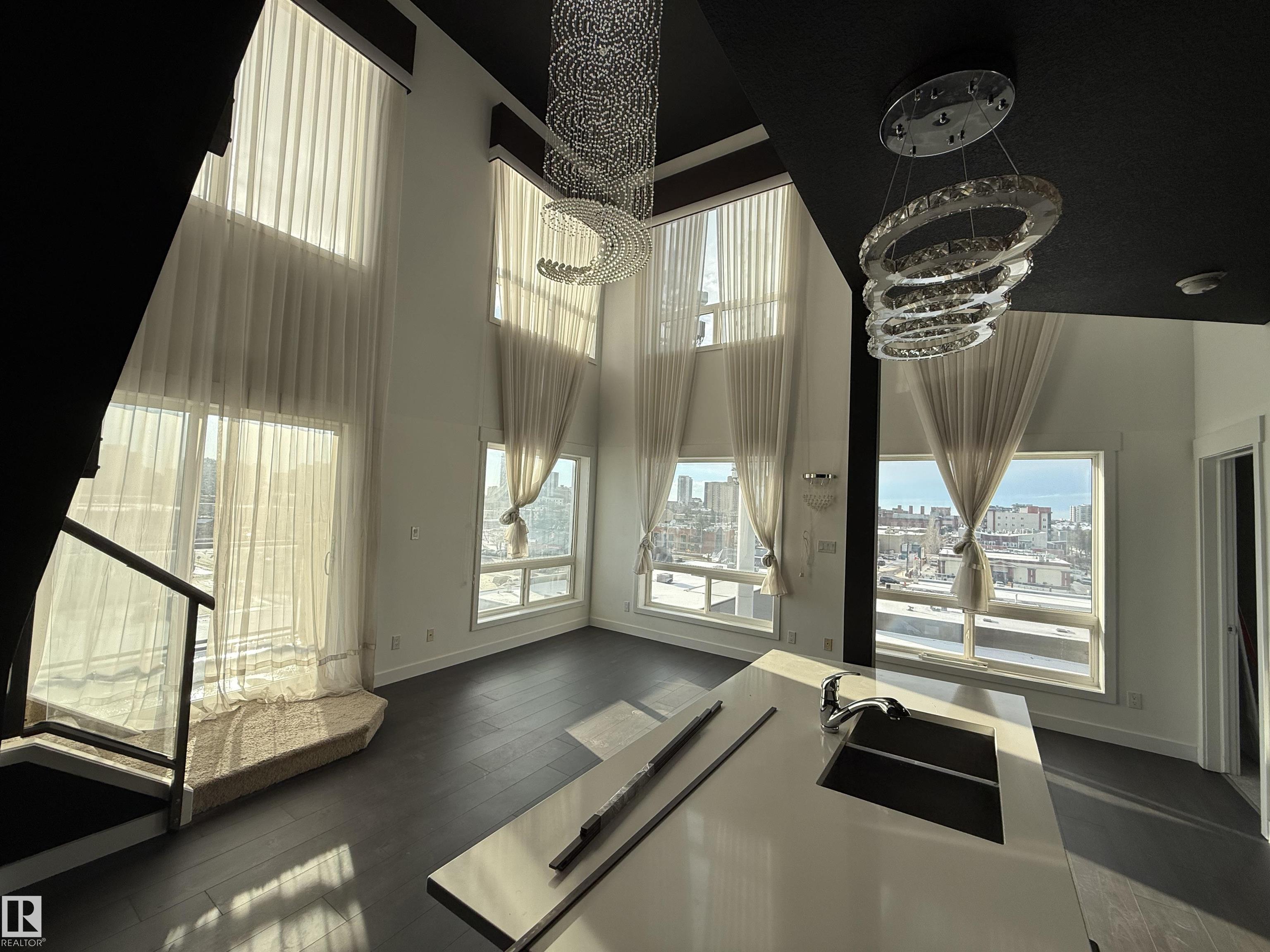 Bask in sunlight from this stunning corner penthouse designed to impress. 9' ceilings throughout rise to a dramatic 18' in the living and dining area, creating a breathtaking sense of space. This layout offers 2 bedrooms plus a den and loft, paired with 2 beautifully finished bathrooms. The south-facing balcony floods the home with light, while laminate flooring with in-floor heating adds comfort and style. The spacious kitchen features sleek quartz countertops and appliances, perfect for entertaining. Enjoy the convenience of stacked laundry and elevate your lifestyle with a private, expansive rooftop deck--your own urban escape above it all. Property is sold as is where is at the time of possession, no warranties or representation.