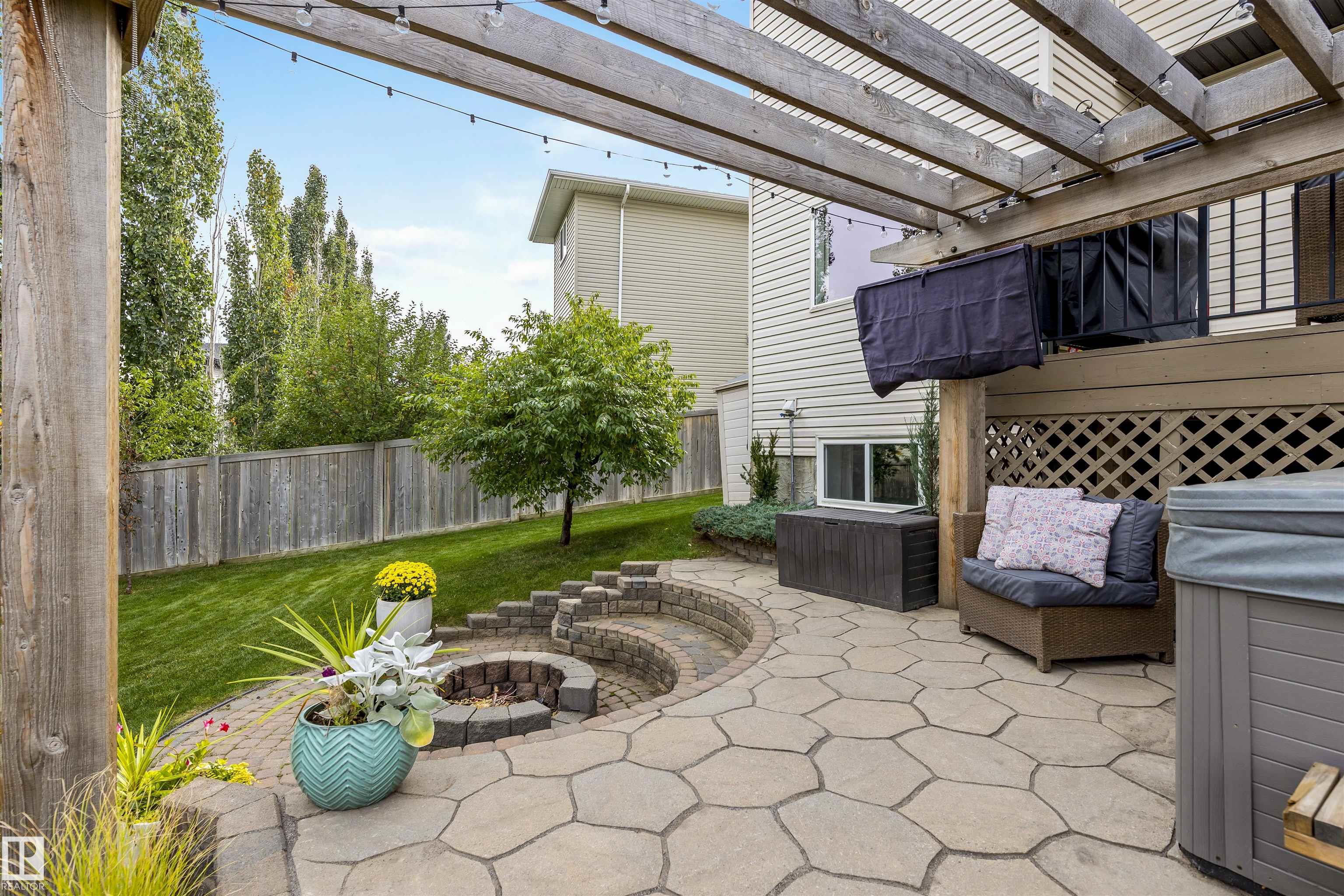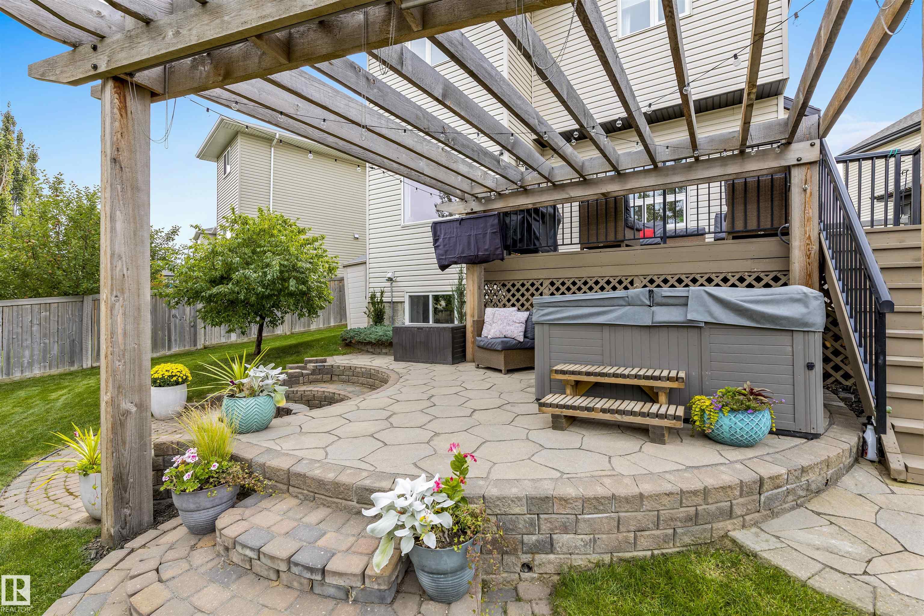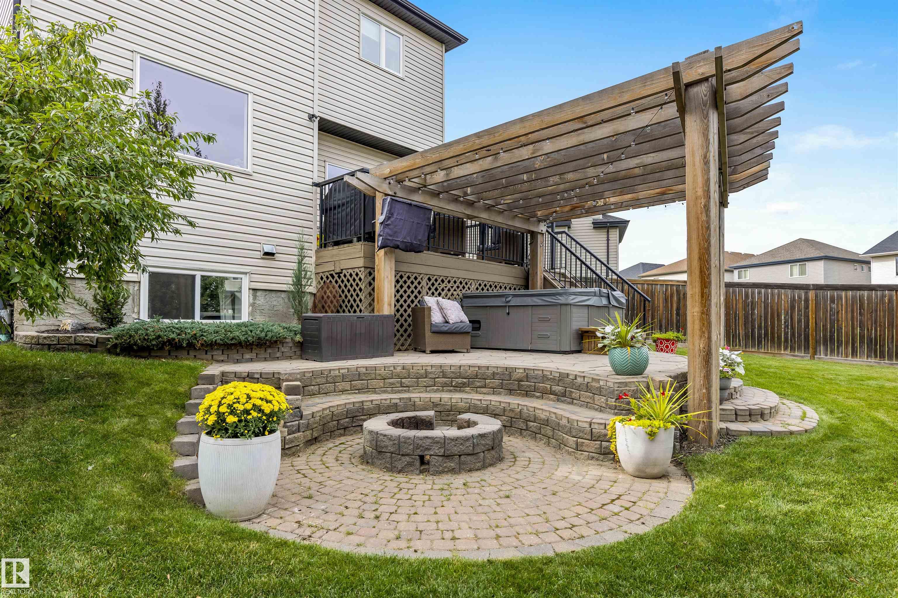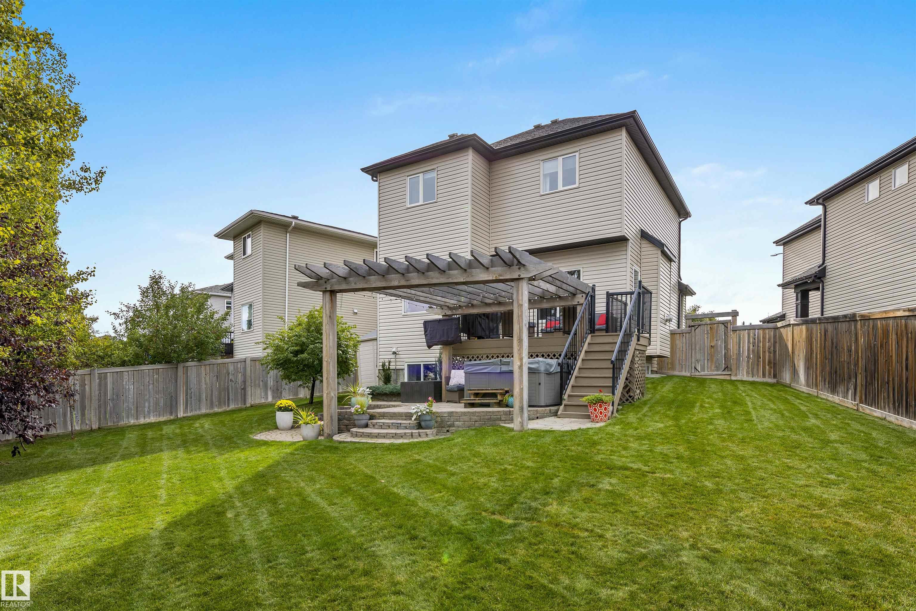Absolutely stunning home on a big PIE lot! Great open layout- gorgeous kitchen with cabinets all the way up the 9' ceilings, 8' granite island, stainless appliances including new range & walk through pantry to the garage. Currently set up for a large dining table by the cozy gas fireplace & a bright sitting area at the back of the home, but easily switched for a larger living room on the main floor & a table in the nook. The patio door leads out to an incredible yard with an elevated deck, pergola, hot tub & beautifully landscaped paving stone & lush irrigated green oasis! Upstairs are 3 good sized bedrooms, 2 full baths & a central bonus room to separate the bedrooms. The primary has a great walk-in closet & tile & glass shower with quartz counters. The basement is fully finished with a 4th bedroom, 3rd full bathroom & a good sized family room. Quiet street with excellent neighbours, close to walking trails, parks, Public & Catholic schools & Lewis Farms Rec Centre. Central A/C & HWT 2022