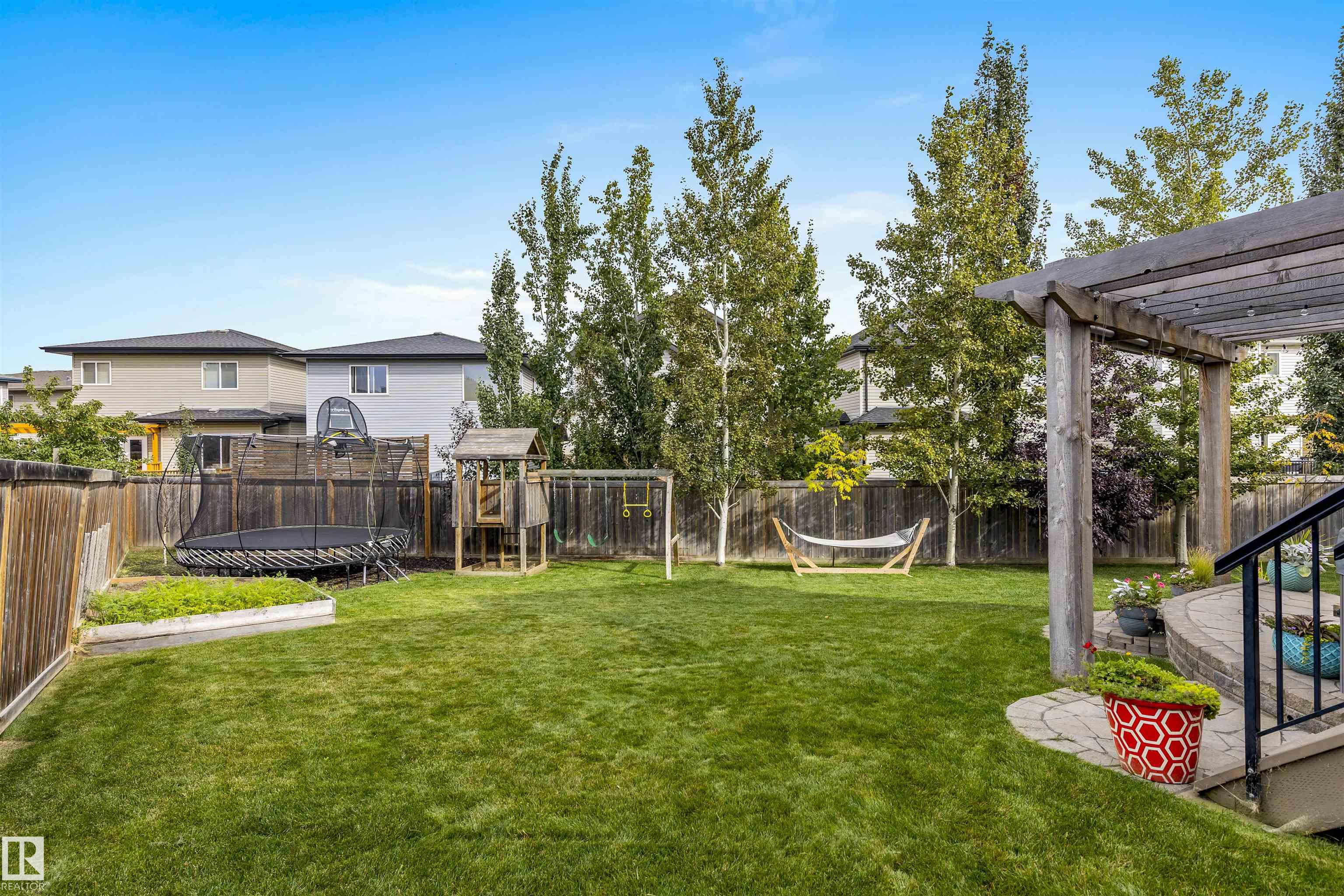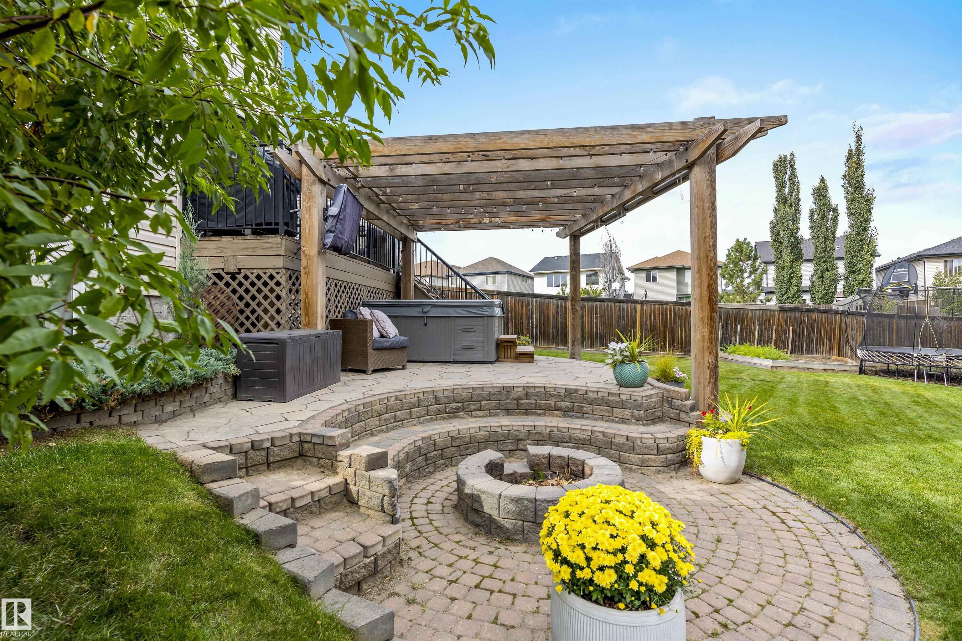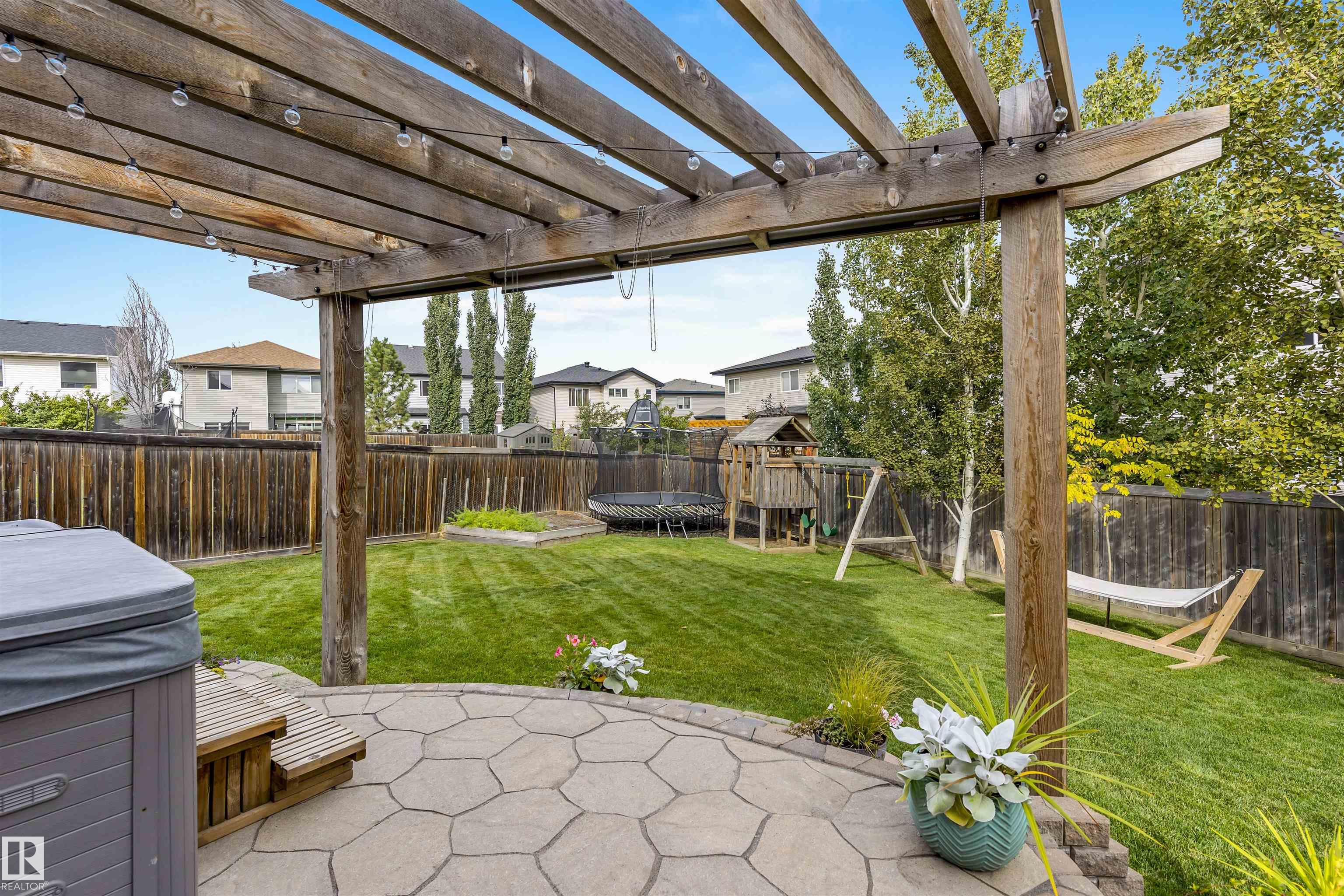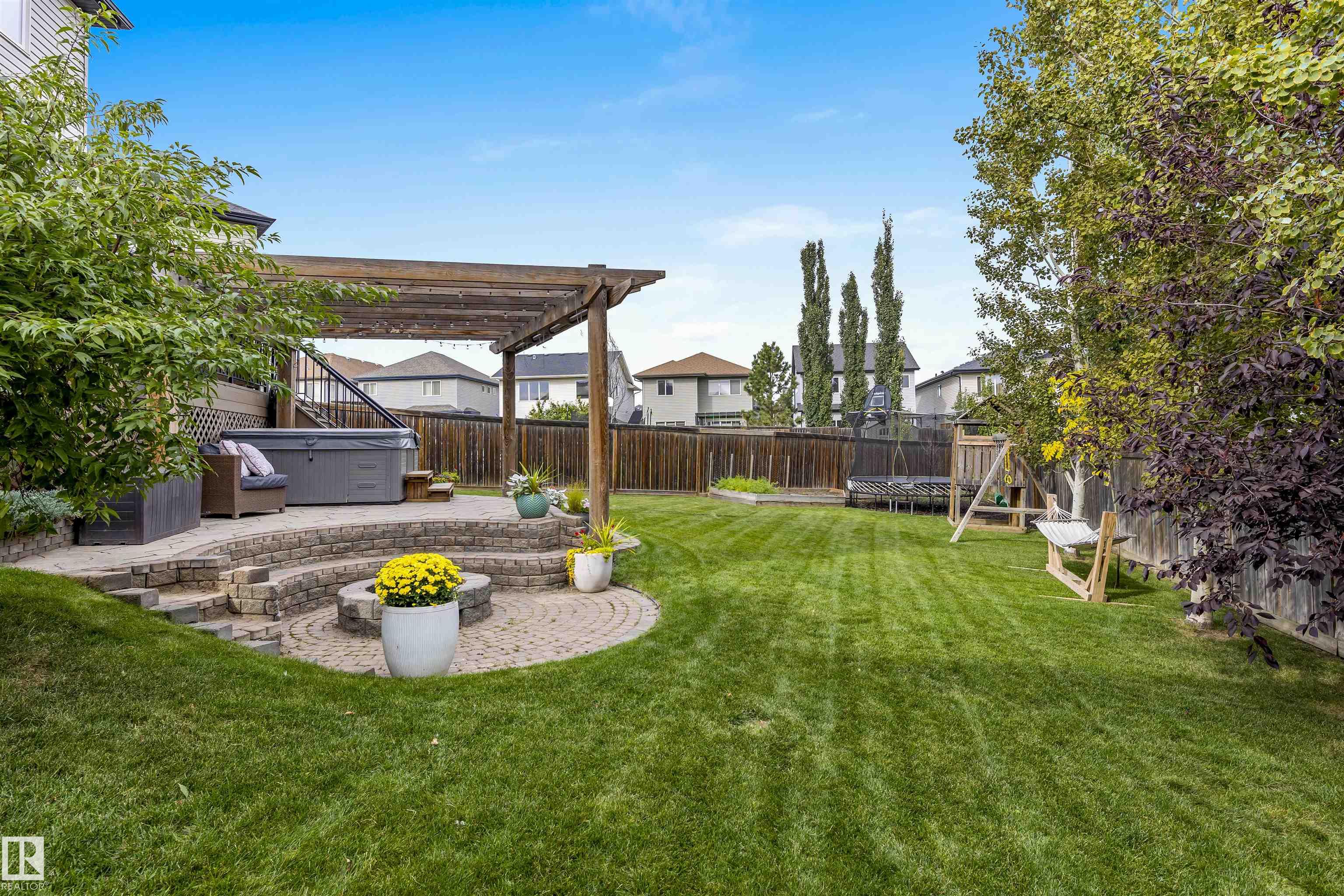 Absolutely stunning home on a big PIE lot! Great open layout- gorgeous kitchen with cabinets all the way up the 9' ceilings, 8' granite island, stainless appliances including new range & walk through pantry to the garage. Currently set up for a large dining table by the cozy gas fireplace & a bright sitting area at the back of the home, but easily switched for a larger living room on the main floor & a table in the nook. The patio door leads out to an incredible yard with an elevated deck, pergola, hot tub & beautifully landscaped paving stone & lush irrigated green oasis! Upstairs are 3 good sized bedrooms, 2 full baths & a central bonus room to separate the bedrooms. The primary has a great walk-in closet & tile & glass shower with quartz counters. The basement is fully finished with a 4th bedroom, 3rd full bathroom & a good sized family room. Quiet street with excellent neighbours, close to walking trails, parks, Public & Catholic schools & Lewis Farms Rec Centre. Central A/C & HWT 2022