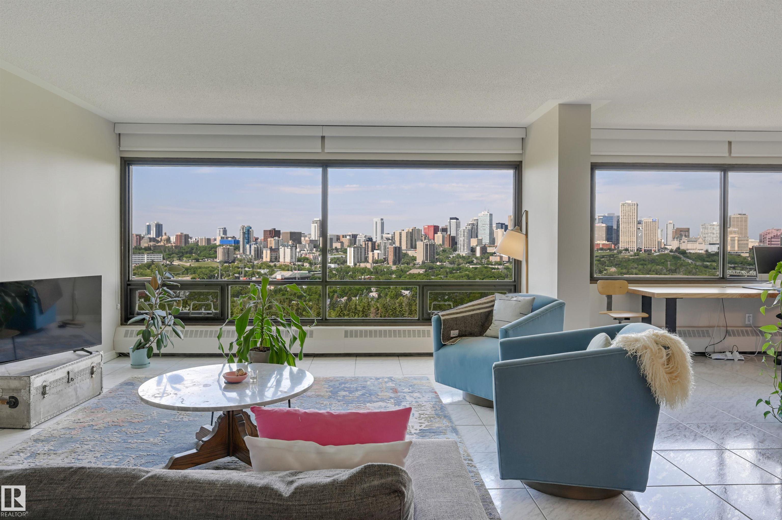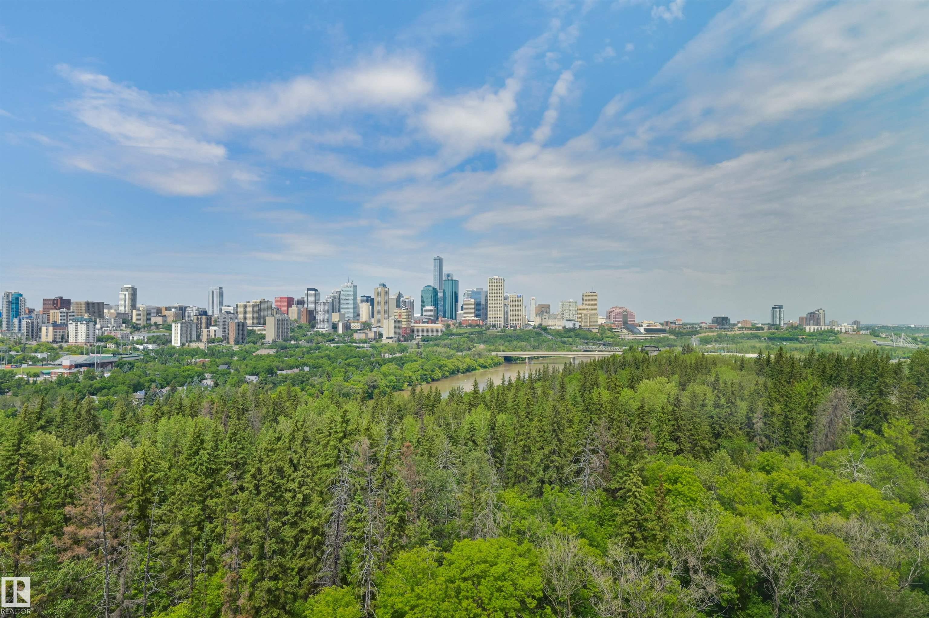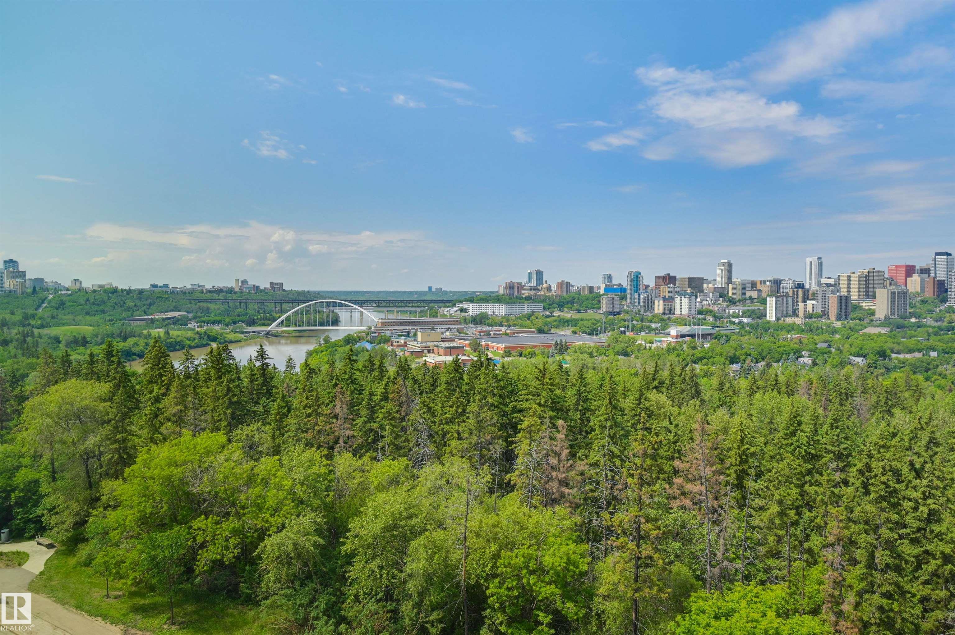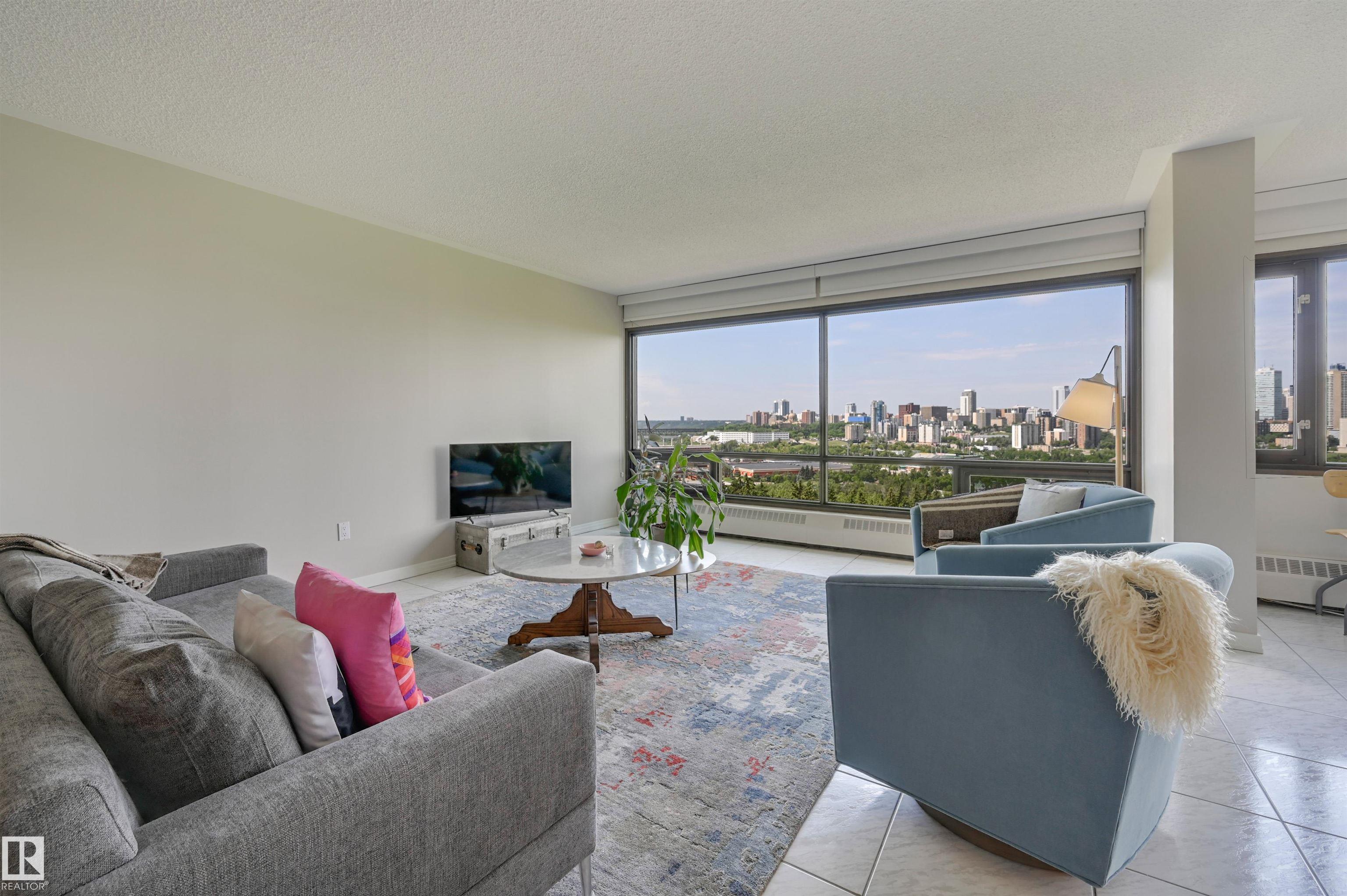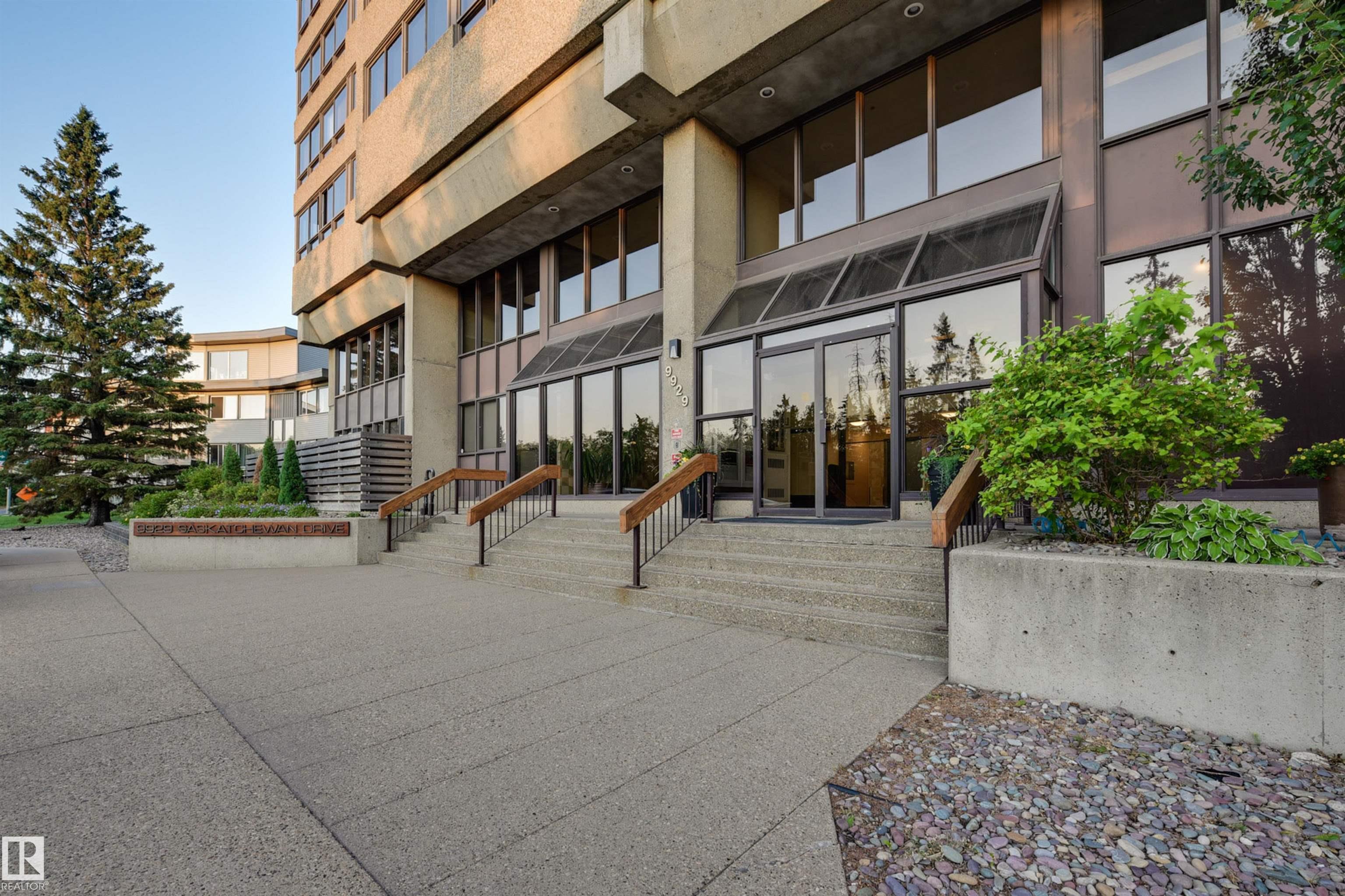 SPECTACULAR RIVER VALLEY & DOWNTOWN VIEWS from this 1512 sq.ft. condo in 9929 conveniently located on Sask. Dr. with the river valley trails at your doorstep, close to transportation, Whyte Ave., the U of A & Downtown. Beautifully RENOVATED with a modern open floor plan, new kitchen cabinets, quartz counters, island, stainless steel appliances with a Fisher & Paykel fridge, glass top stove, built-in microwave, Bosch dishwasher & slate flooring. Modern tile flooring in the entry, living & dining room. Spacious living & dining room & an open den with fantastic views. 2 piece powder room with travertine counters & slate flooring. The spacious primary suite has a walk-in closet & a renovated 5 piece ensuite bathroom with a double vanity with travertine counters, walk-in shower & soaker tub. Spacious storage room, INSUITE WASHER & DRYER, A/C, U/G parking. Amenities: a pool, jacuzzi, exercise room, games room & party room. Very well maintained building with brand new windows. Shows very well!