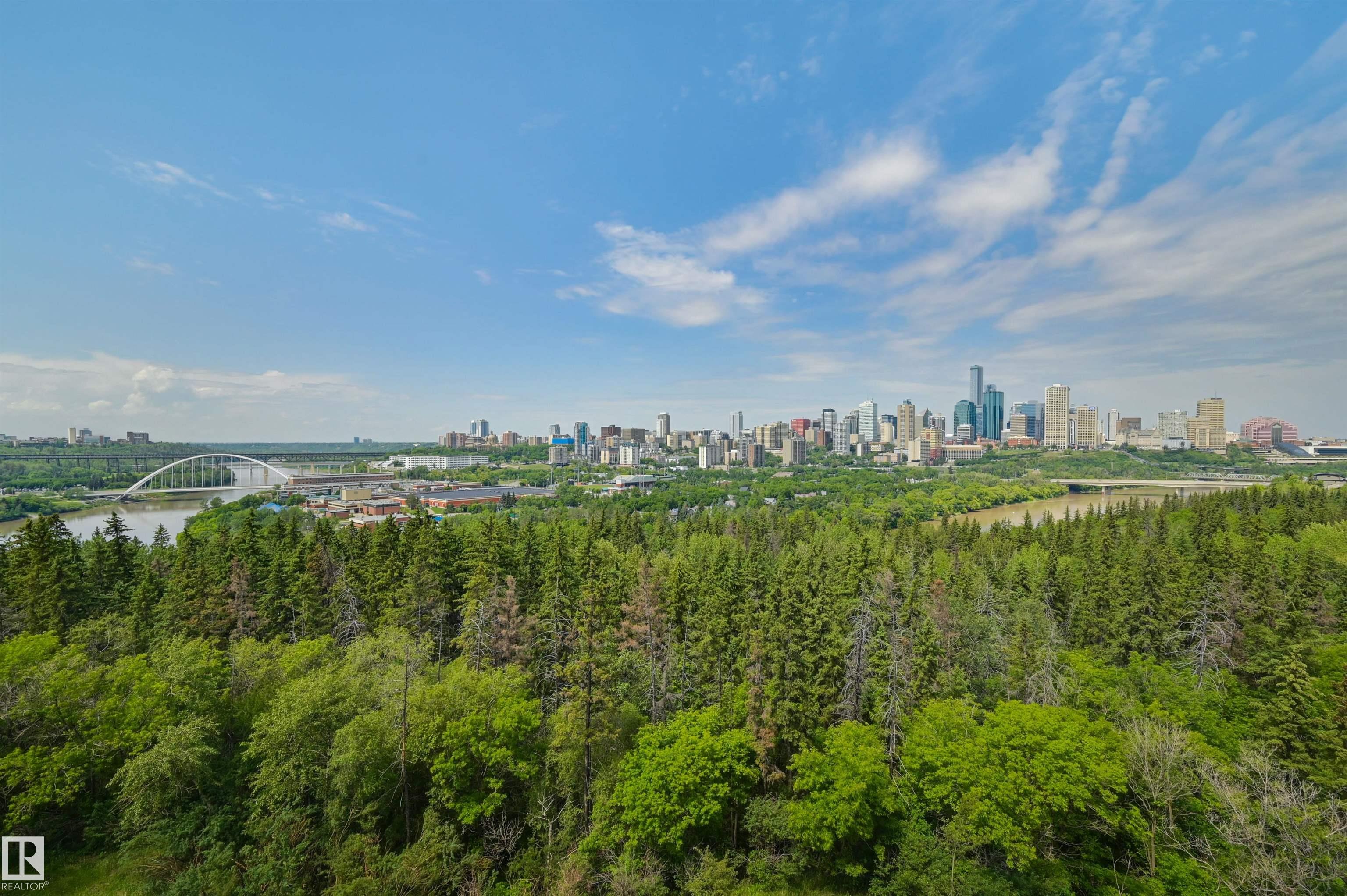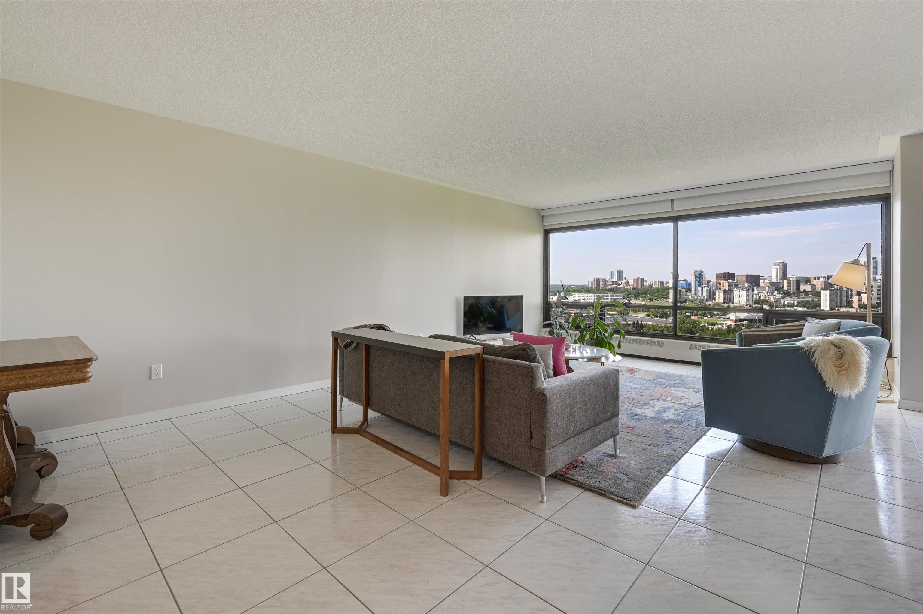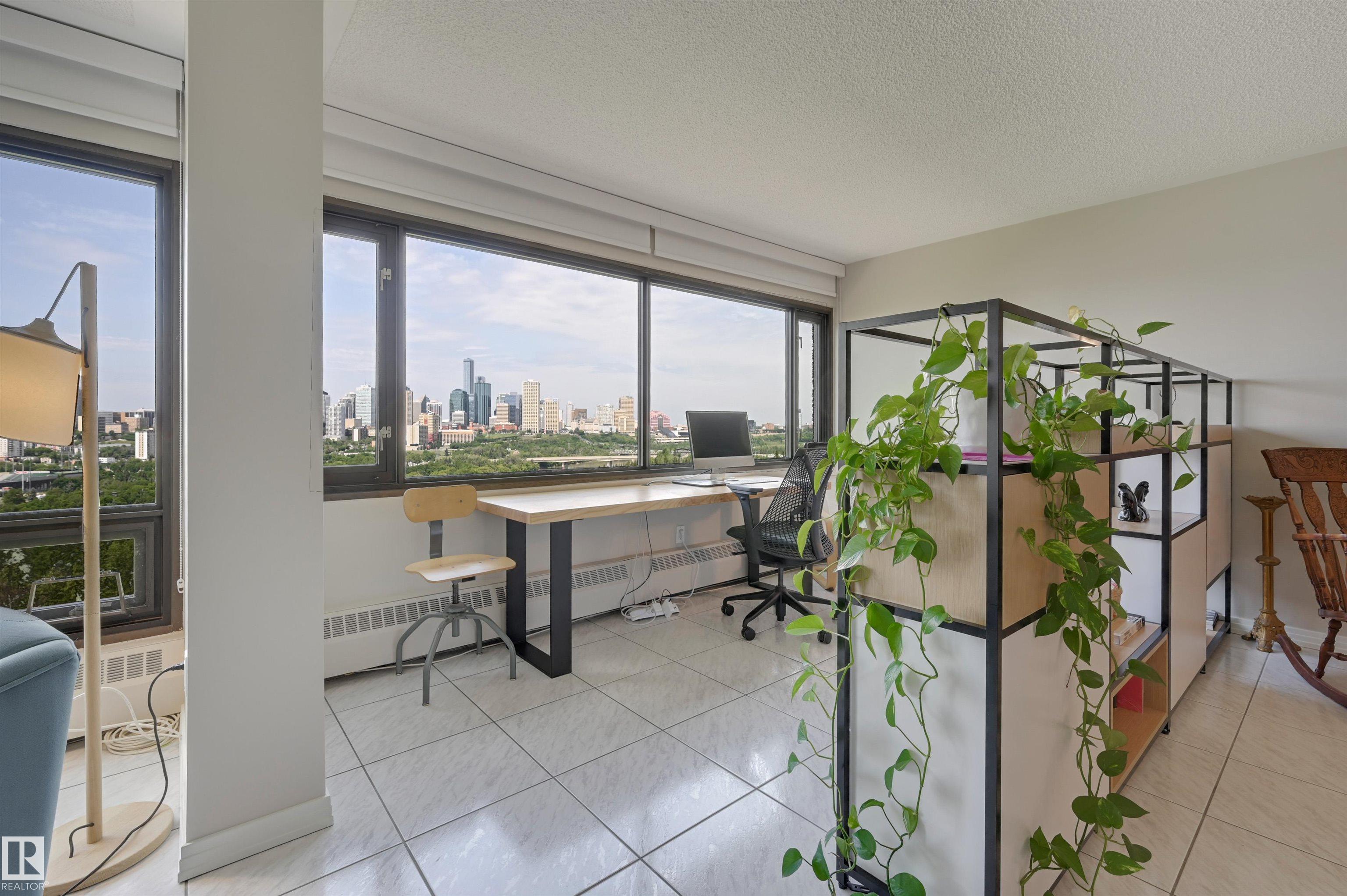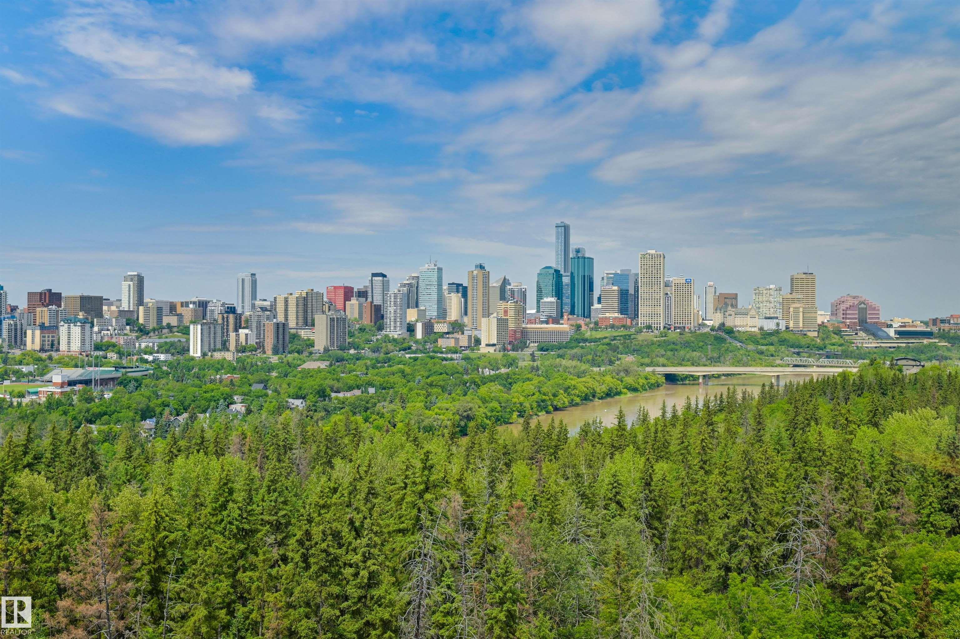 SPECTACULAR RIVER VALLEY & DOWNTOWN VIEWS from this 1512 sq.ft. condo in 9929 conveniently located on Sask. Dr. with the river valley trails at your doorstep, close to transportation, Whyte Ave., the U of A & Downtown. Beautifully RENOVATED with a modern open floor plan, new kitchen cabinets, quartz counters, island, stainless steel appliances with a Fisher & Paykel fridge, glass top stove, built-in microwave, Bosch dishwasher & slate flooring. Modern tile flooring in the entry, living & dining room. Spacious living & dining room & an open den with fantastic views. 2 piece powder room with travertine counters & slate flooring. The spacious primary suite has a walk-in closet & a renovated 5 piece ensuite bathroom with a double vanity with travertine counters, walk-in shower & soaker tub. Spacious storage room, INSUITE WASHER & DRYER, A/C, U/G parking. Amenities: a pool, jacuzzi, exercise room, games room & party room. Very well maintained building with brand new windows. Shows very well!