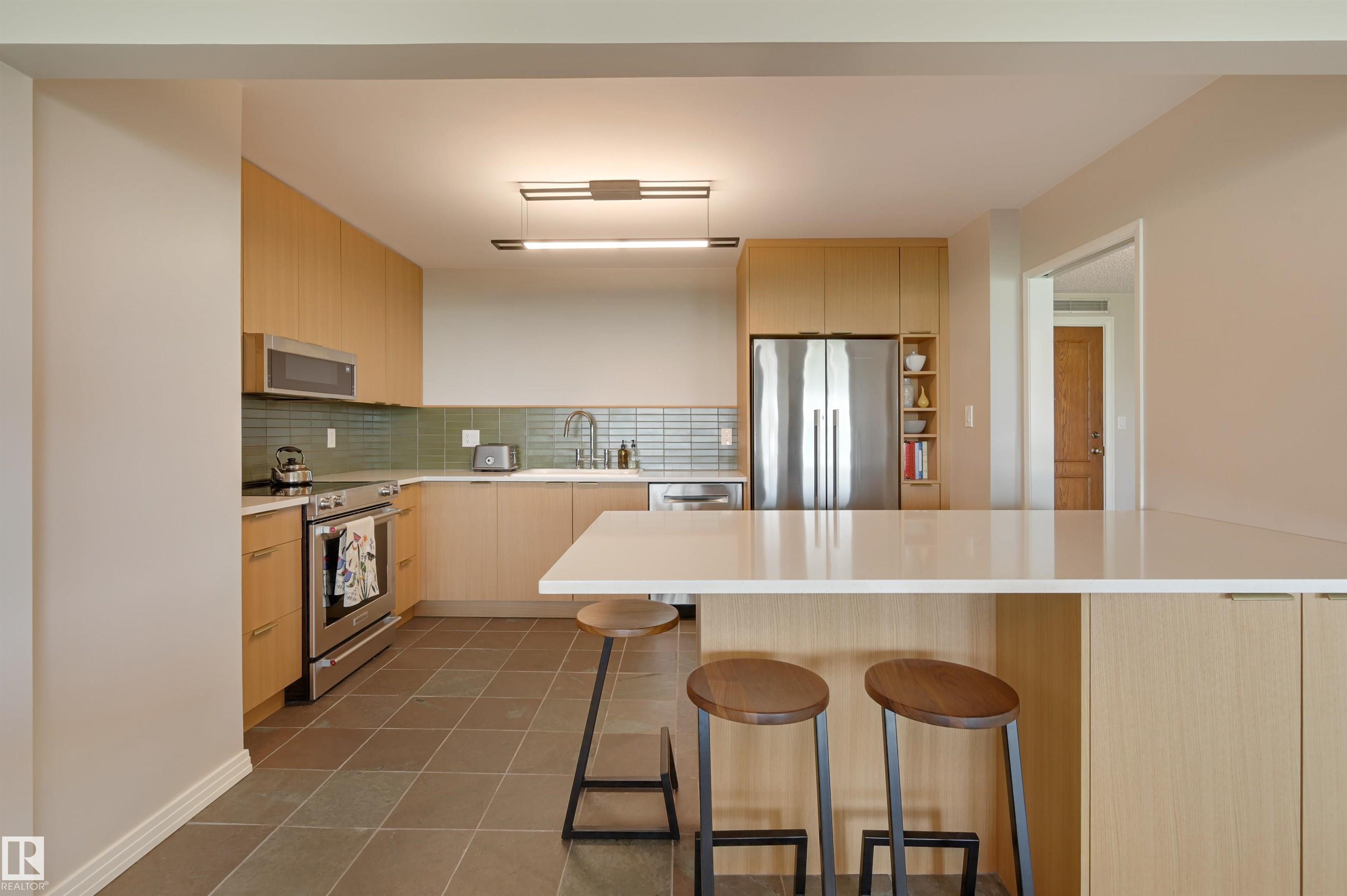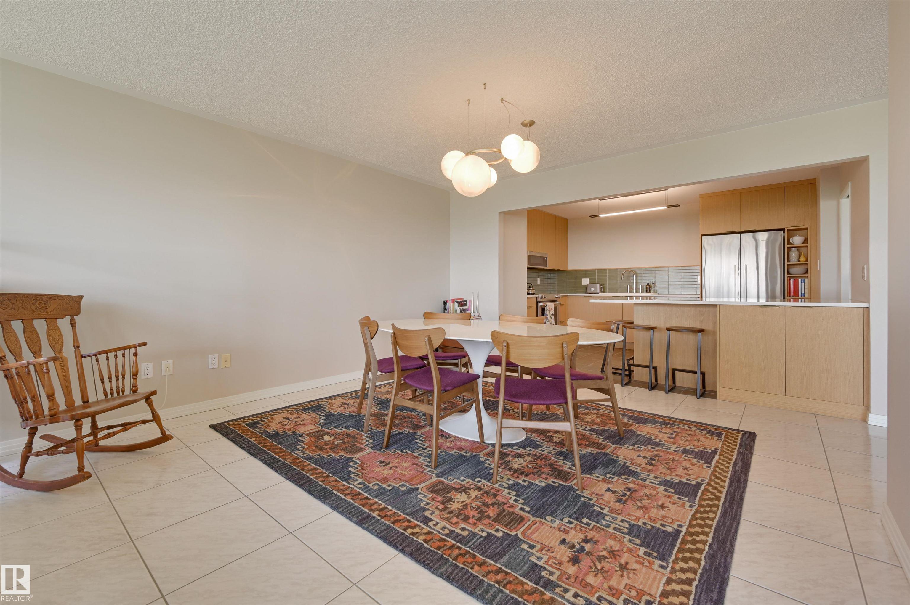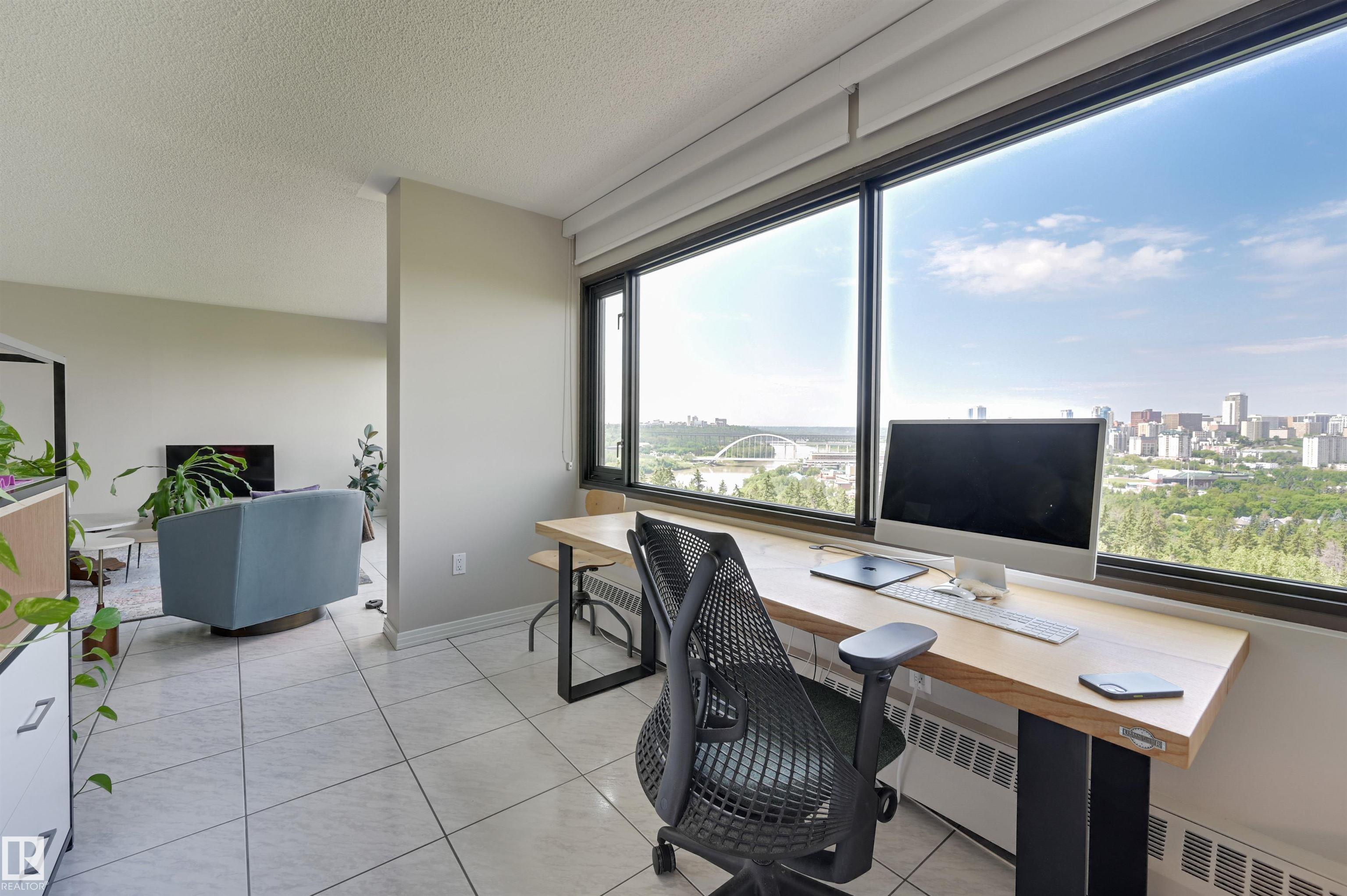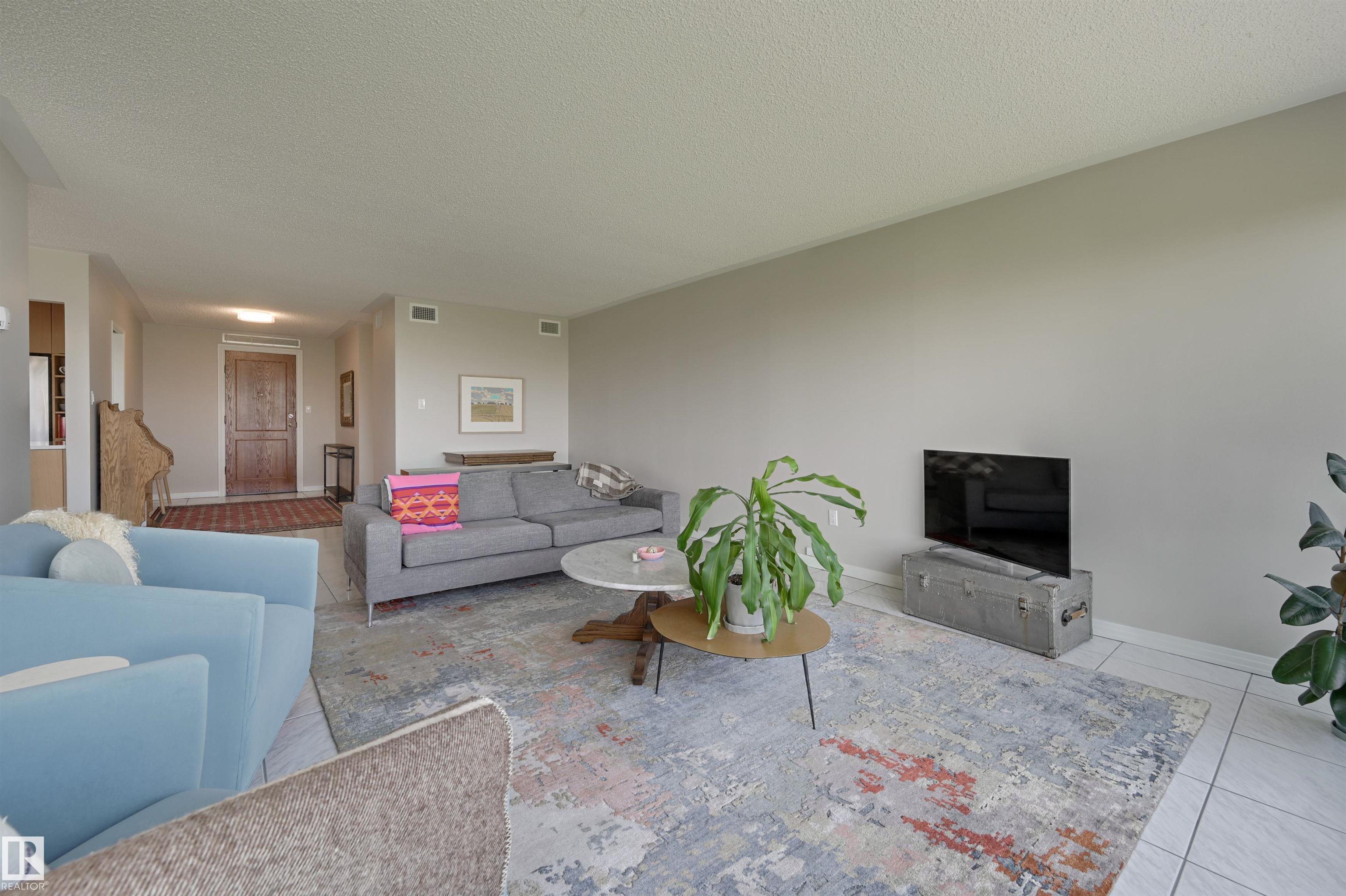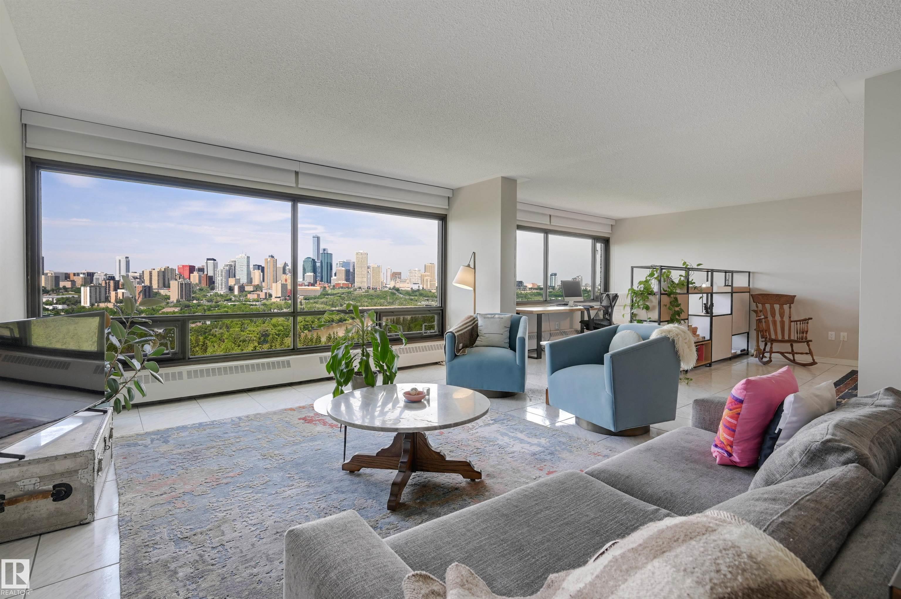 SPECTACULAR RIVER VALLEY & DOWNTOWN VIEWS from this 1512 sq.ft. condo in 9929 conveniently located on Sask. Dr. with the river valley trails at your doorstep, close to transportation, Whyte Ave., the U of A & Downtown. Beautifully RENOVATED with a modern open floor plan, new kitchen cabinets, quartz counters, island, stainless steel appliances with a Fisher & Paykel fridge, glass top stove, built-in microwave, Bosch dishwasher & slate flooring. Modern tile flooring in the entry, living & dining room. Spacious living & dining room & an open den with fantastic views. 2 piece powder room with travertine counters & slate flooring. The spacious primary suite has a walk-in closet & a renovated 5 piece ensuite bathroom with a double vanity with travertine counters, walk-in shower & soaker tub. Spacious storage room, INSUITE WASHER & DRYER, A/C, U/G parking. Amenities: a pool, jacuzzi, exercise room, games room & party room. Very well maintained building with brand new windows. Shows very well!