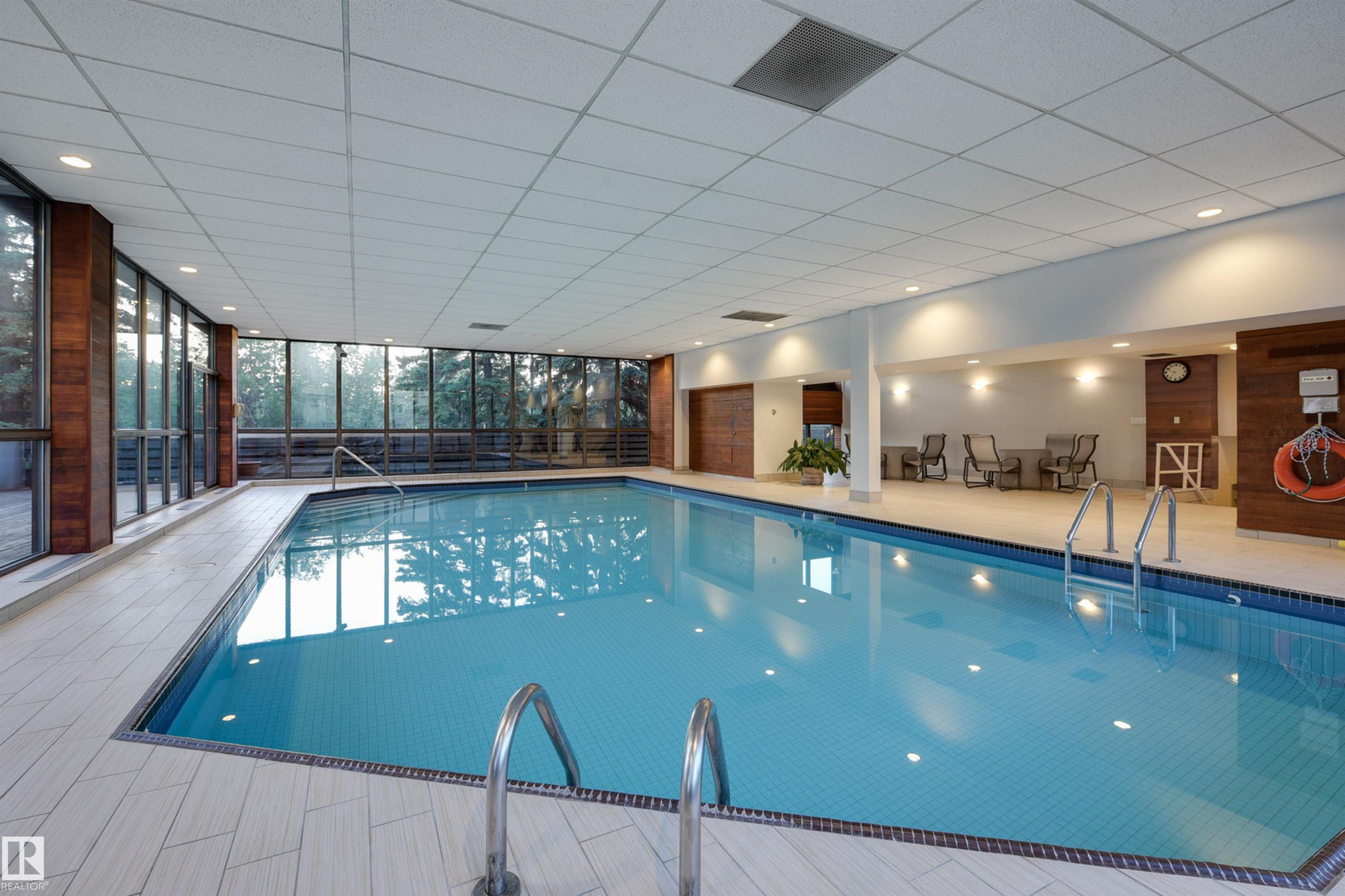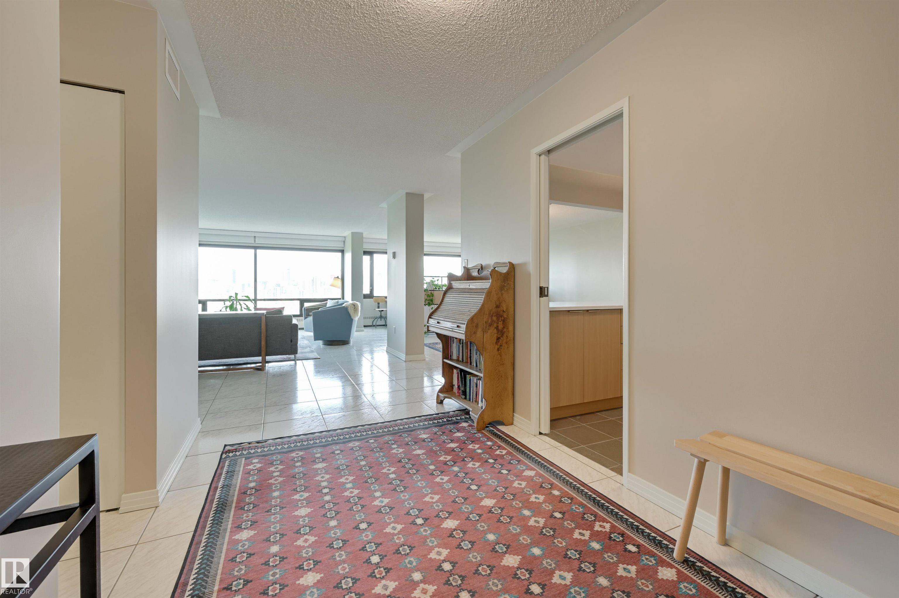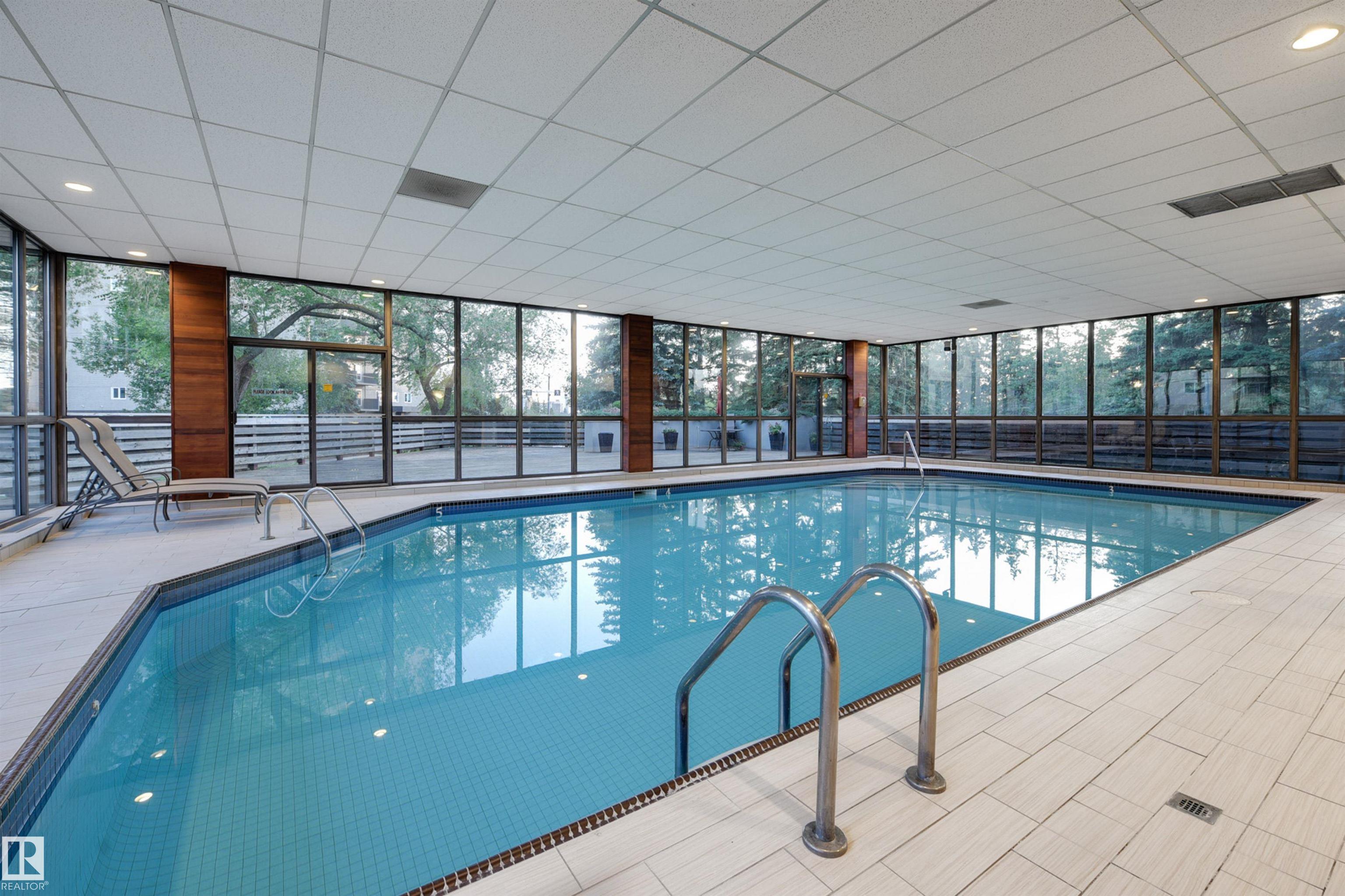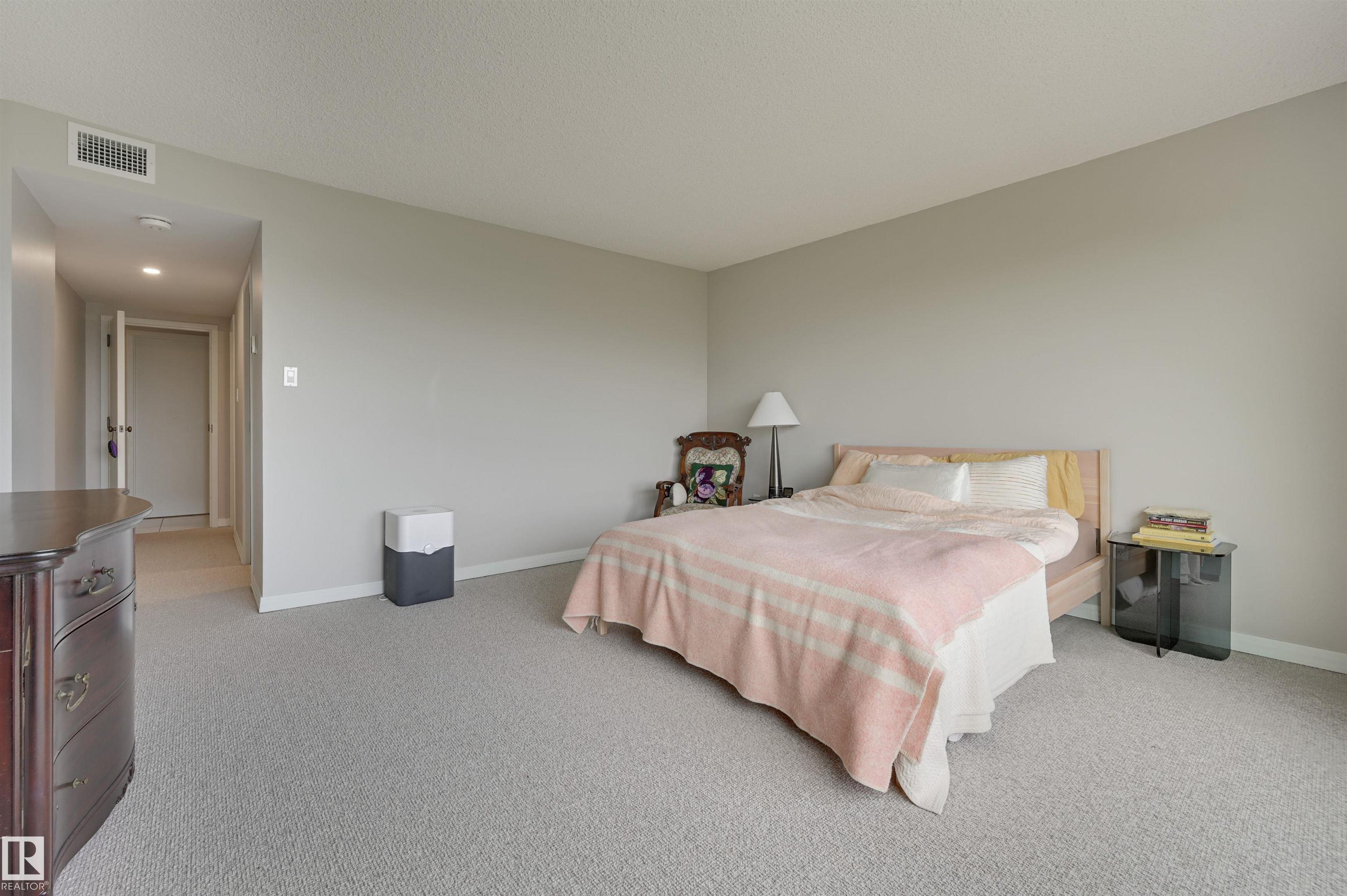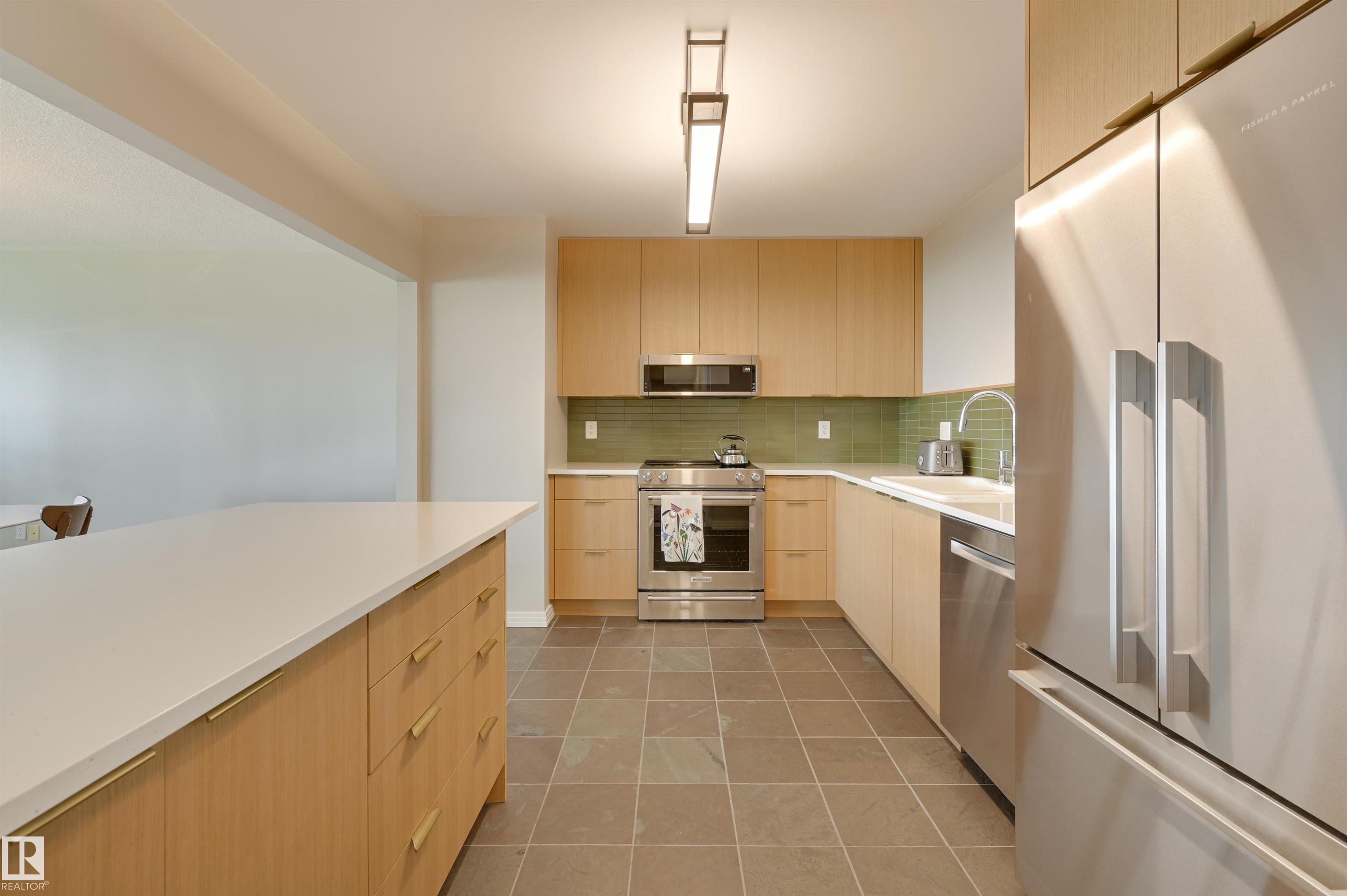 SPECTACULAR RIVER VALLEY & DOWNTOWN VIEWS from this 1512 sq.ft. condo in 9929 conveniently located on Sask. Dr. with the river valley trails at your doorstep, close to transportation, Whyte Ave., the U of A & Downtown. Beautifully RENOVATED with a modern open floor plan, new kitchen cabinets, quartz counters, island, stainless steel appliances with a Fisher & Paykel fridge, glass top stove, built-in microwave, Bosch dishwasher & slate flooring. Modern tile flooring in the entry, living & dining room. Spacious living & dining room & an open den with fantastic views. 2 piece powder room with travertine counters & slate flooring. The spacious primary suite has a walk-in closet & a renovated 5 piece ensuite bathroom with a double vanity with travertine counters, walk-in shower & soaker tub. Spacious storage room, INSUITE WASHER & DRYER, A/C, U/G parking. Amenities: a pool, jacuzzi, exercise room, games room & party room. Very well maintained building with brand new windows. Shows very well!