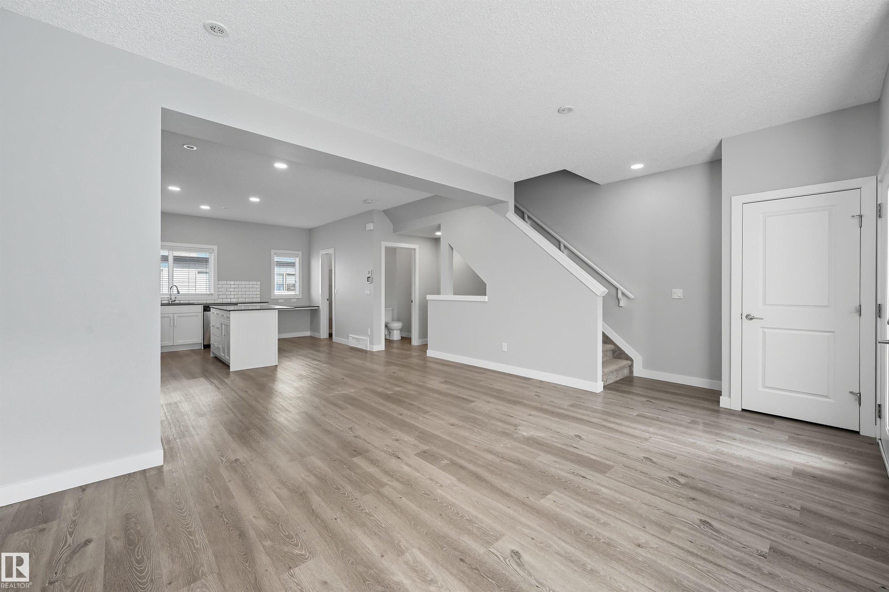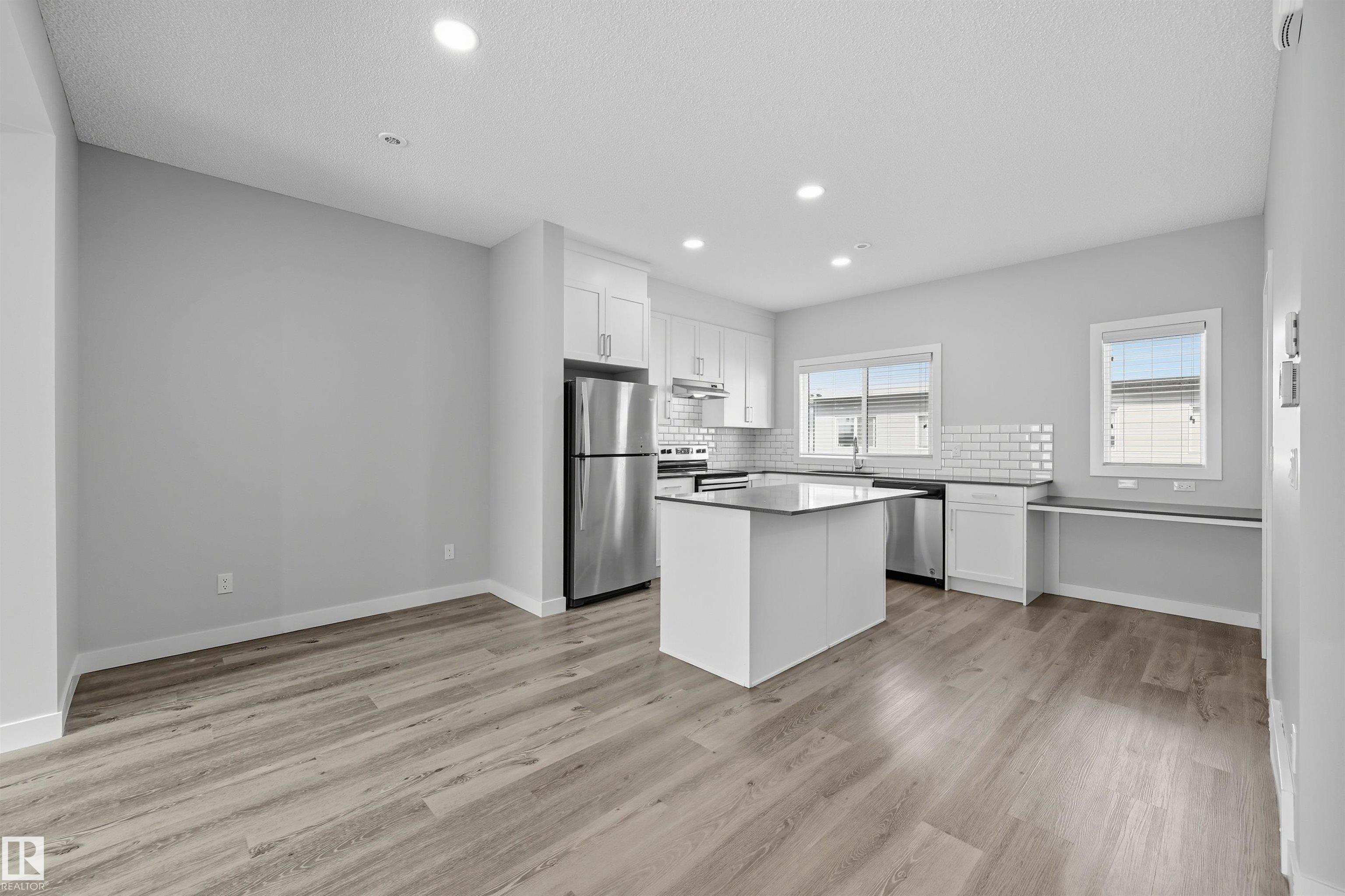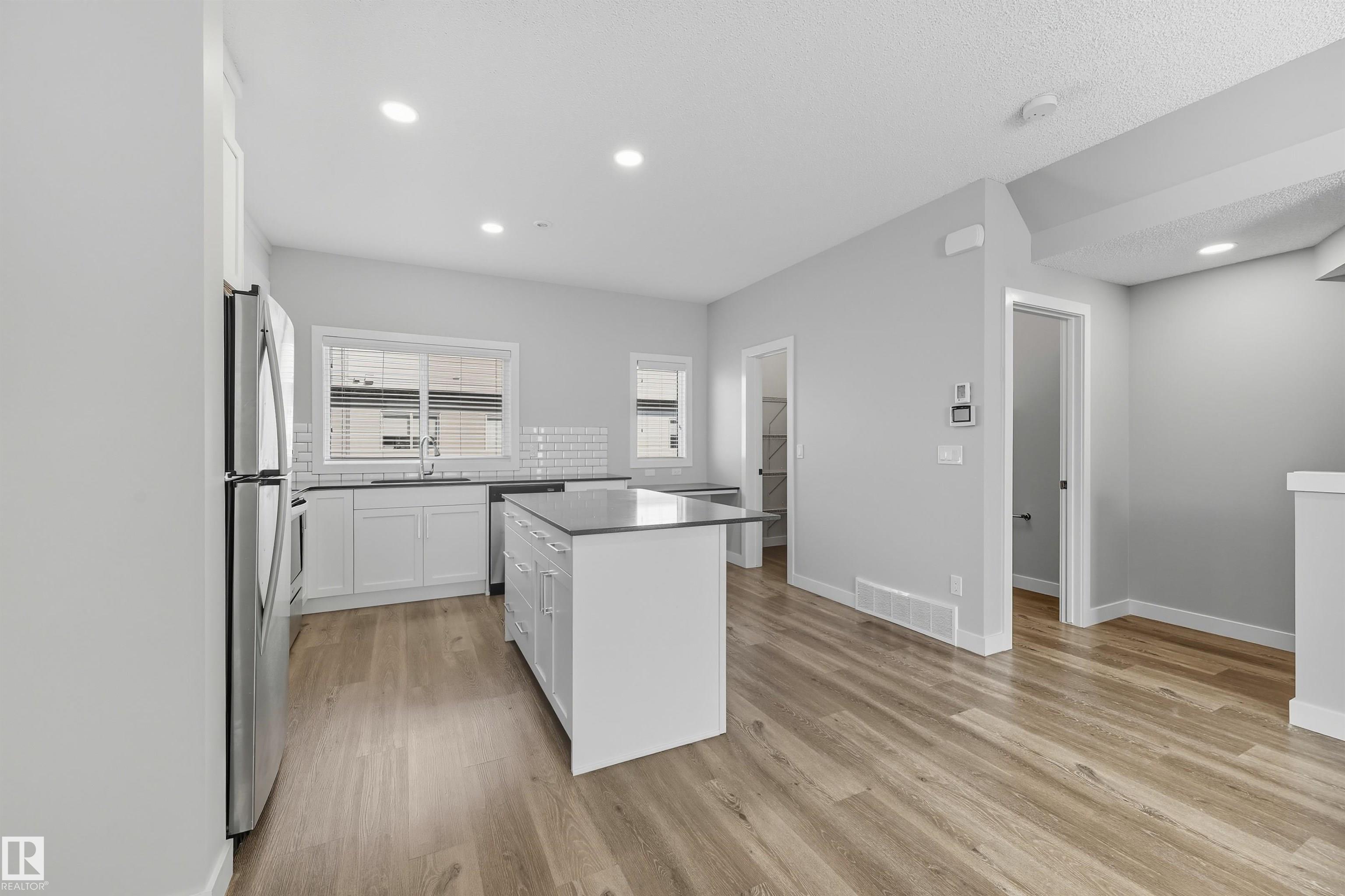 Bright, modern & spacious 3 bed/2.5 bath townhouse w/ double attached garage in the desirable Walker neighborhood. 1545 sf total living space. Perfect for first time home owners or investors! Main floor features 9' ceilings, vinyl plank floors & a roomy living room filled with natural light from the large South facing window. Kitchen offers a functional layout, stainless steel appliances, quartz countertops, tons of counter space, walk-in pantry, eating bar, & built in desk. Upper level also has 9' ceilings & large primary bedrm w/ 4pc ensuite & walk in closet. Two other well sized bedrms, 4 pc main bath & laundry complete this level. Lower level flex room is perfect for an office, play rm, exercise area, or extra storage space! Energy-efficient mechanical including HRV & tankless hot water for a lower utility bill. This well maintained complex offers visitor parking and nearby walking trails & lake. Conveniently close to shopping, schools & public transit. Quick access to commuter routes incl Henday