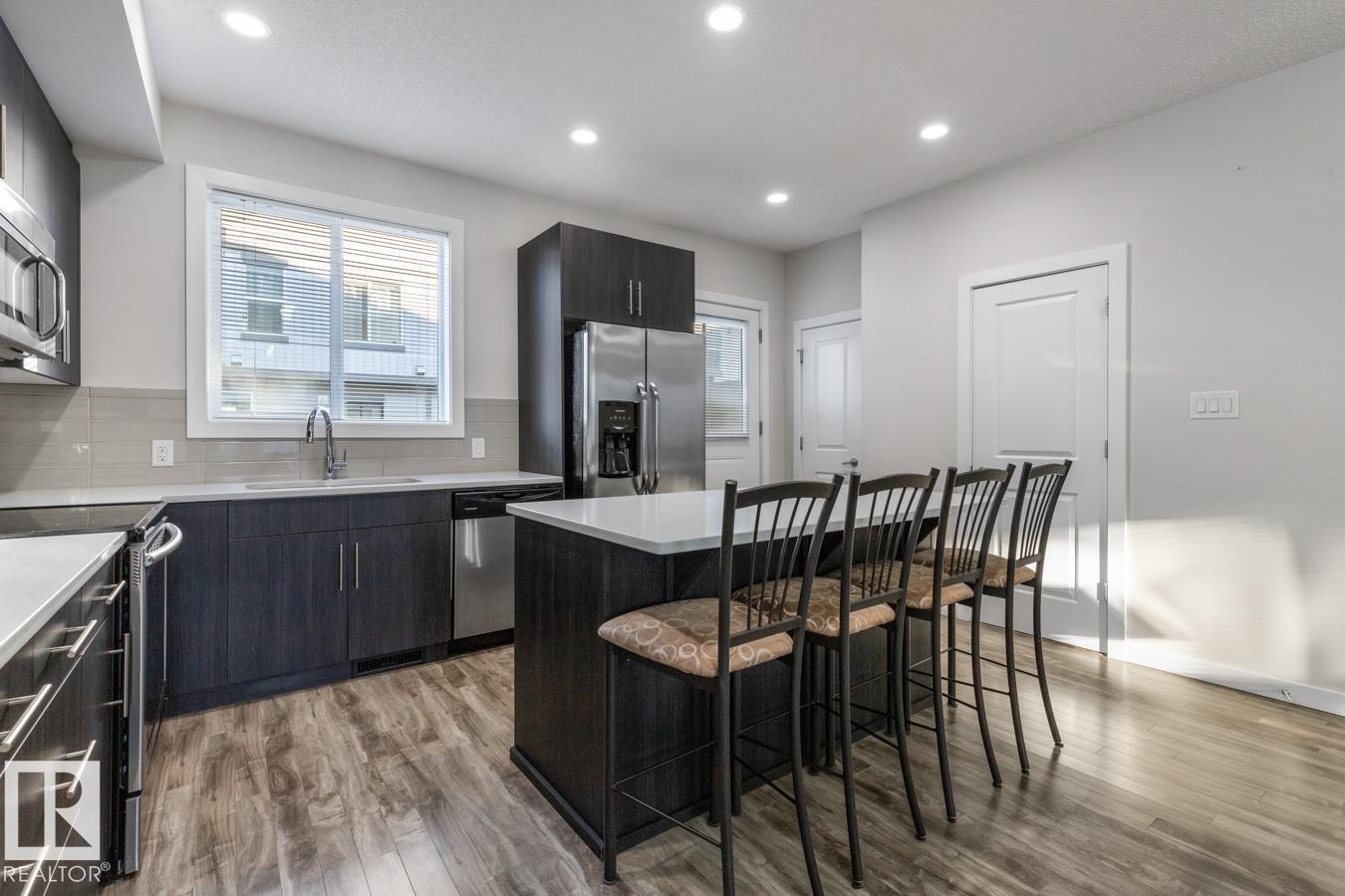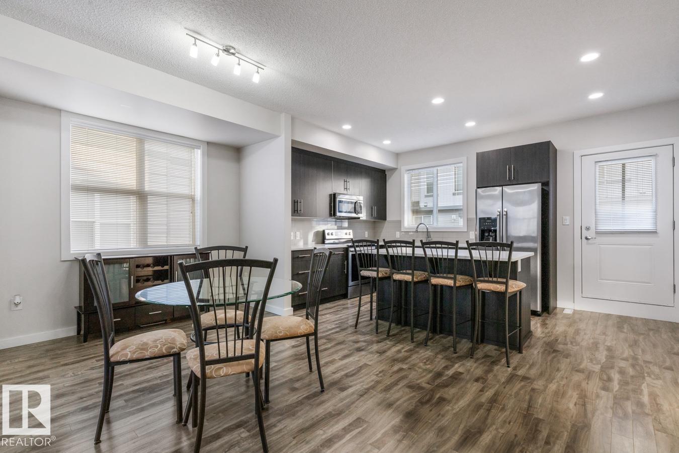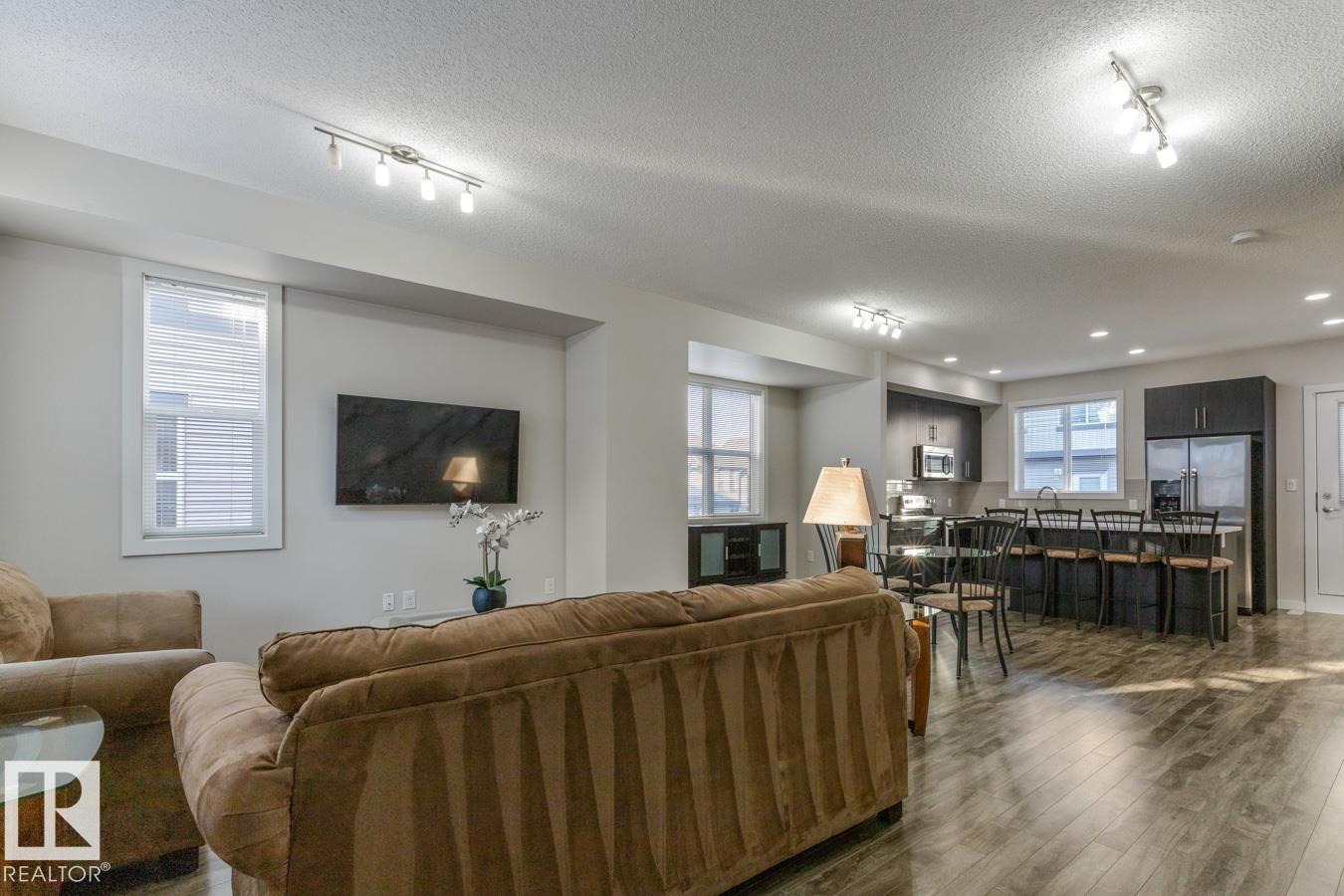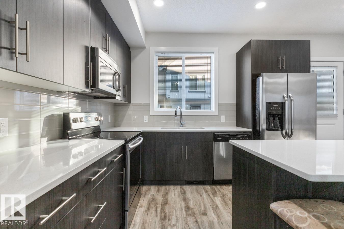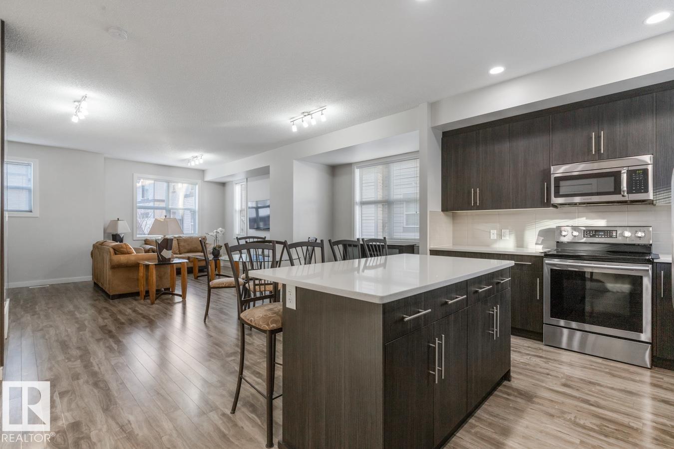 CORNER UNIT WITH DOUBLE GARAGE & 9 FOOT CEILINGS IN WALKER! This bright, beautifully maintained end-unit townhome offers 3 bedrooms, 2.5 baths, and a layout designed for comfort and style. The main floor features soaring 9-foot ceilings and an open-concept living space perfect for hosting or relaxing. The kitchen includes modern finishes, ample counter space, and plenty of cabinetry, flowing seamlessly into the dining and living areas. Upstairs, the spacious primary bedroom offers a walk-in closet and private ensuite, complemented by two additional bedrooms and a full bathroom. With a double attached garage and a fantastic location close to schools, shopping, transit, and the Anthony Henday, this home is MUST SEE. A/C INCLUDED. Welcome home