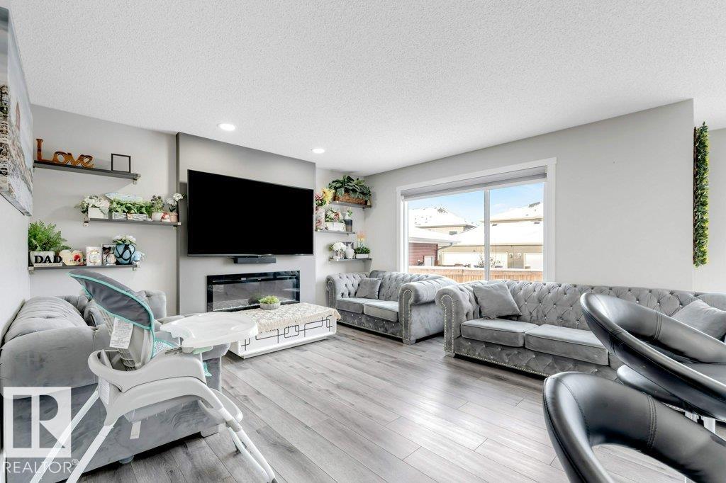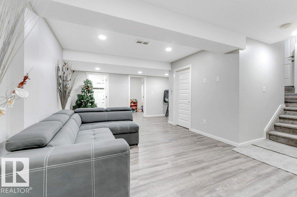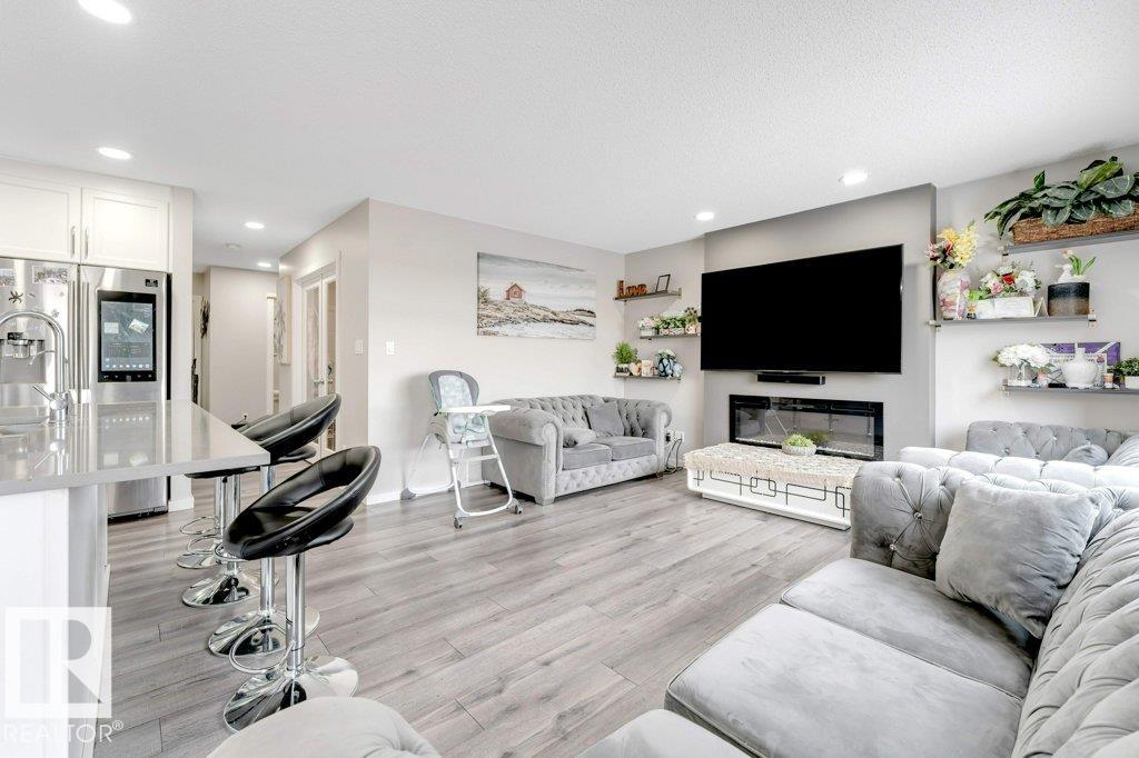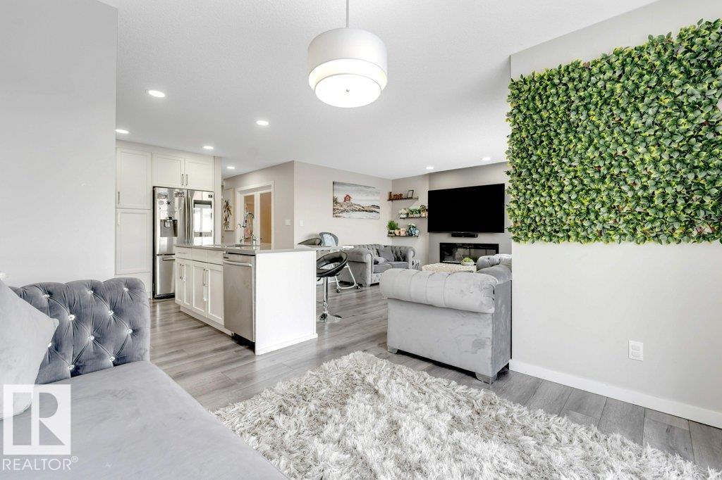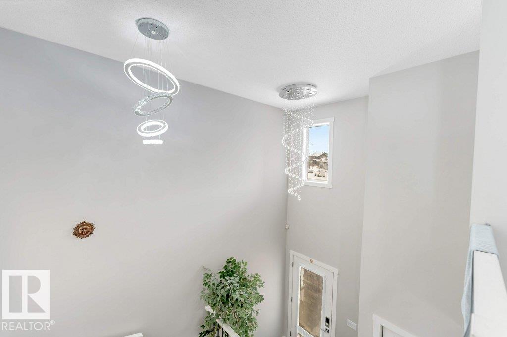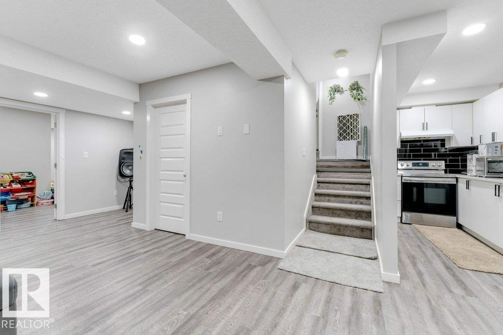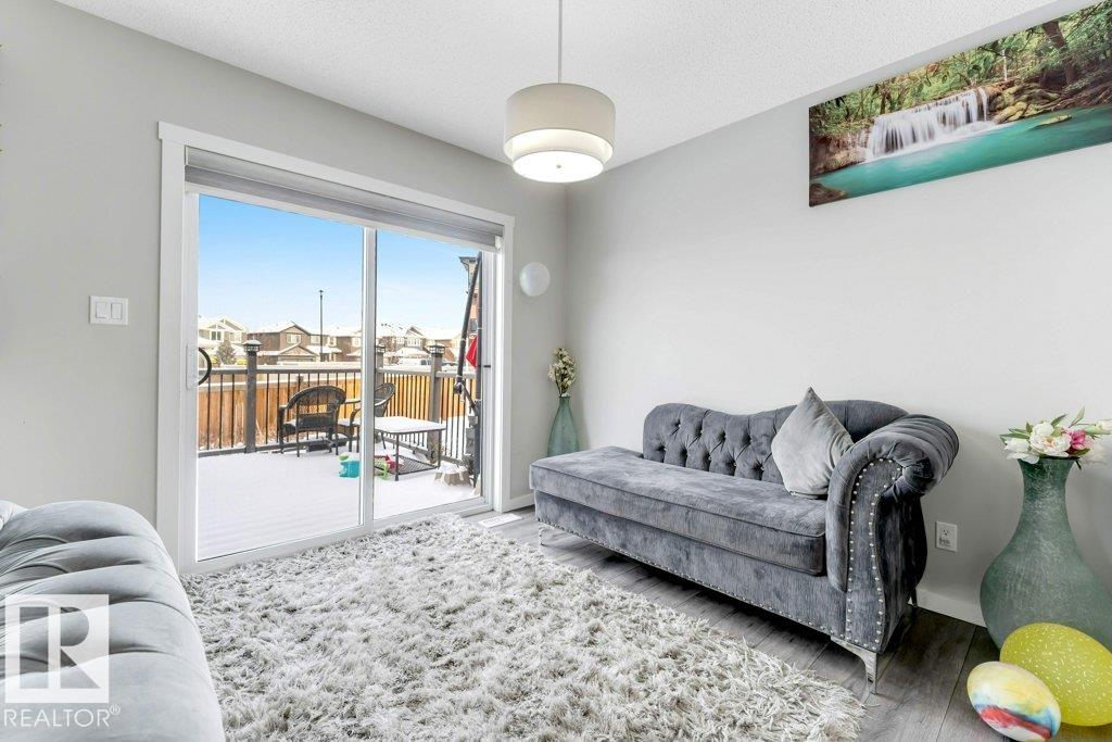 **FULLY FINISHED BASEMENT WITH SECOND KITCHEN **OPEN TO BELOW**SIDE ENTRANCE FOR BASEMENT**Welcome to this elegant 1,819 sq. ft. luxury duplex on a rare pie-shaped lot, offering style, space, and versatility. The open-to-below entry features soaring ceilings and a convenient powder room. The main floor includes a private den, a spacious living room with a modern electric fireplace, and a beautifully designed kitchen with quartz countertops, stainless steel appliances, ample cabinetry, and main-floor laundry. Upstairs, enjoy a serene primary suite with a spa-inspired ensuite and walk-in closet, plus two generous bedrooms and a large bonus room ideal for entertaining. The fully finished basement offers a separate entrance, second kitchen, living area, full bedroom, and full bath--perfect for guests or extended family. Fully landscaped, fenced, and complete with a composite deck, this home is the perfect blend of luxury and comfort.