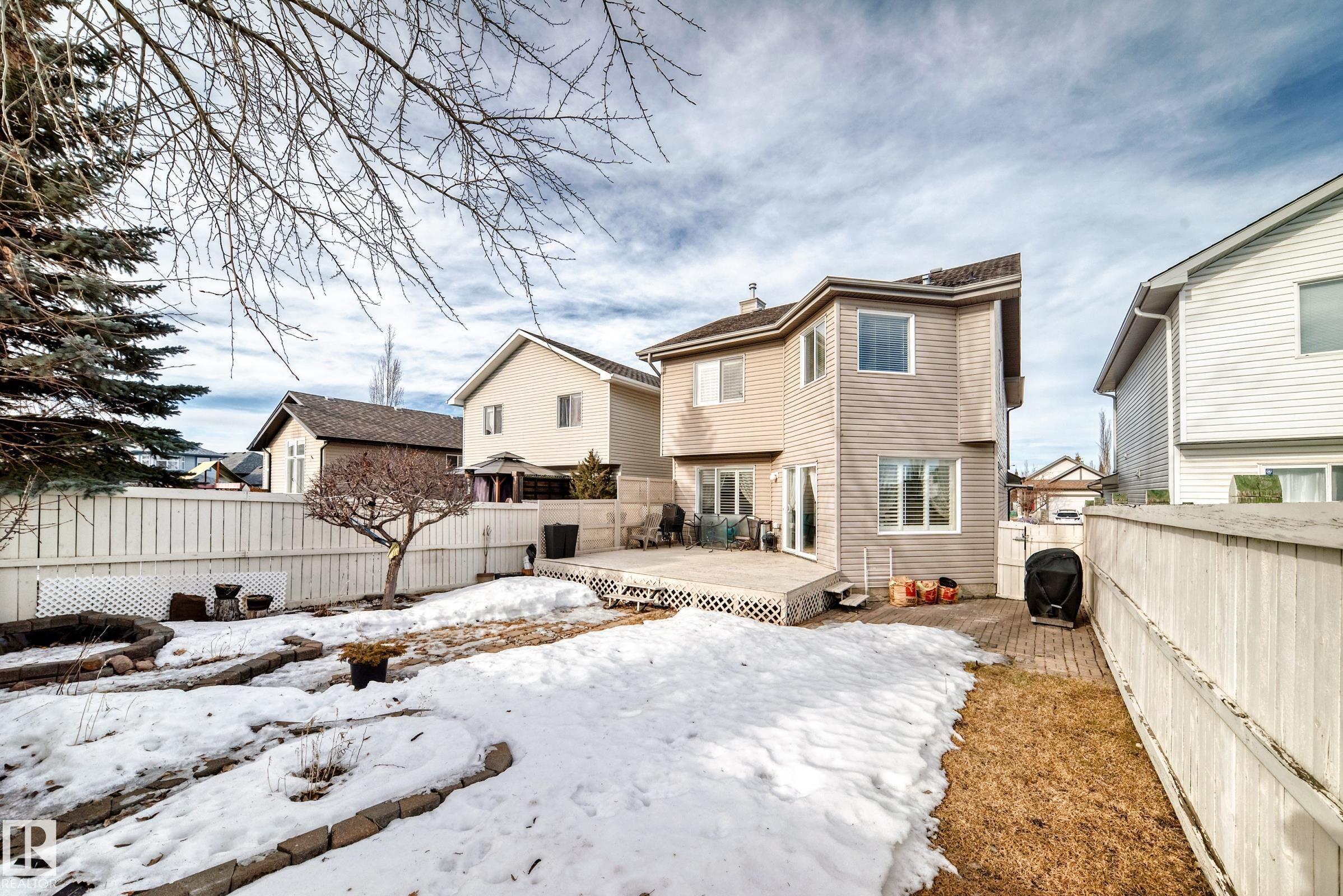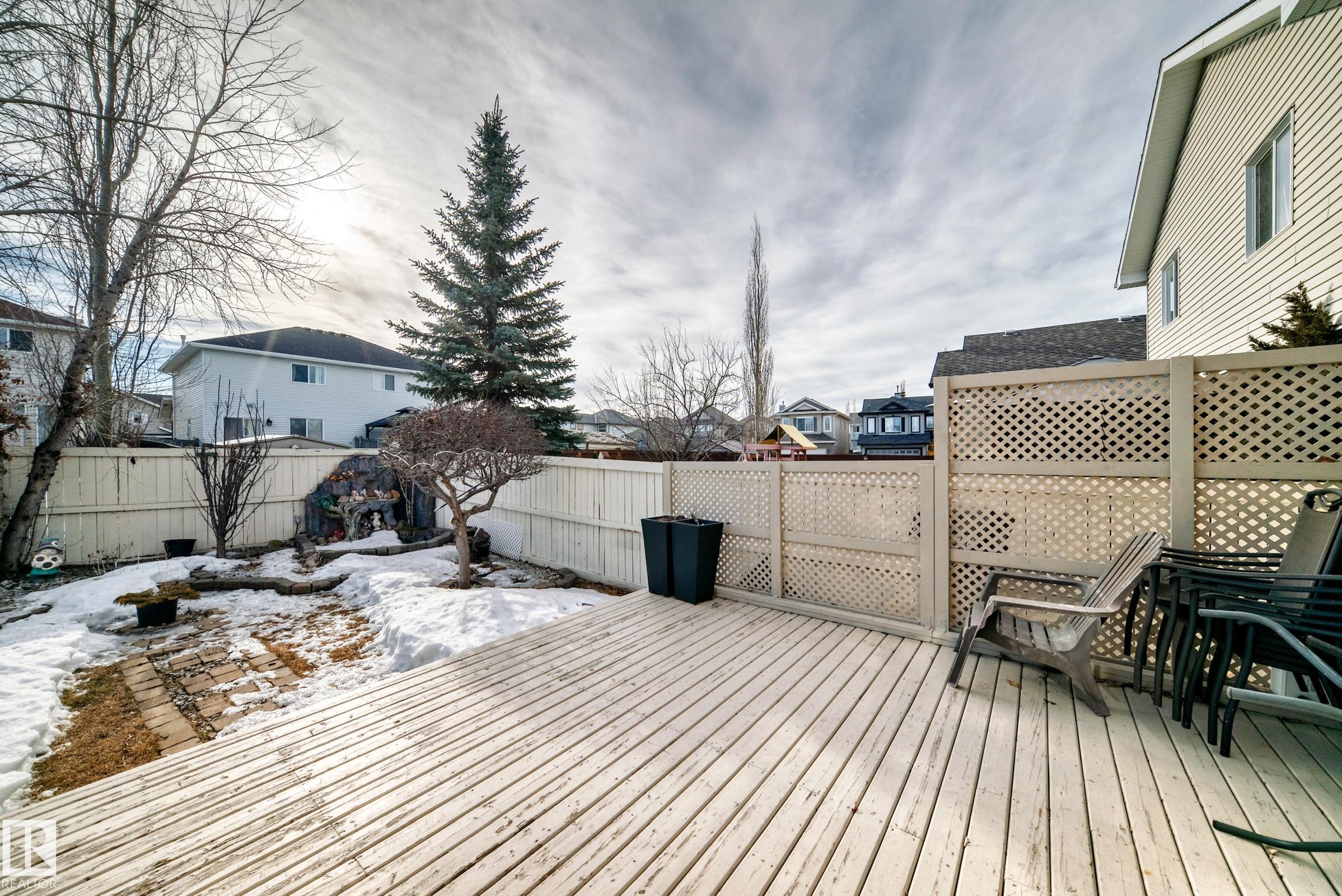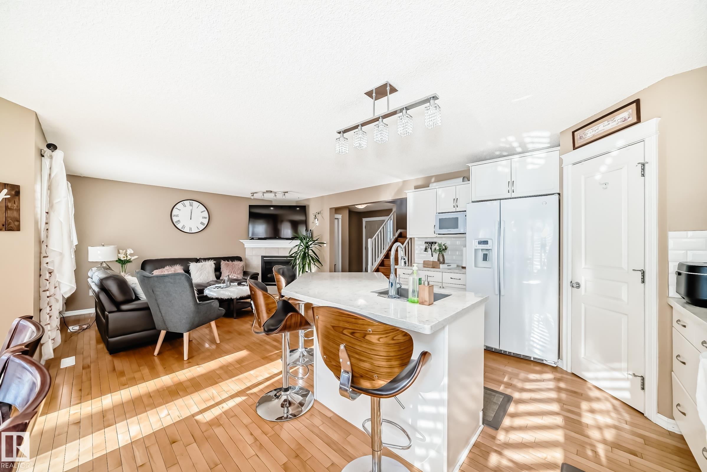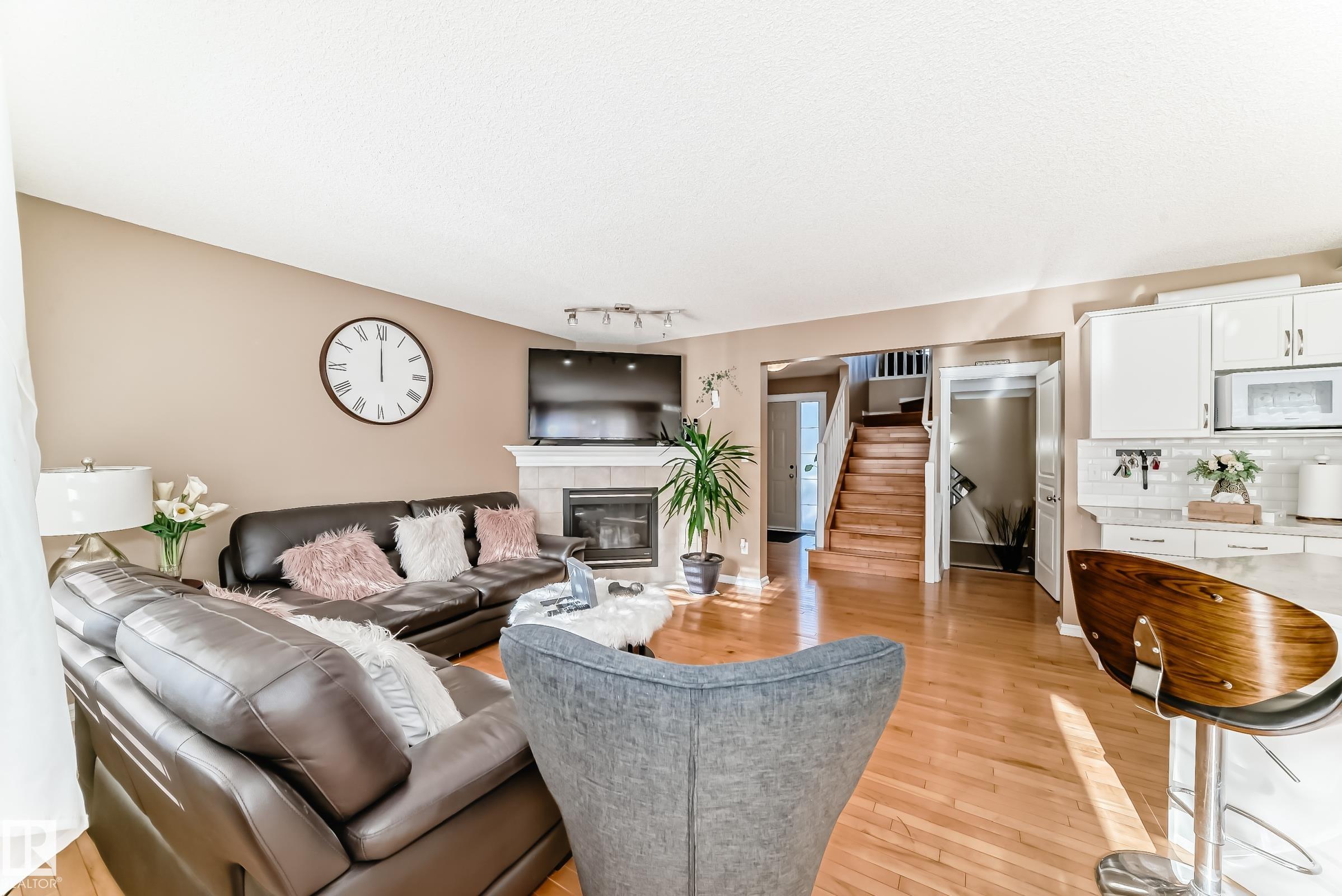 Immaculate family home in Lakeland Ridge featuring 4 bedrooms, 3.5 baths and a sunny SOUTH-facing backyard. Bright main floor offers upgraded hardwood, a spacious kitchen with white cabinets, corner pantry, Quartz counters and island overlooking the dining/living room with corner fireplace. The property comes with a laminate and hardwood throughout, a large bonus room, primary suite with walk-in closet and soaker tub, plus two generous bedrooms and 4pc bath. Finished basement adds a rec room and a 4th bedroom option, full bath and great storage. Enjoy the beautifully landscaped south yard with deck, stone patio and pond. Steps to parks, trails and more.