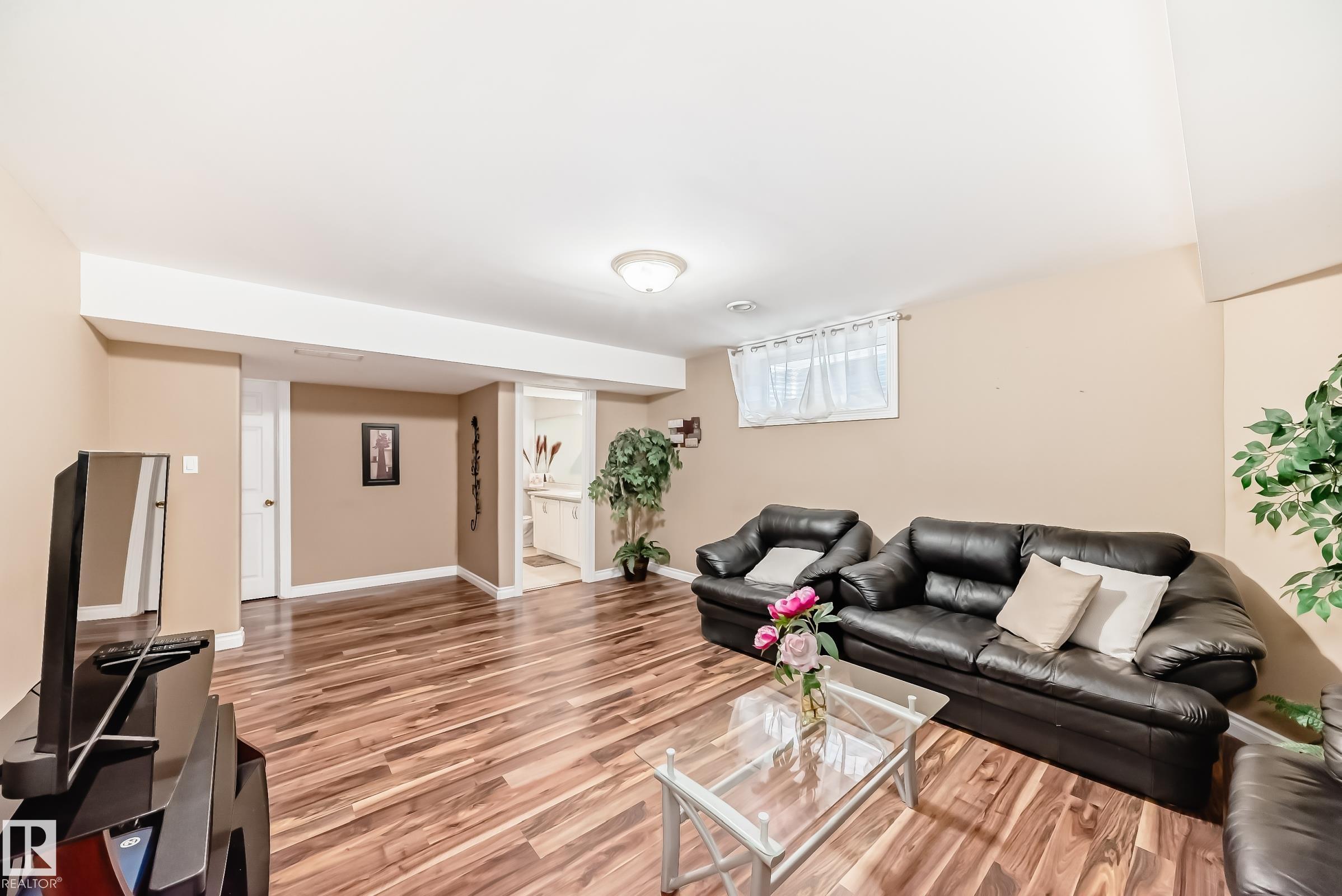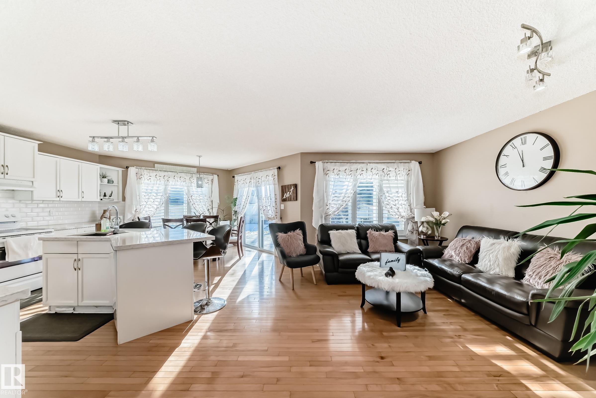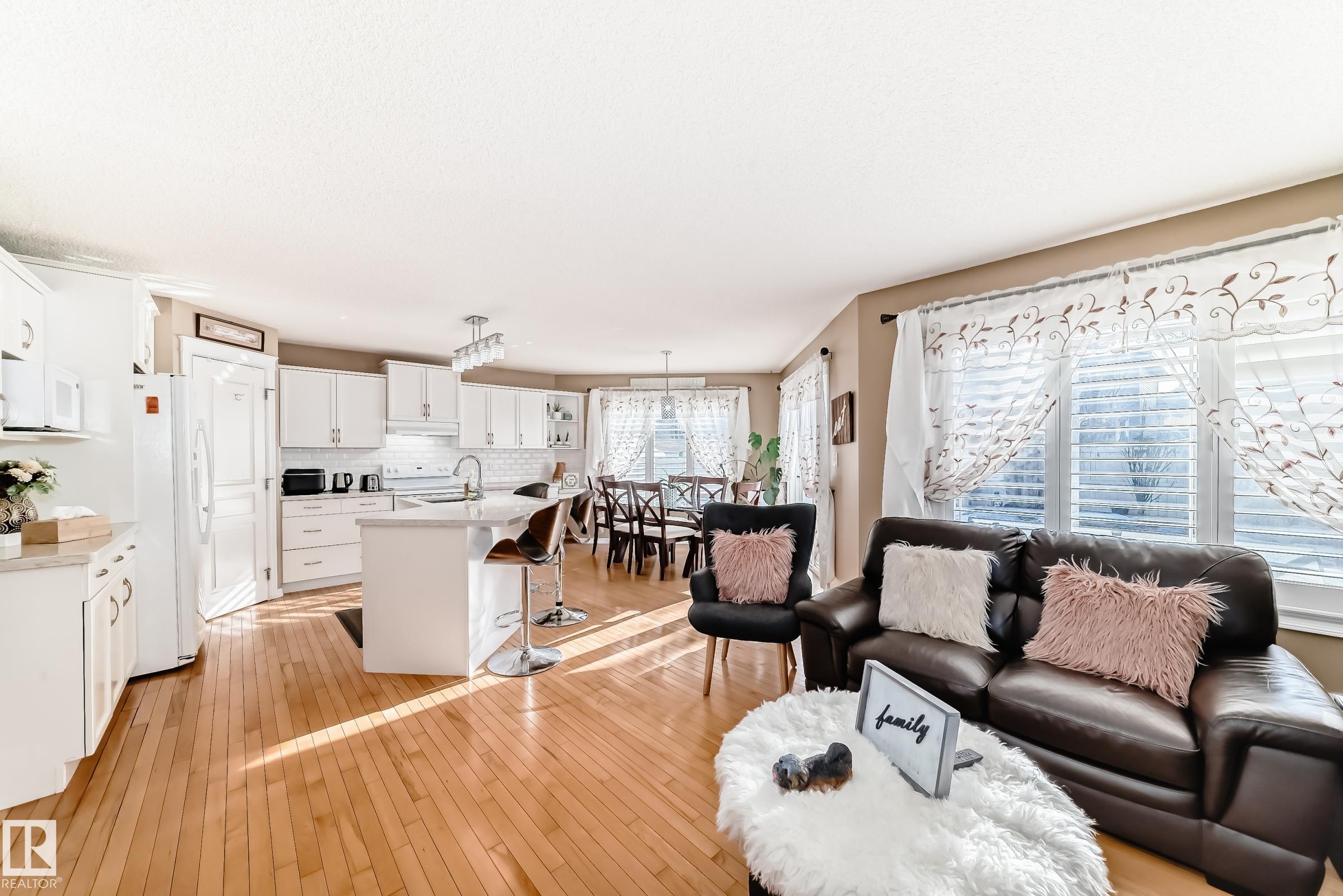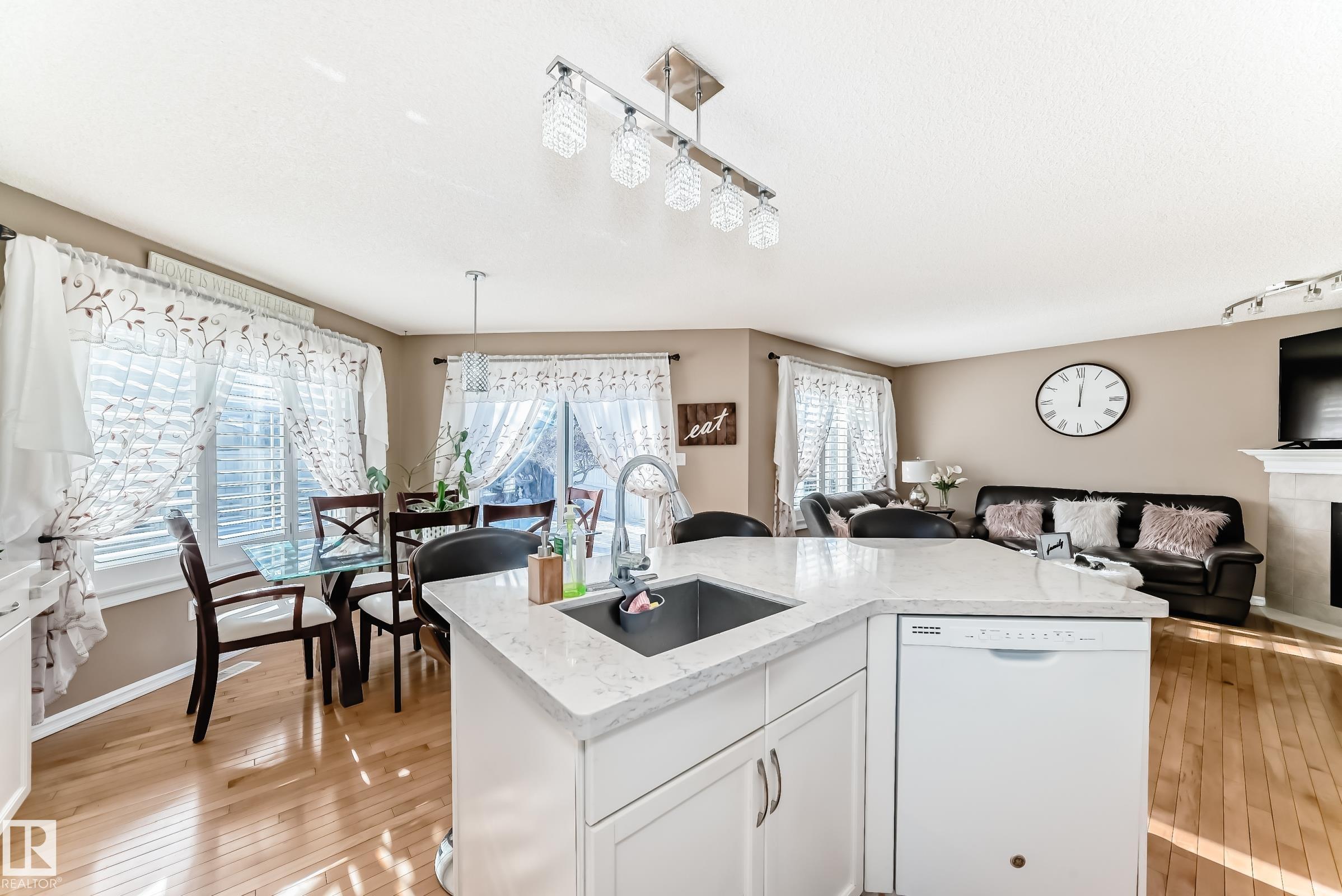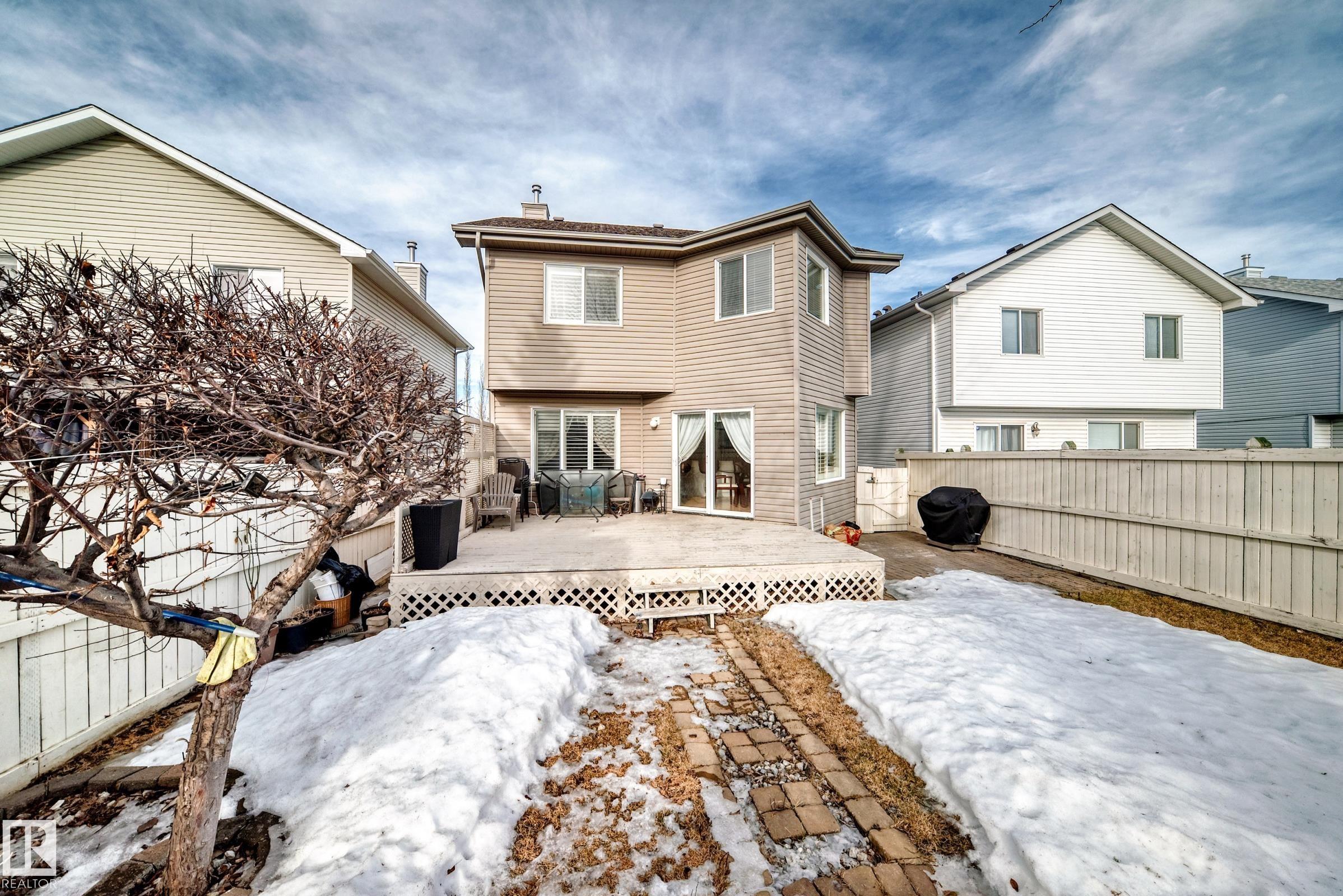 Immaculate family home in Lakeland Ridge featuring 4 bedrooms, 3.5 baths and a sunny SOUTH-facing backyard. Bright main floor offers upgraded hardwood, a spacious kitchen with white cabinets, corner pantry, Quartz counters and island overlooking the dining/living room with corner fireplace. The property comes with a laminate and hardwood throughout, a large bonus room, primary suite with walk-in closet and soaker tub, plus two generous bedrooms and 4pc bath. Finished basement adds a rec room and a 4th bedroom option, full bath and great storage. Enjoy the beautifully landscaped south yard with deck, stone patio and pond. Steps to parks, trails and more.