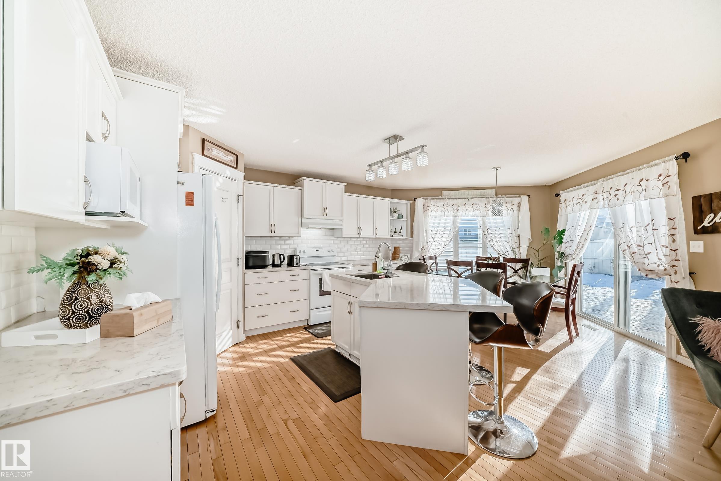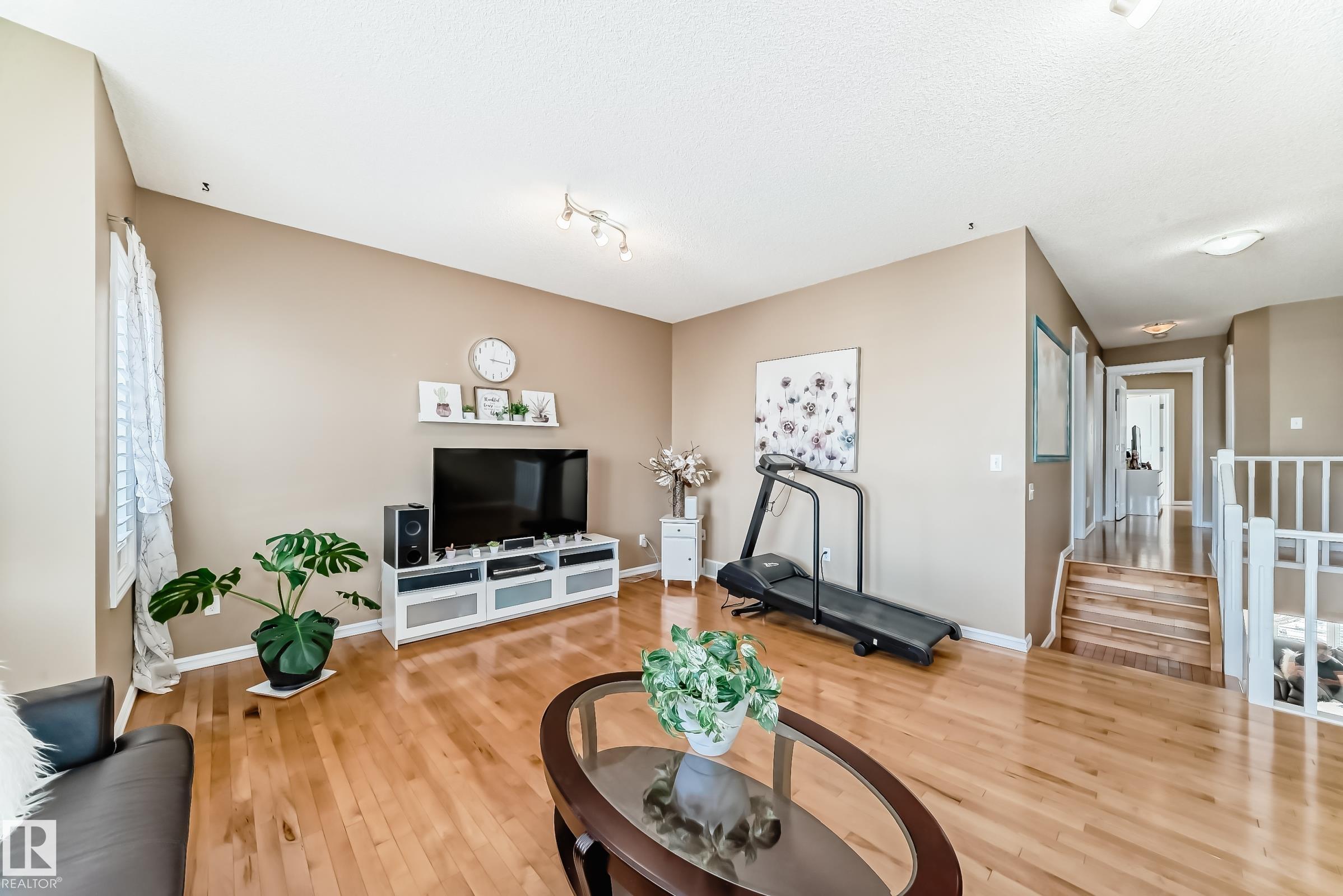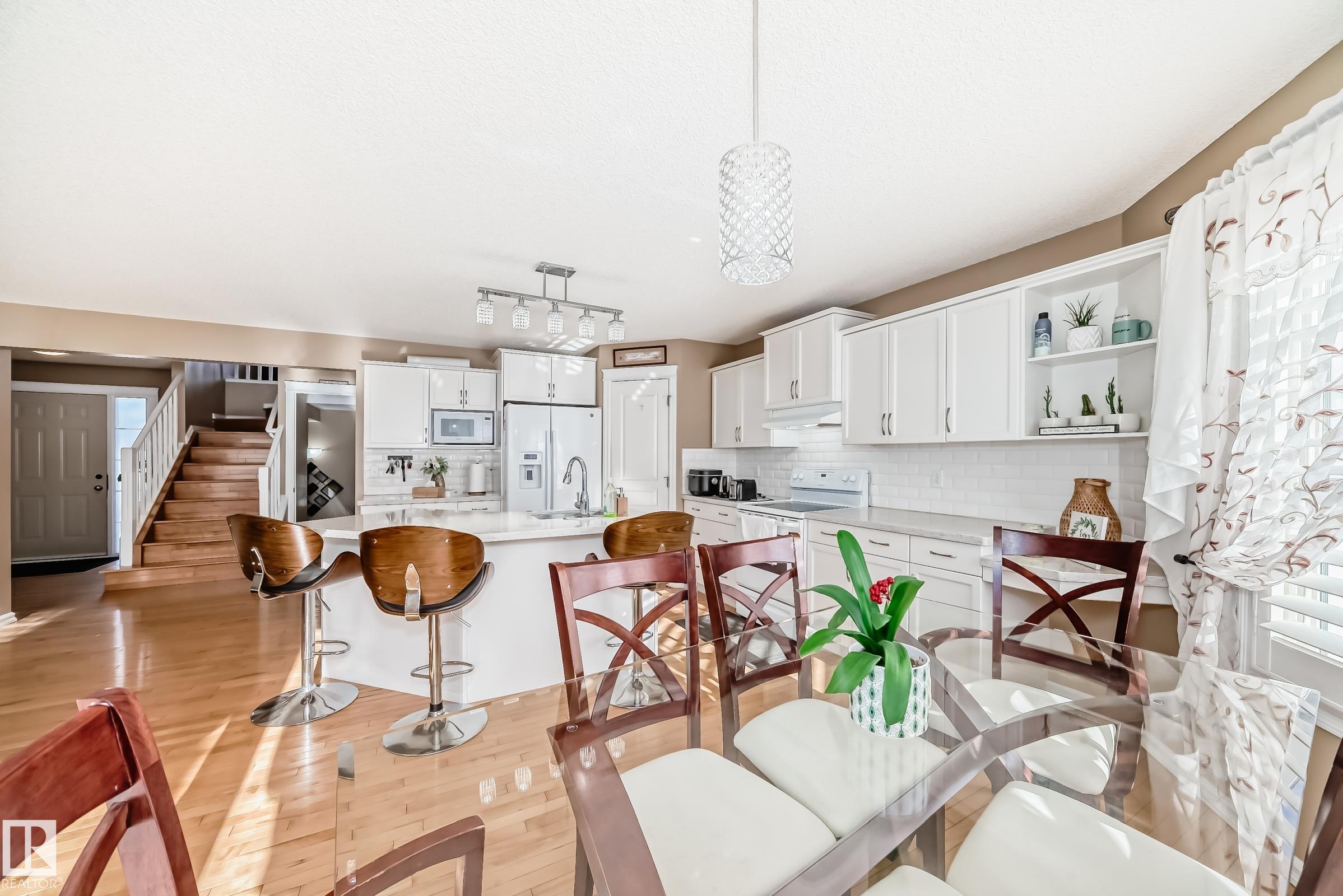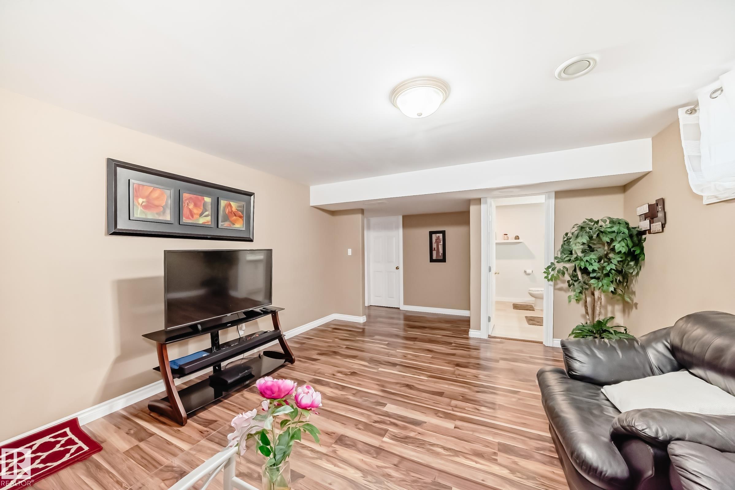 Immaculate family home in Lakeland Ridge featuring 4 bedrooms, 3.5 baths and a sunny SOUTH-facing backyard. Bright main floor offers upgraded hardwood, a spacious kitchen with white cabinets, corner pantry, Quartz counters and island overlooking the dining/living room with corner fireplace. The property comes with a laminate and hardwood throughout, a large bonus room, primary suite with walk-in closet and soaker tub, plus two generous bedrooms and 4pc bath. Finished basement adds a rec room and a 4th bedroom option, full bath and great storage. Enjoy the beautifully landscaped south yard with deck, stone patio and pond. Steps to parks, trails and more.