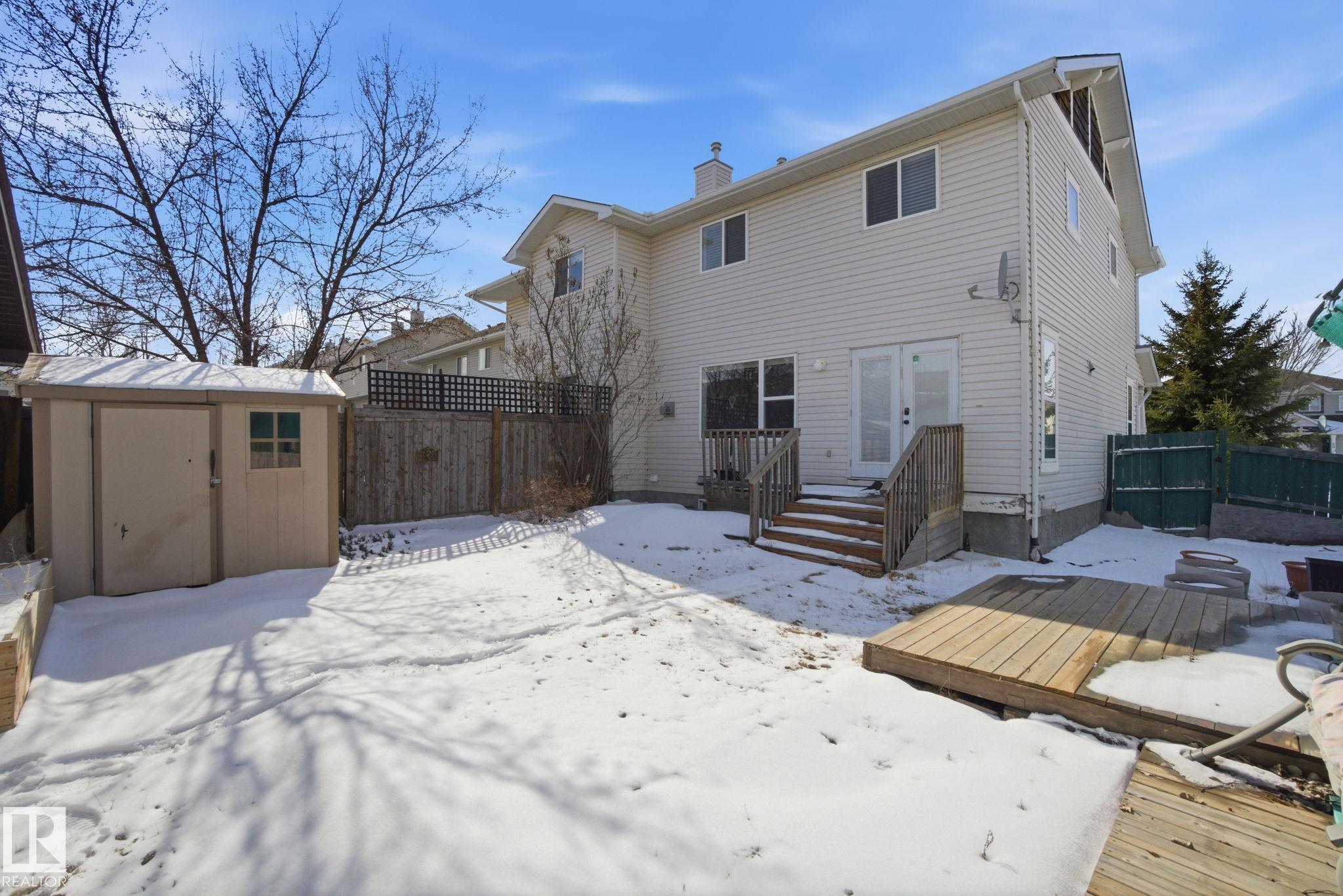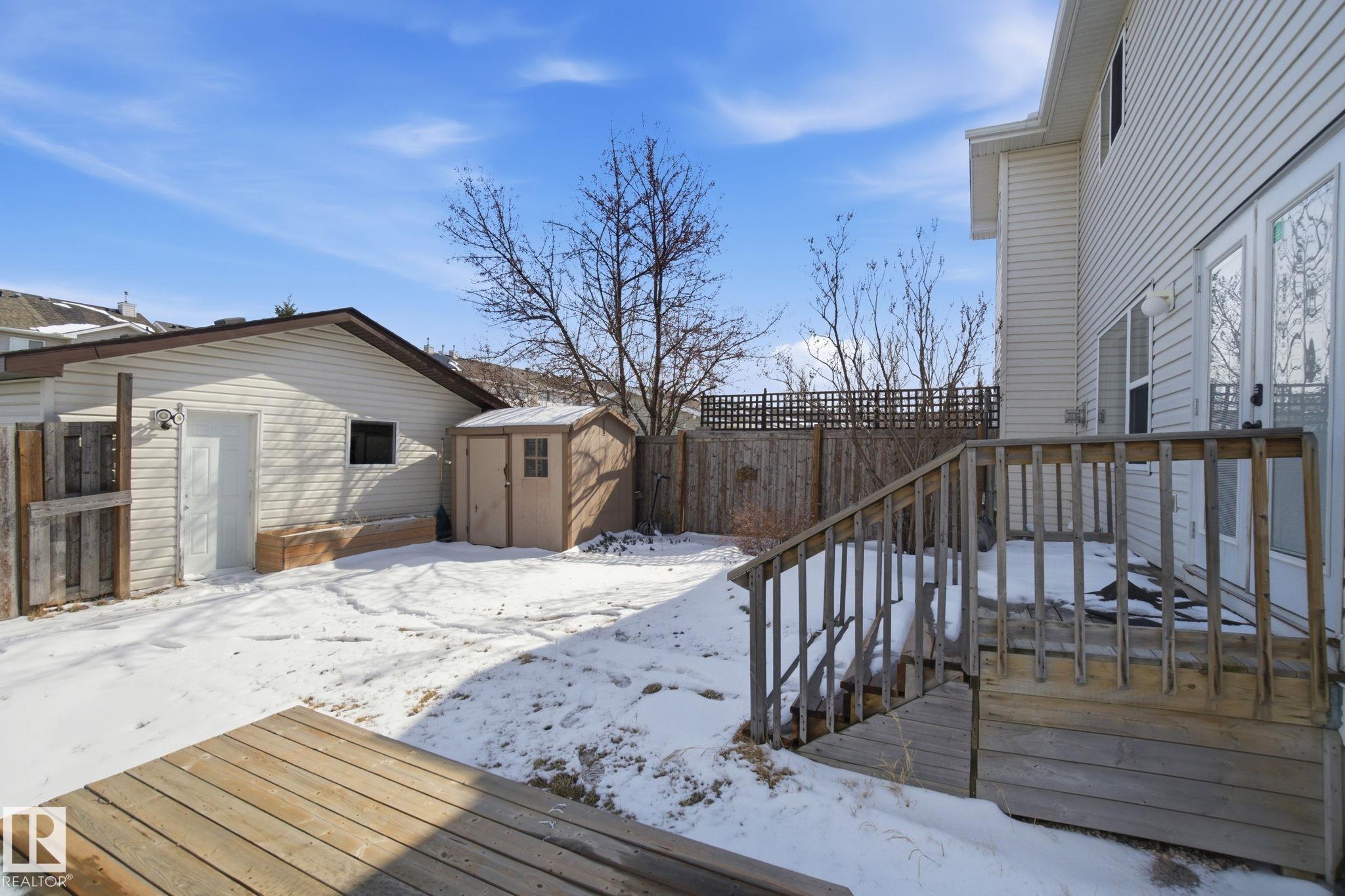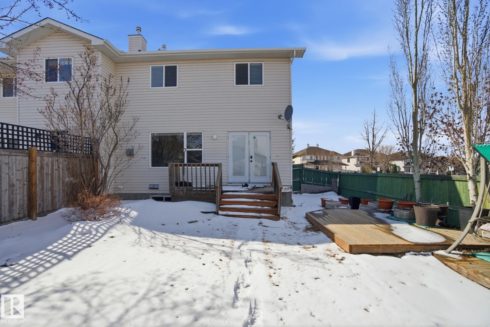 Perfect First Home, lcoated on a corner lot next to Trillium School, in Lakeland Ridge! Fully finished 2-storey half-duplex in a family-friendly neighborhood. Bright and inviting with a smart floor plan featuring a spacious living room with corner gas fireplace, adjoining dining nook, laminate flooring.The modern kitchen includes stainless steel appliances, glass tile backsplash, and island with an eating bar. Garden doors open to a two-tiered deck and private backyard--perfect for relaxing or entertaining. Main floor flex room ideal for a home office, plus a convenient 2-piece bathroom. Upstairs, find three bedrooms, a full 4-piece bath, and a primary suite with 4-piece ensuite. The basement adds a rec room, den ( with potential for 4th bedroom) 3-piece bathroom, laundry, and plenty of storage. Complete with double detached garage, extra parking pad, landscaped, and charming front verandah. Fantastic location, steps from Lakeland Ridge School, parks, playgrounds, shopping, and transit.
