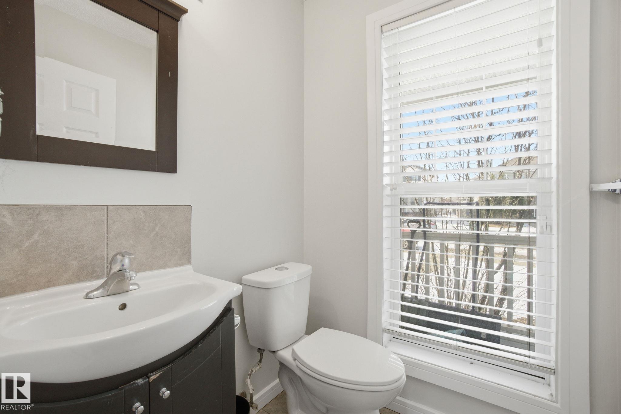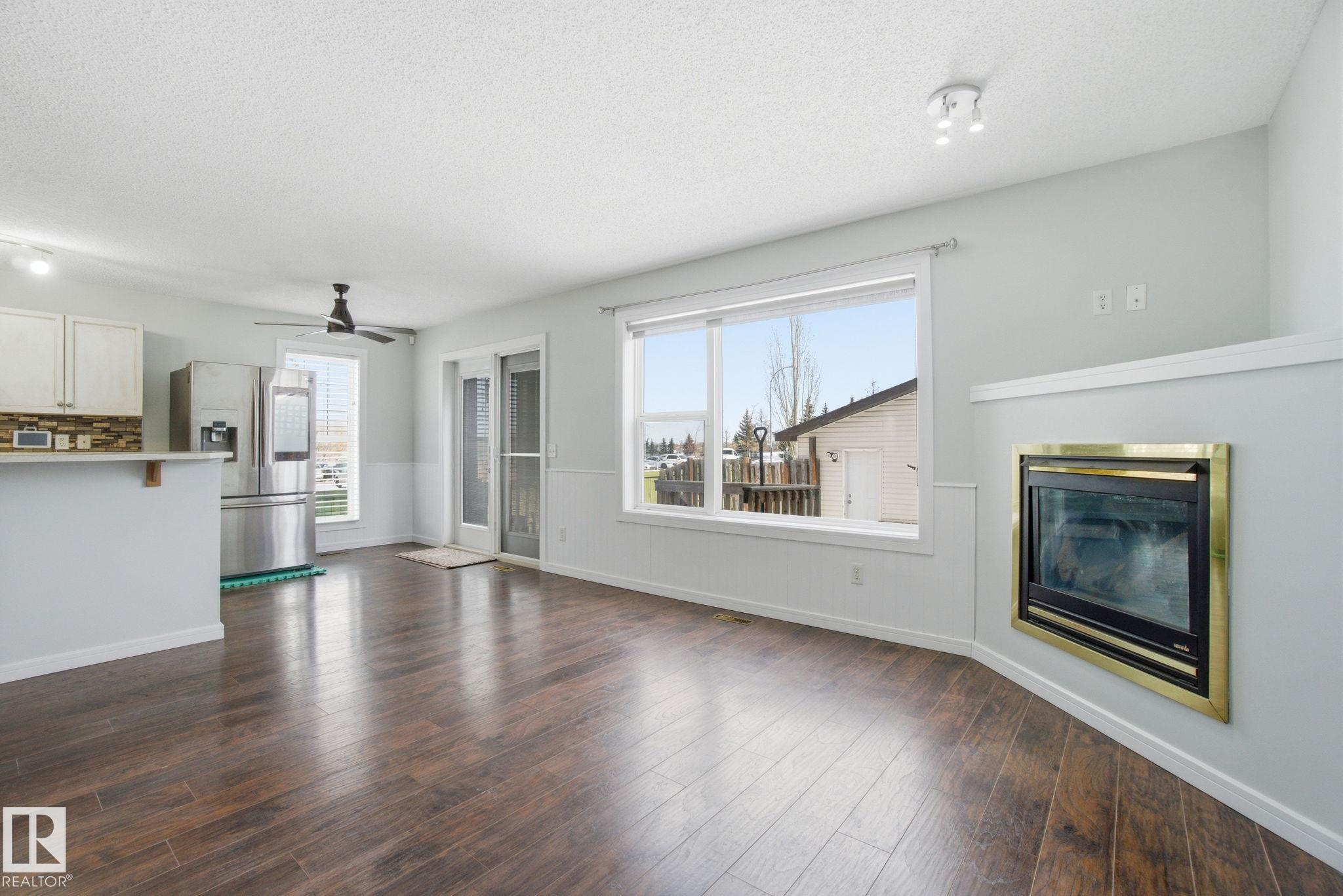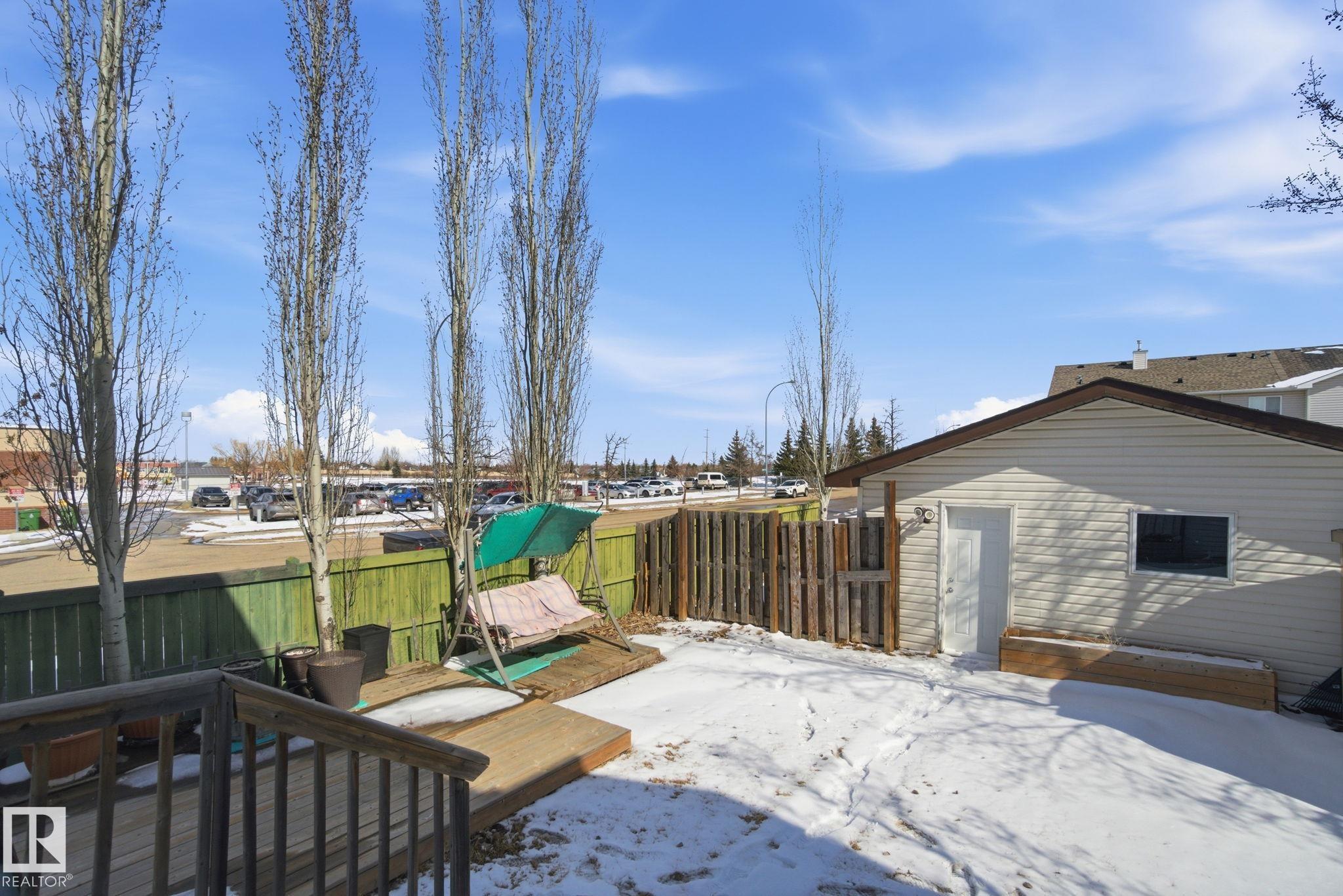 Perfect First Home, lcoated on a corner lot next to Trillium School, in Lakeland Ridge! Fully finished 2-storey half-duplex in a family-friendly neighborhood. Bright and inviting with a smart floor plan featuring a spacious living room with corner gas fireplace, adjoining dining nook, laminate flooring.The modern kitchen includes stainless steel appliances, glass tile backsplash, and island with an eating bar. Garden doors open to a two-tiered deck and private backyard--perfect for relaxing or entertaining. Main floor flex room ideal for a home office, plus a convenient 2-piece bathroom. Upstairs, find three bedrooms, a full 4-piece bath, and a primary suite with 4-piece ensuite. The basement adds a rec room, den ( with potential for 4th bedroom) 3-piece bathroom, laundry, and plenty of storage. Complete with double detached garage, extra parking pad, landscaped, and charming front verandah. Fantastic location, steps from Lakeland Ridge School, parks, playgrounds, shopping, and transit.